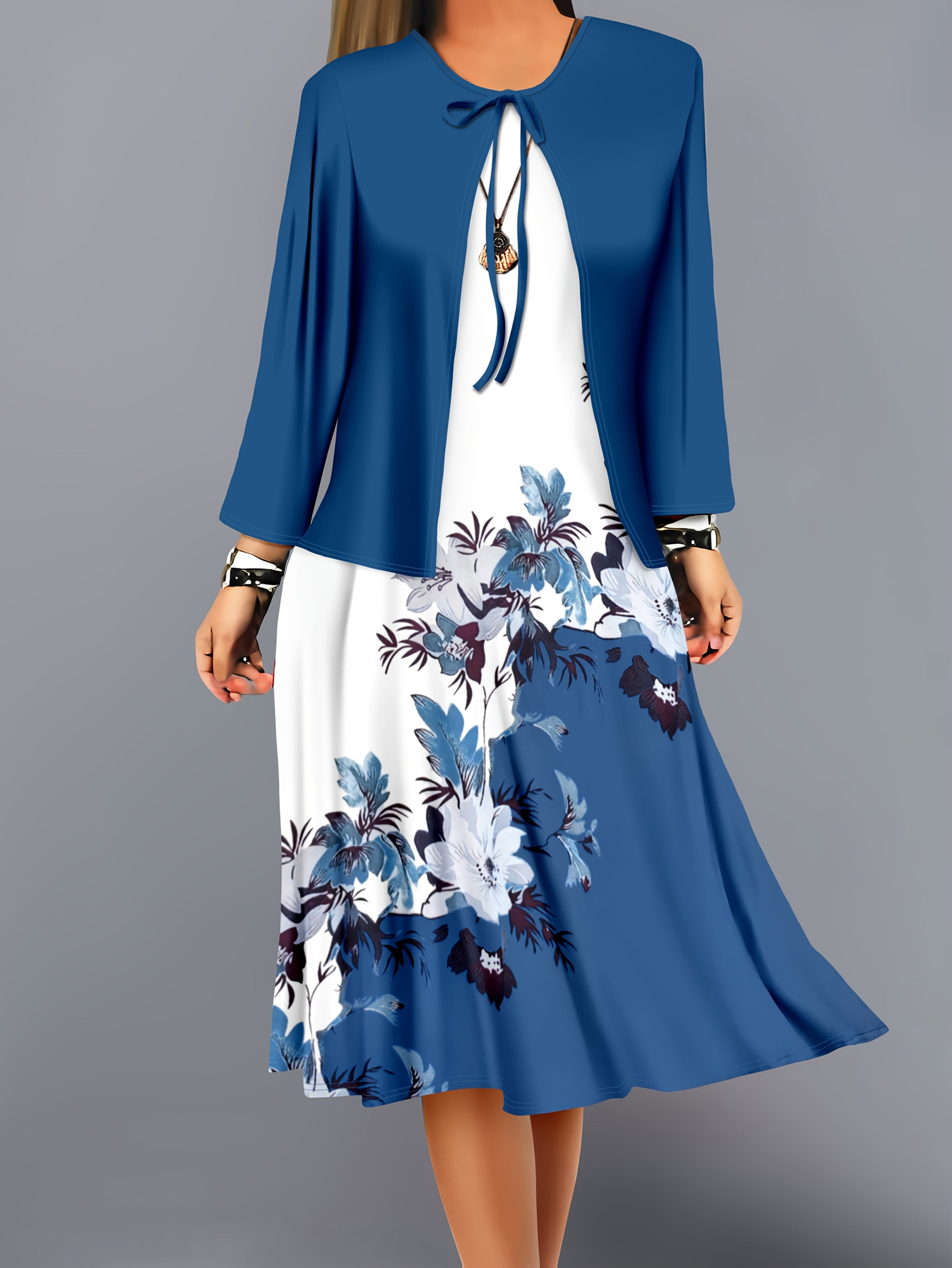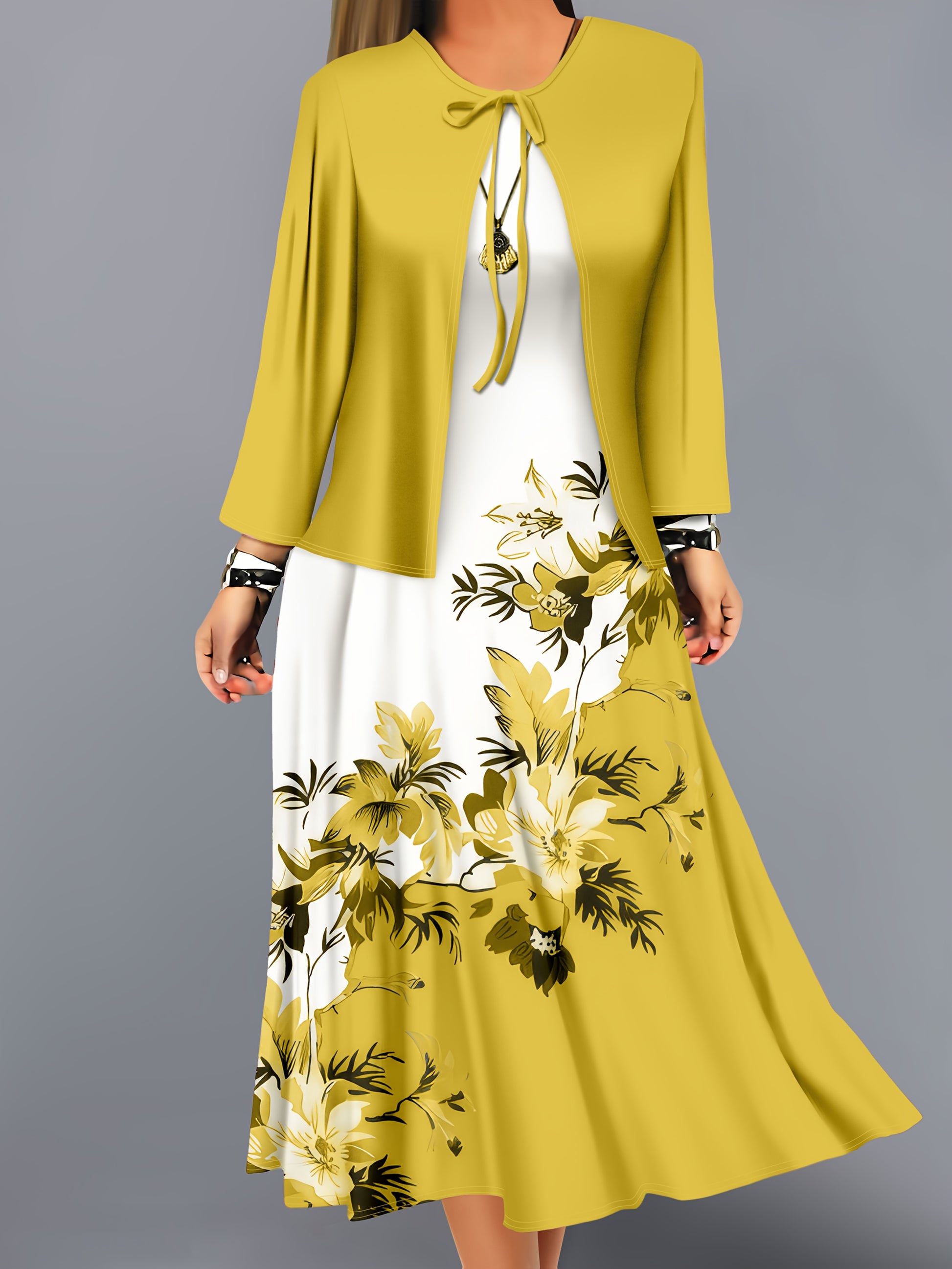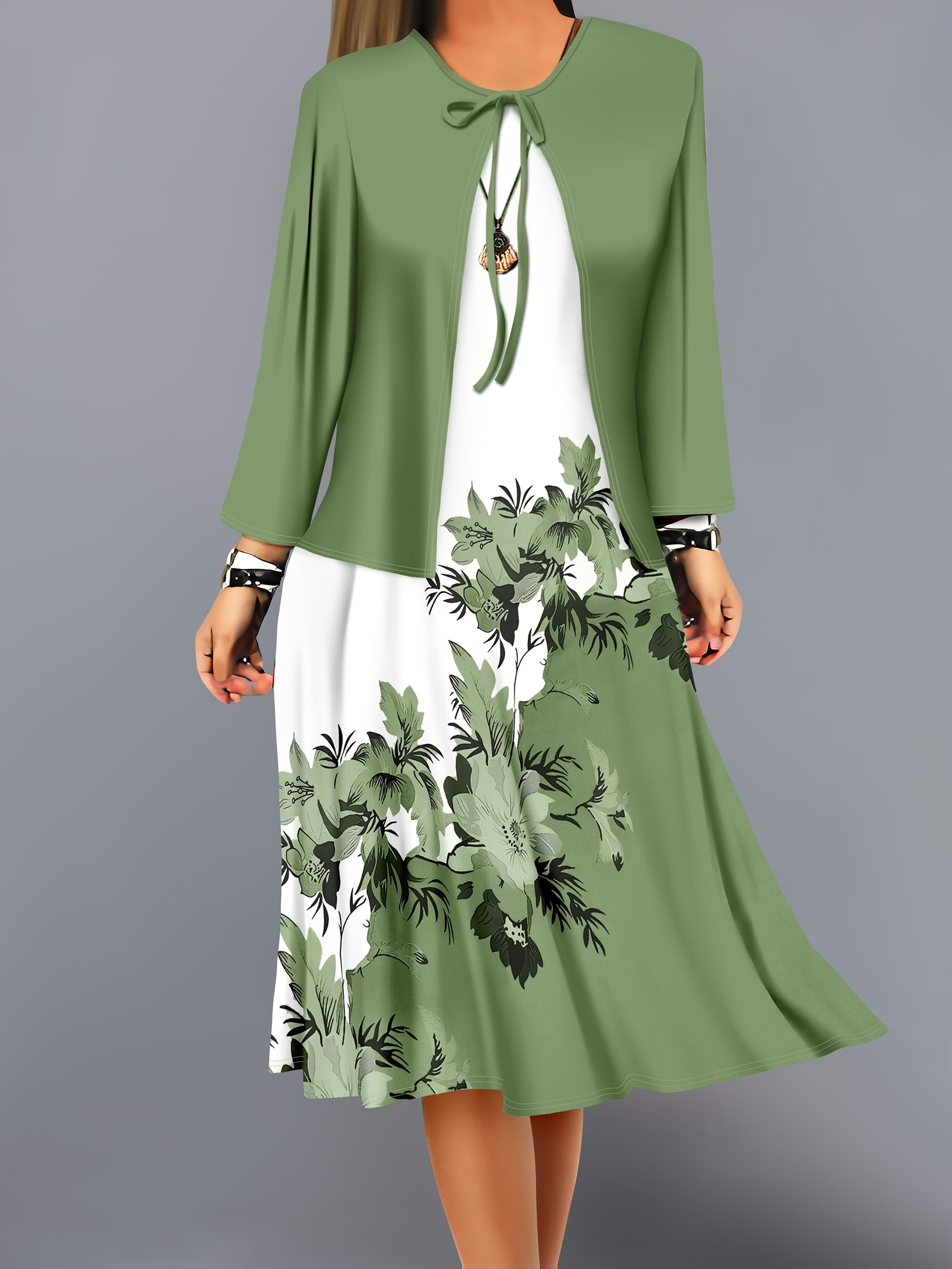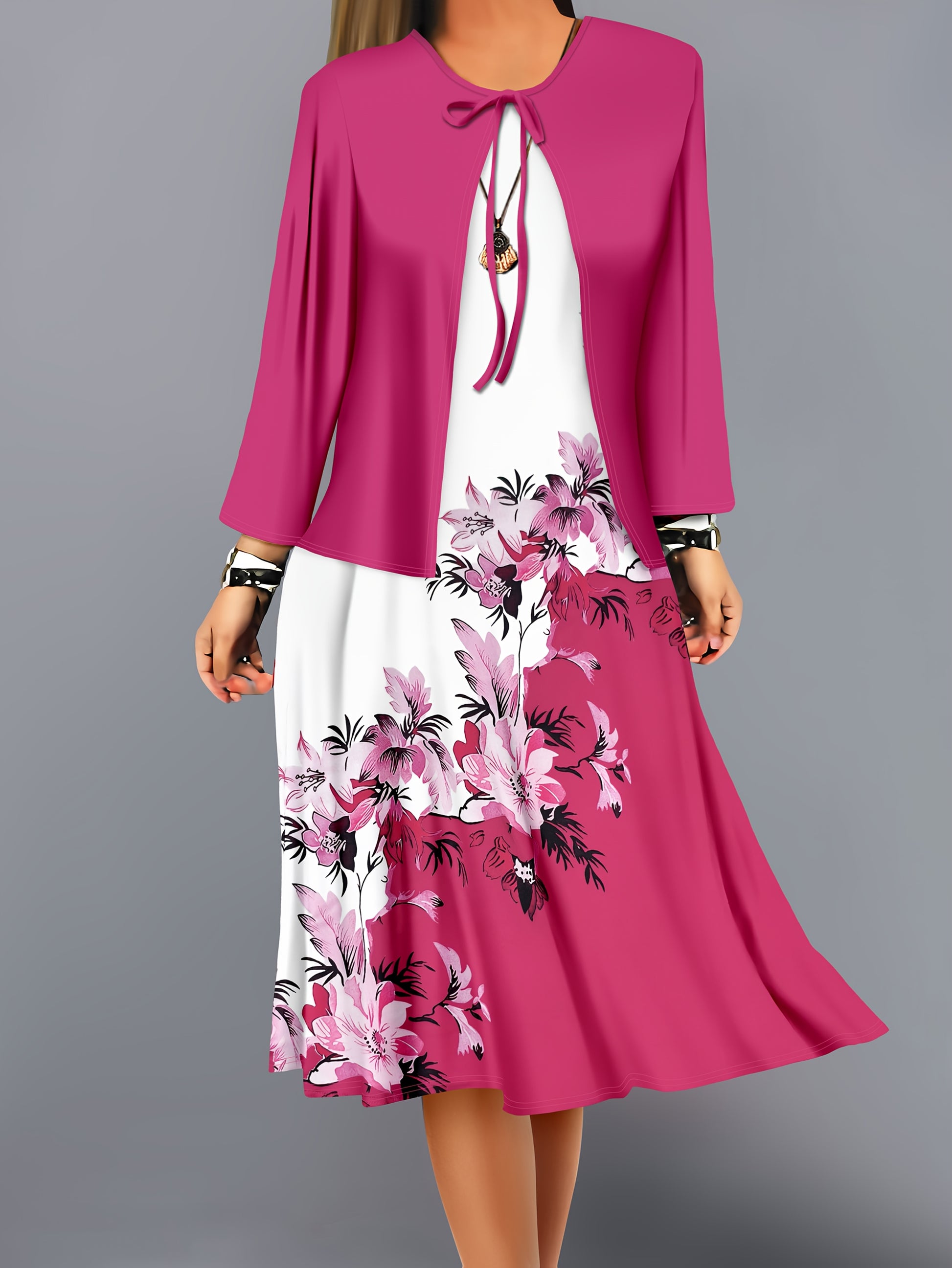 Fashion Women's solid color small cardigan and floral print patchwork dress two-piece set