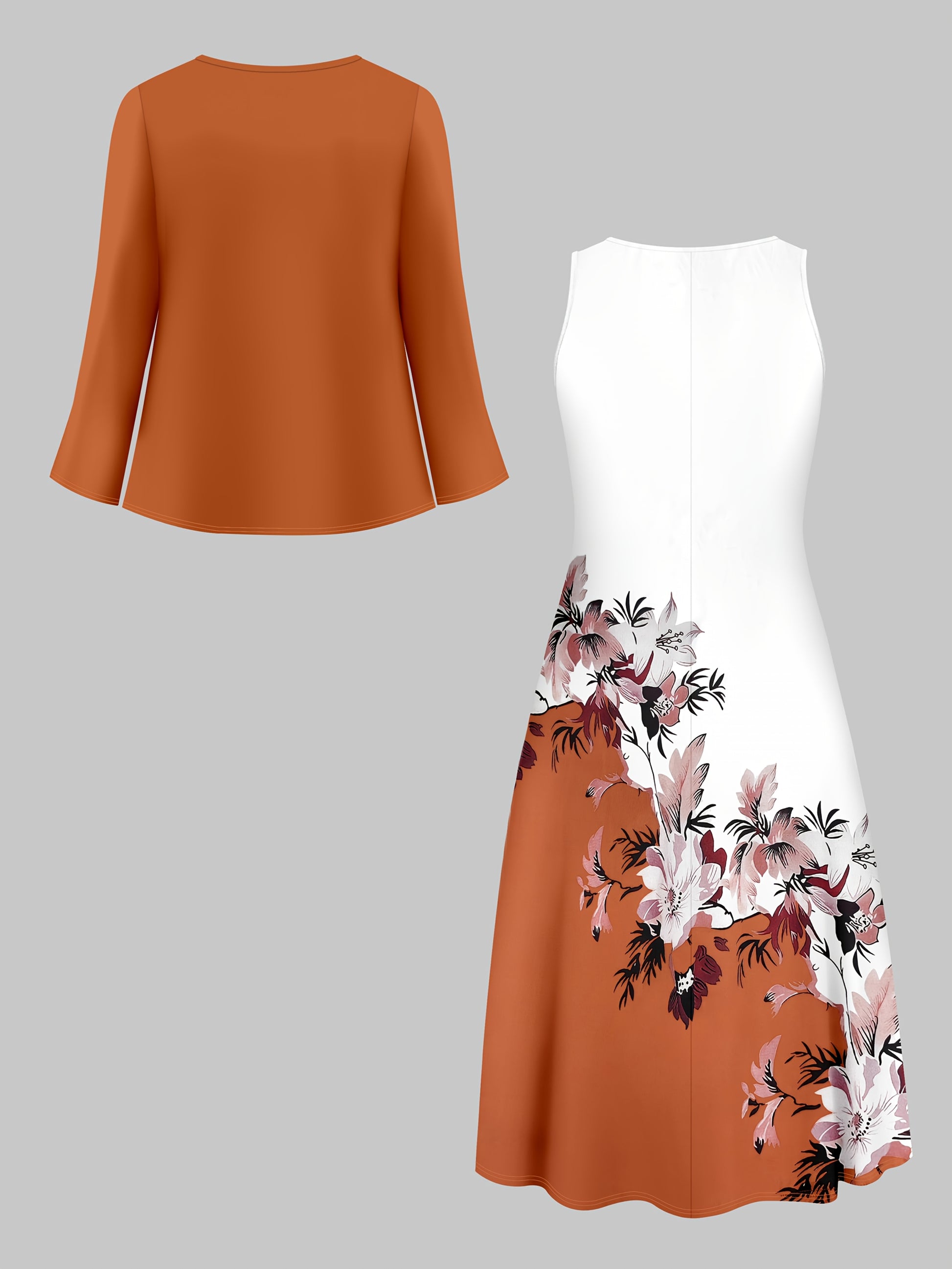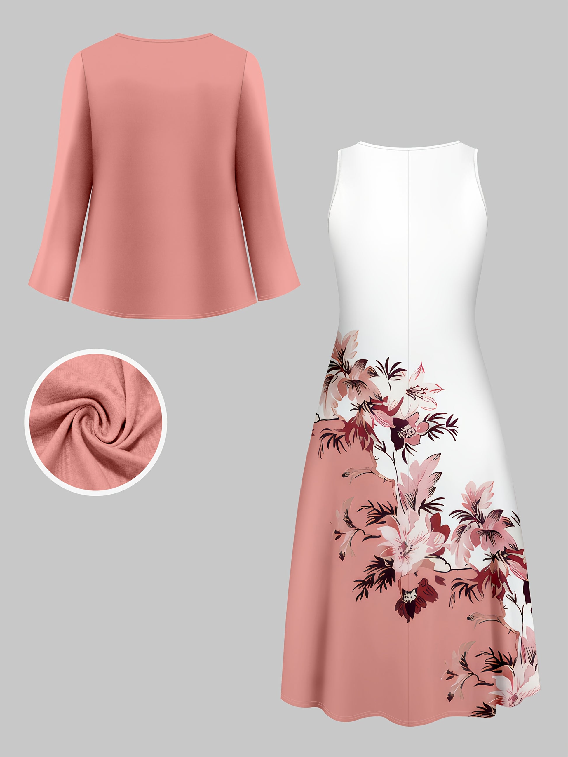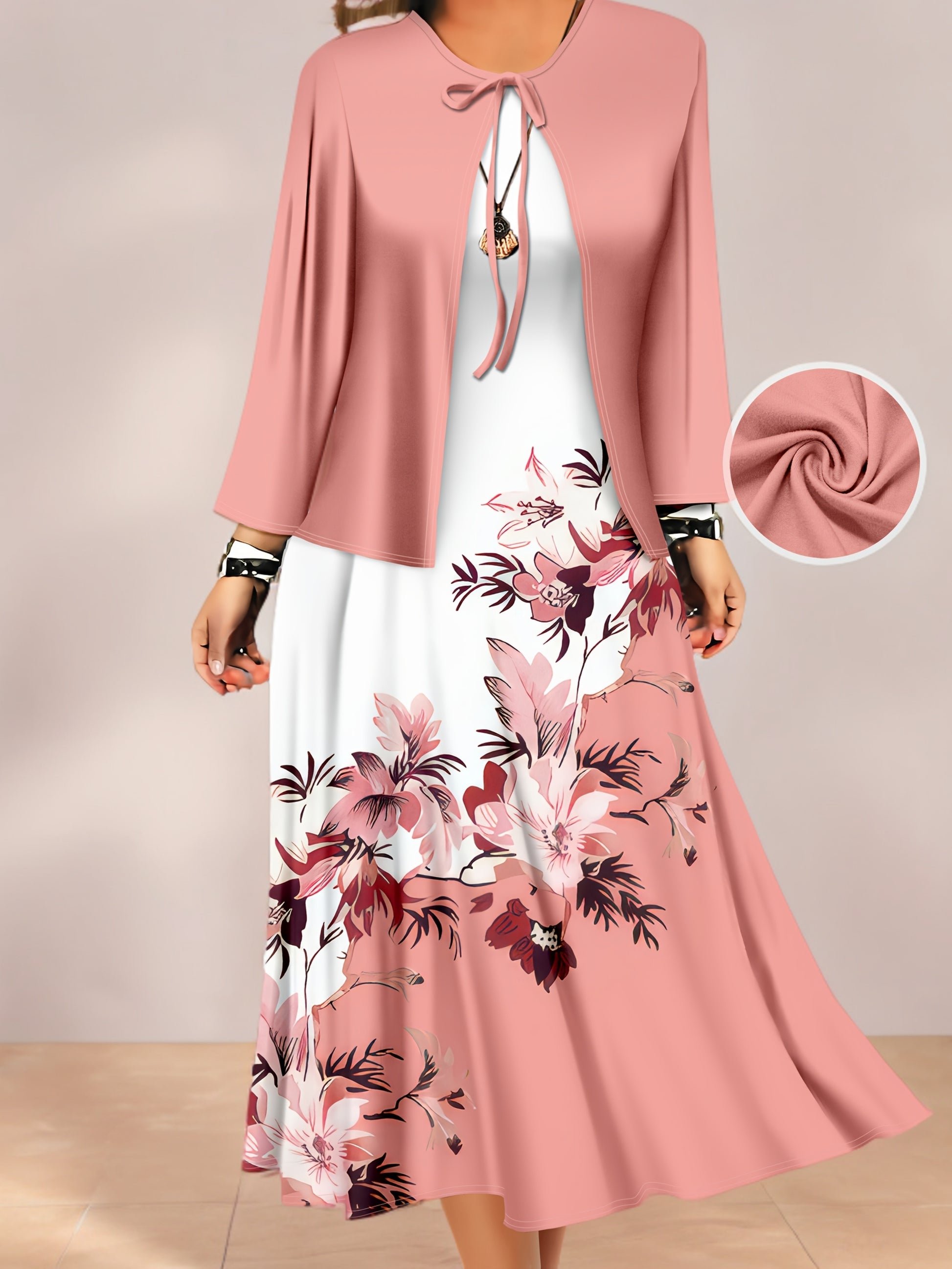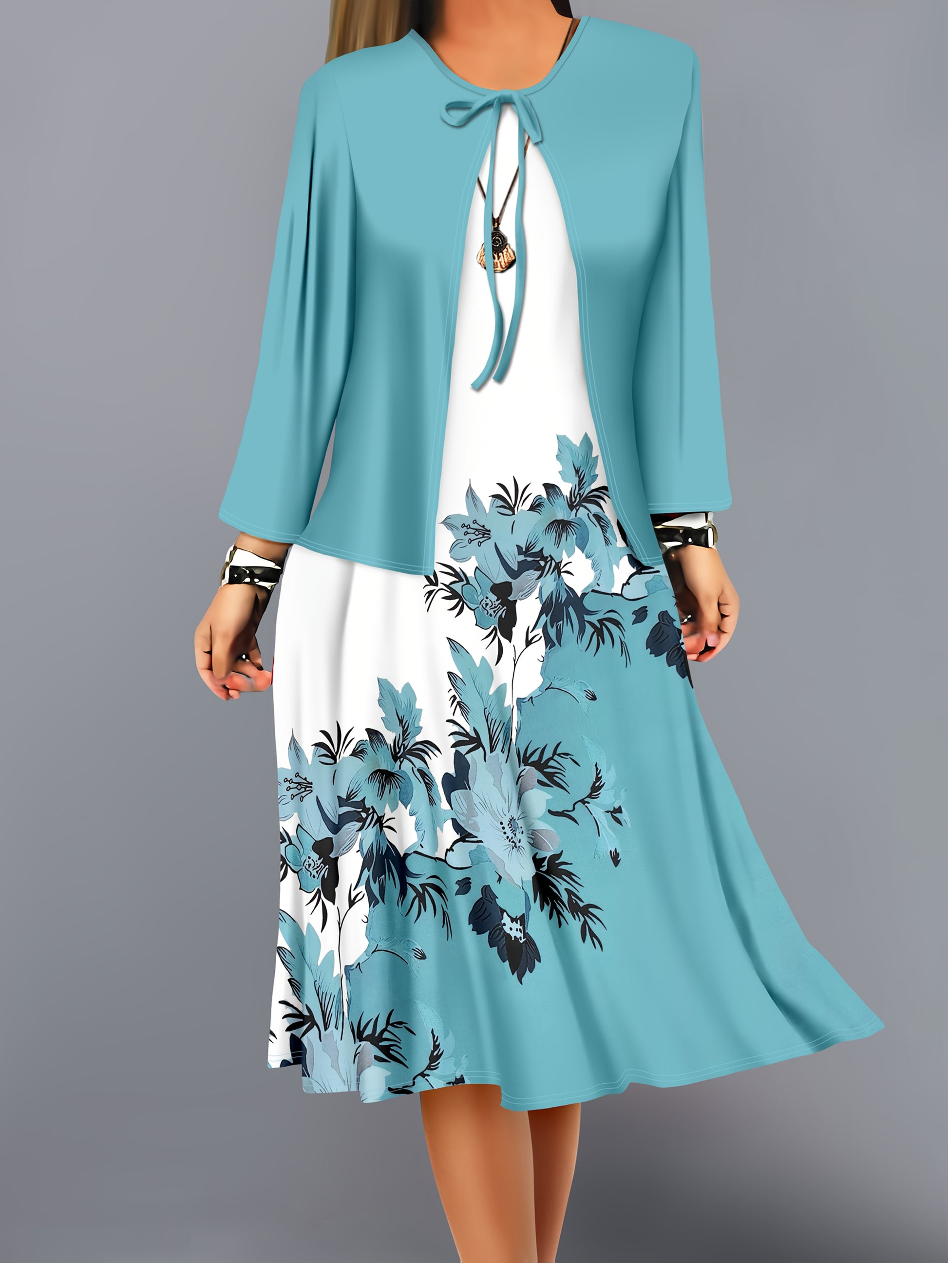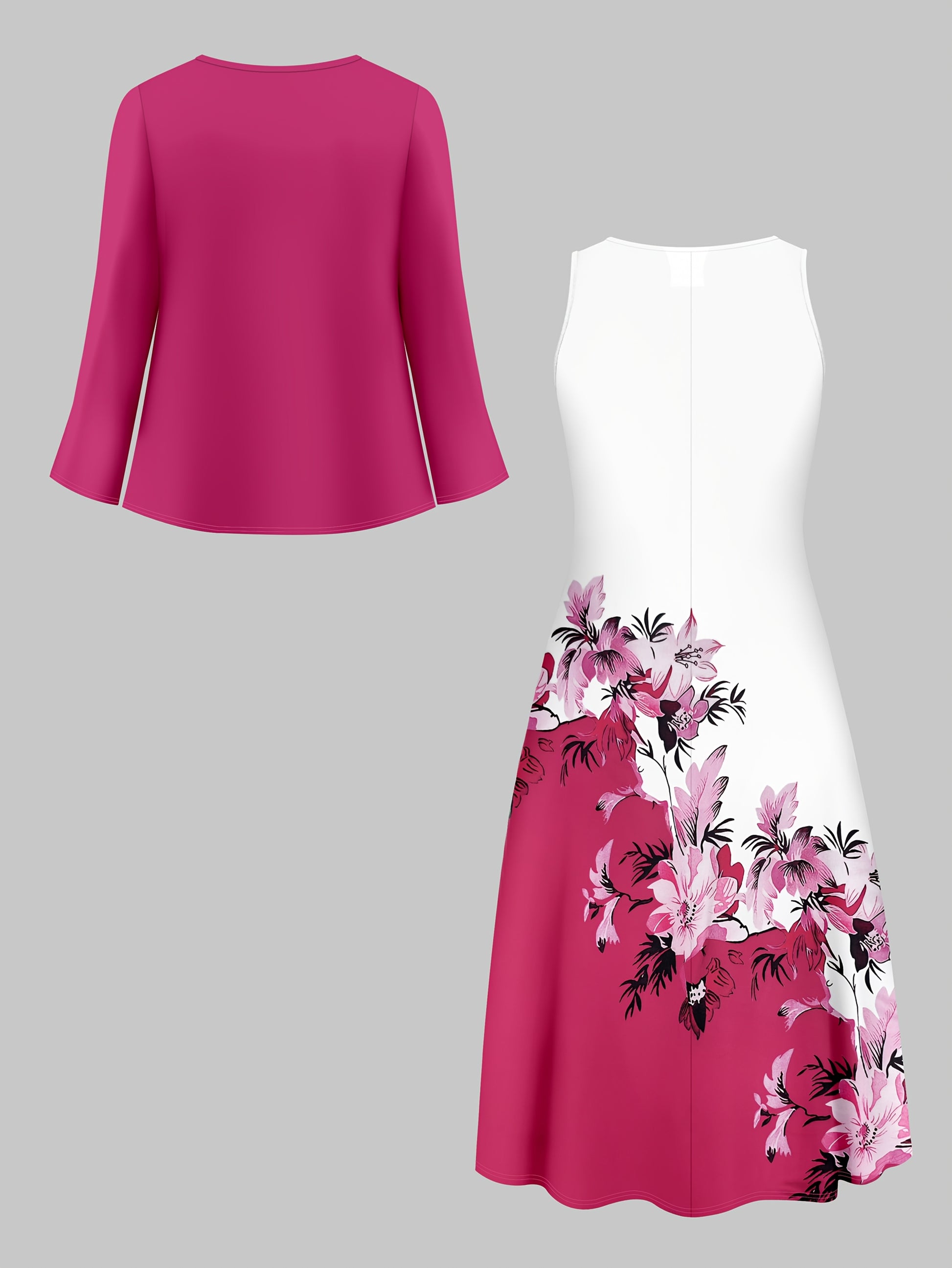 Fashion Women's solid color small cardigan and floral print patchwork dress two-piece set