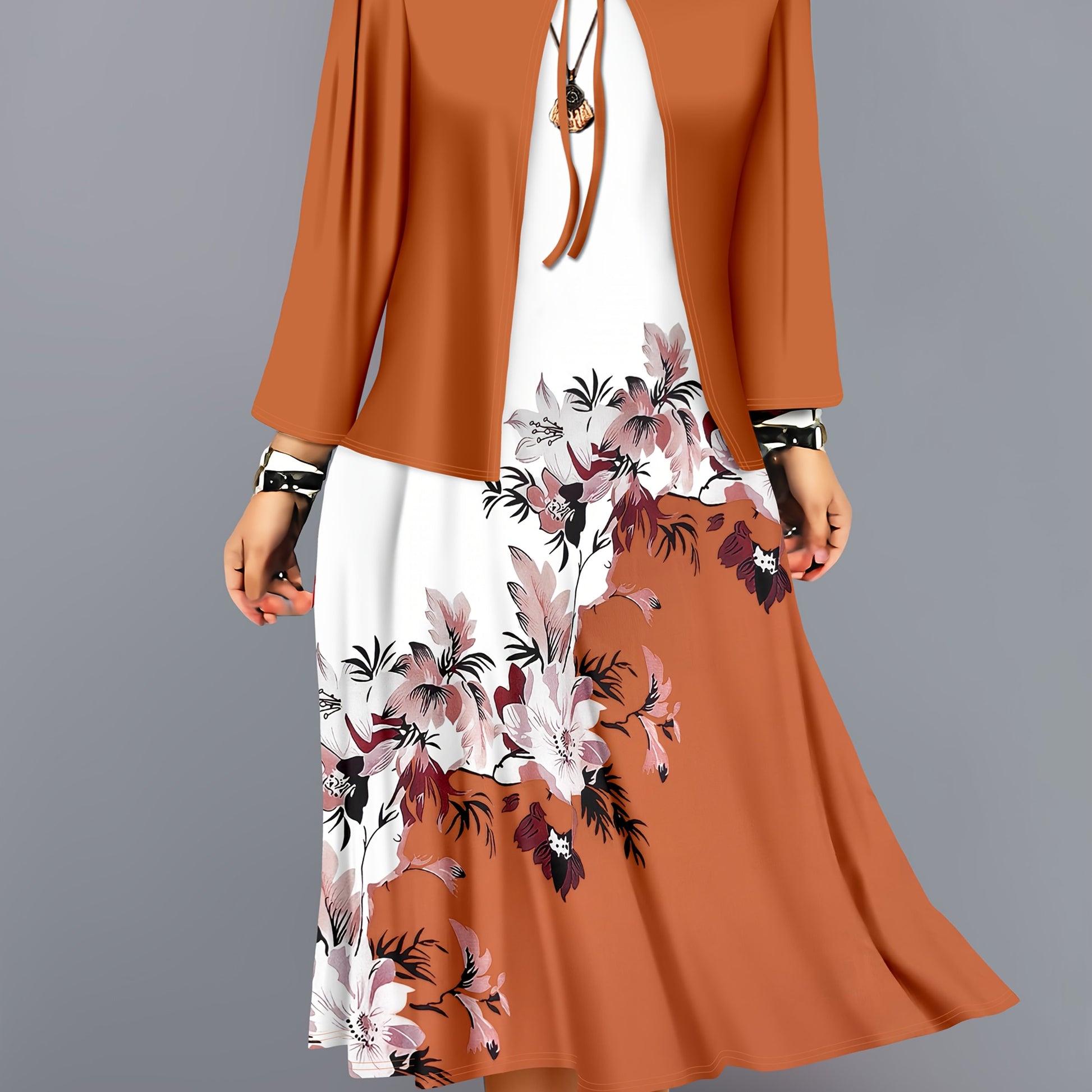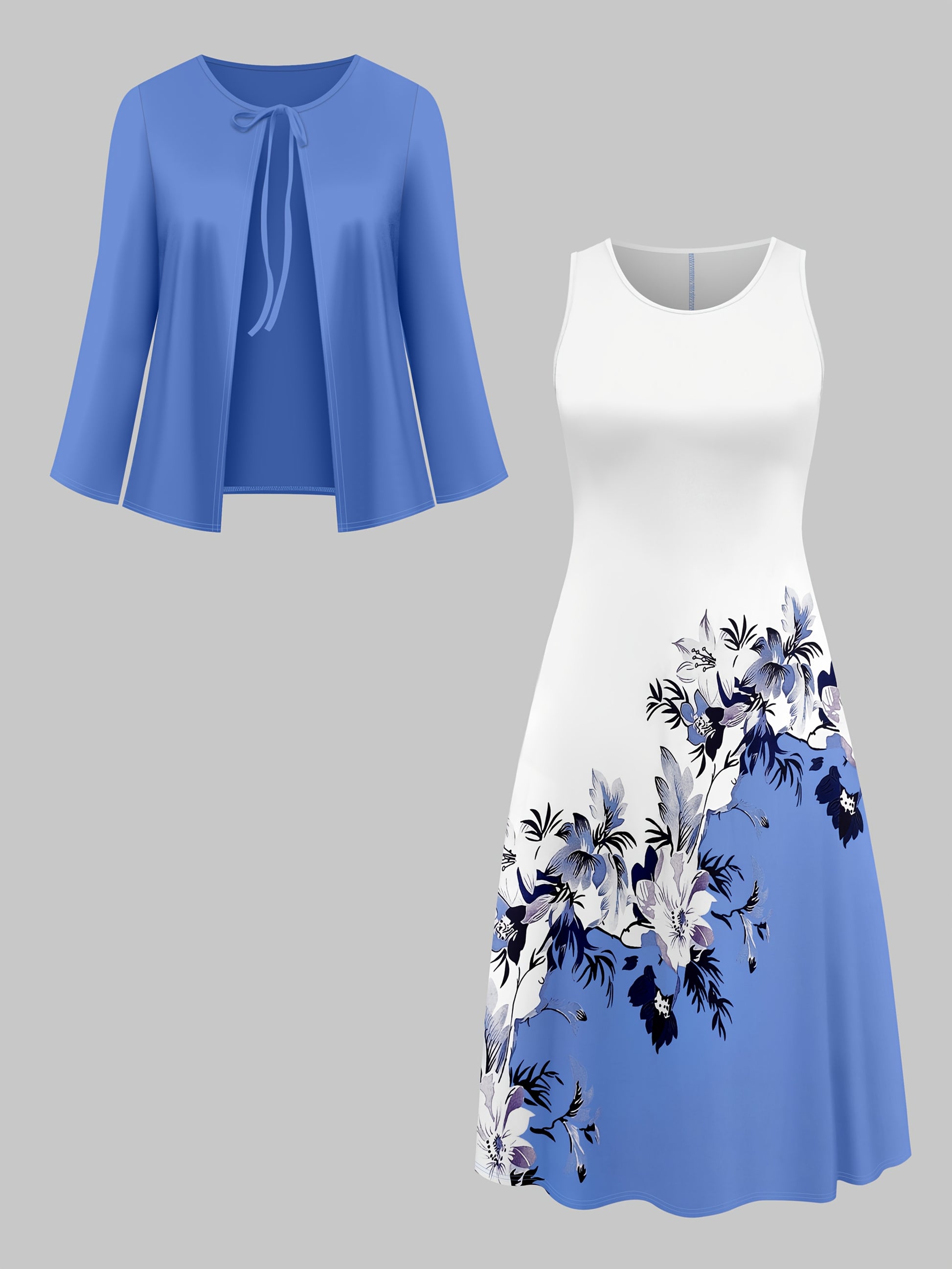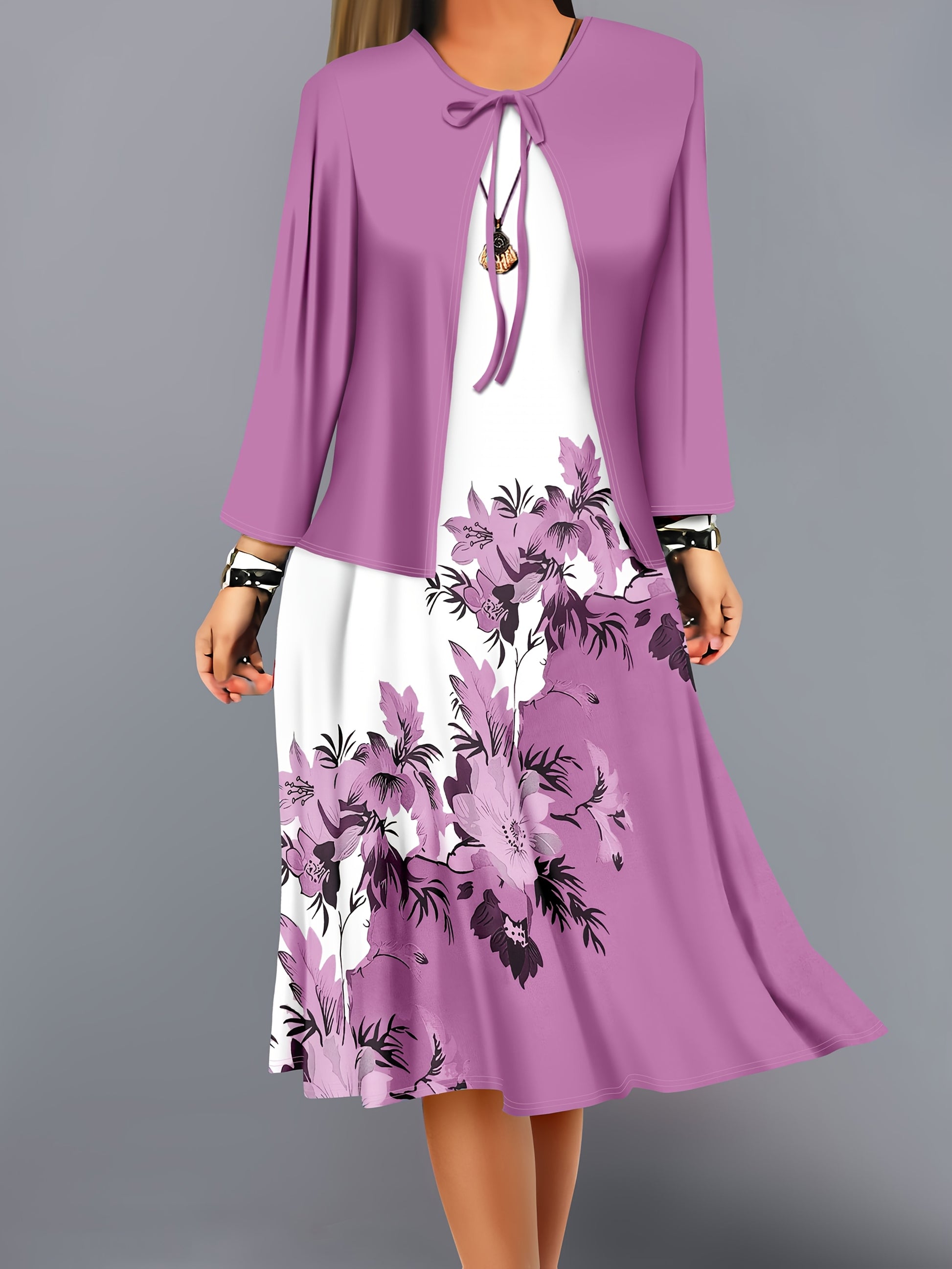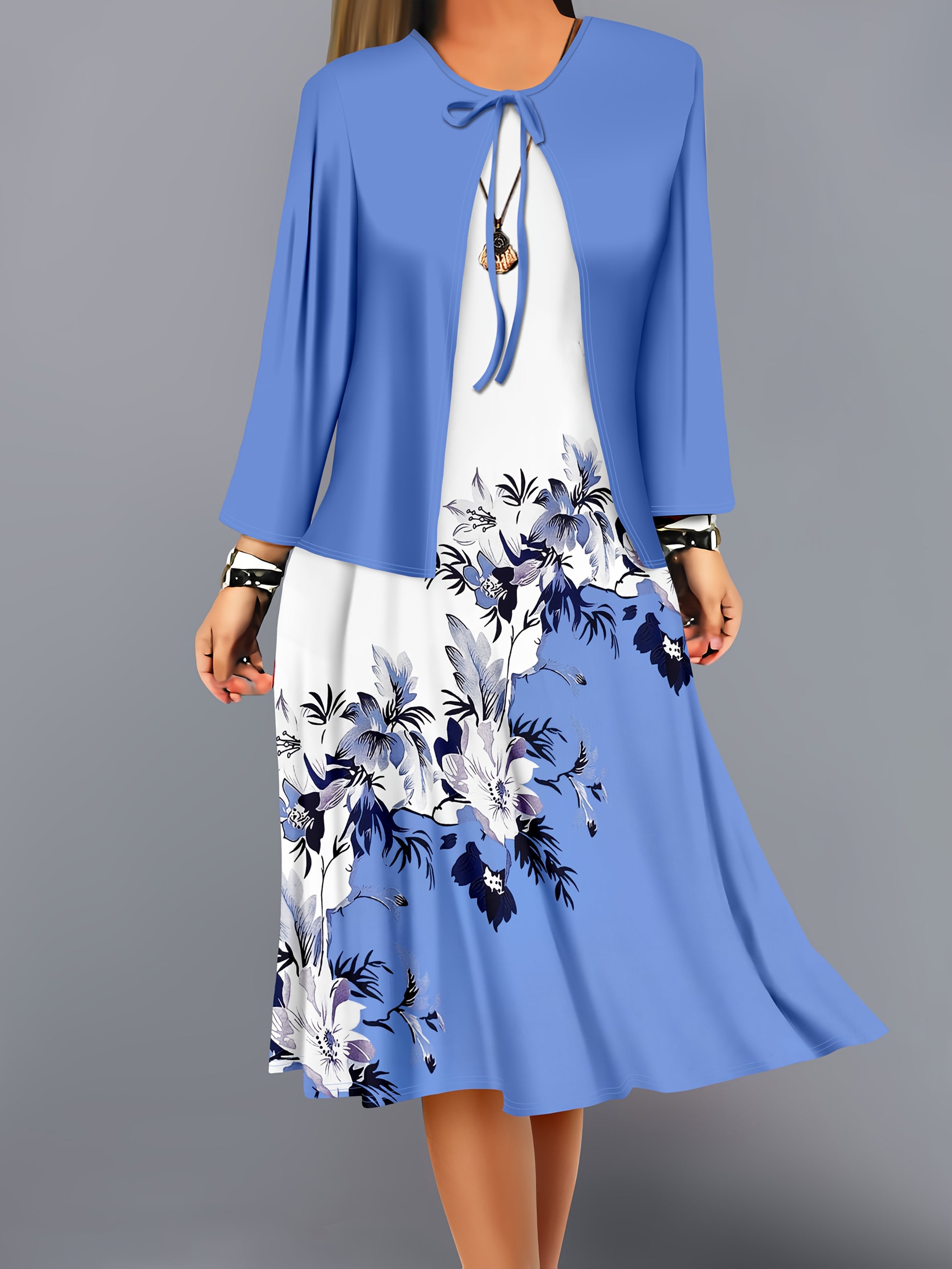 Fashion Women's solid color small cardigan and floral print patchwork dress two-piece set