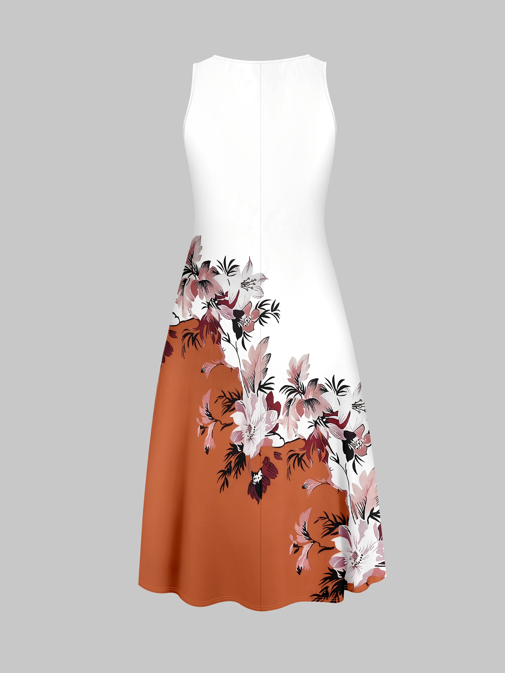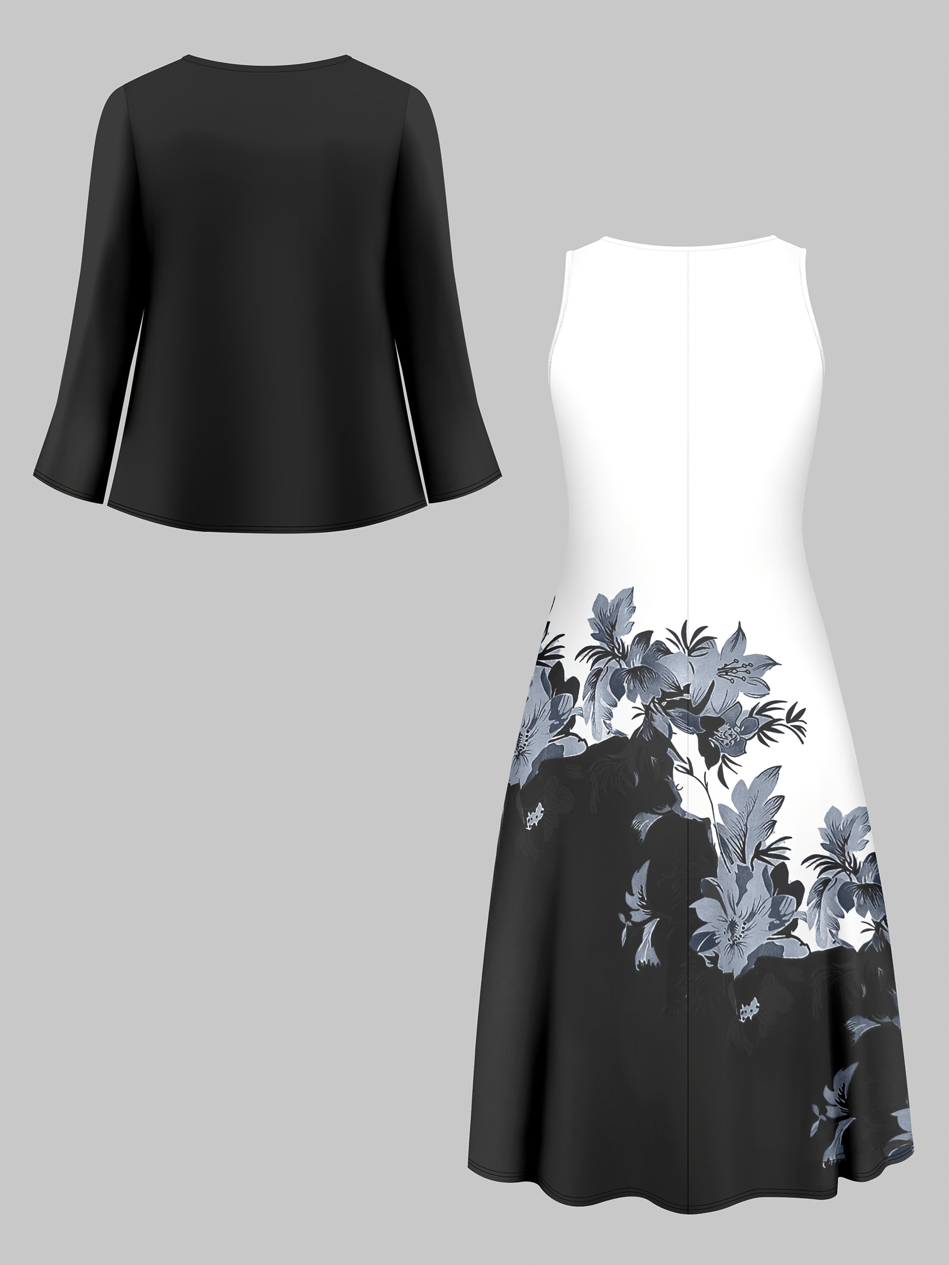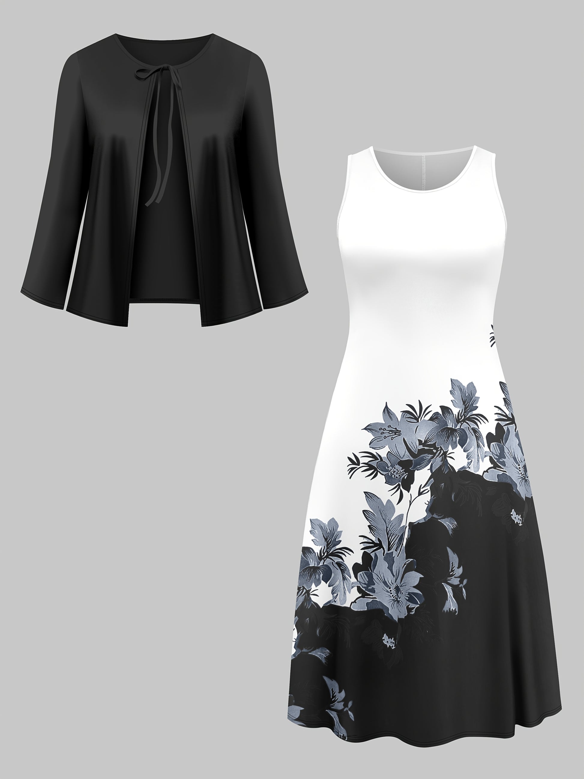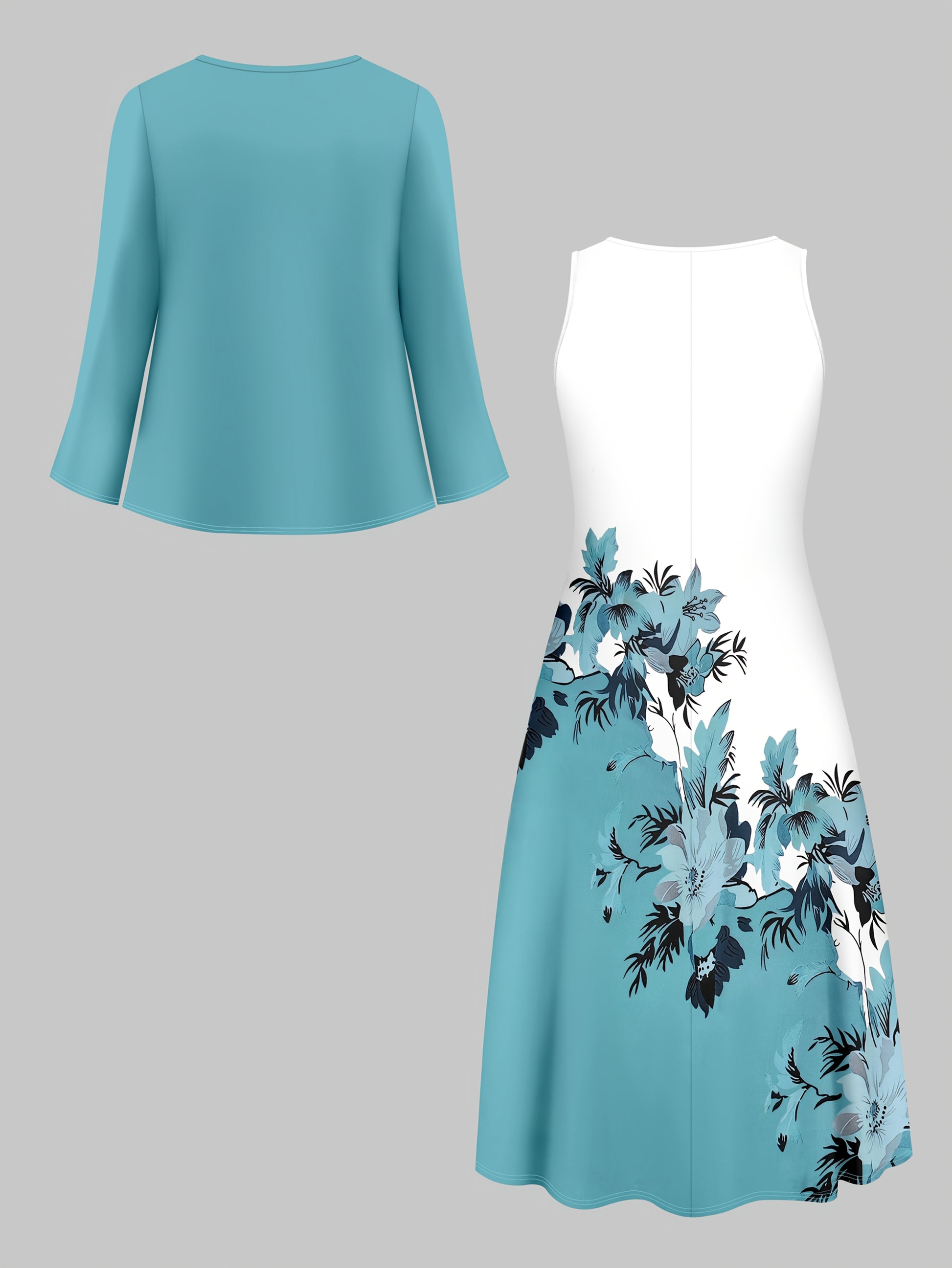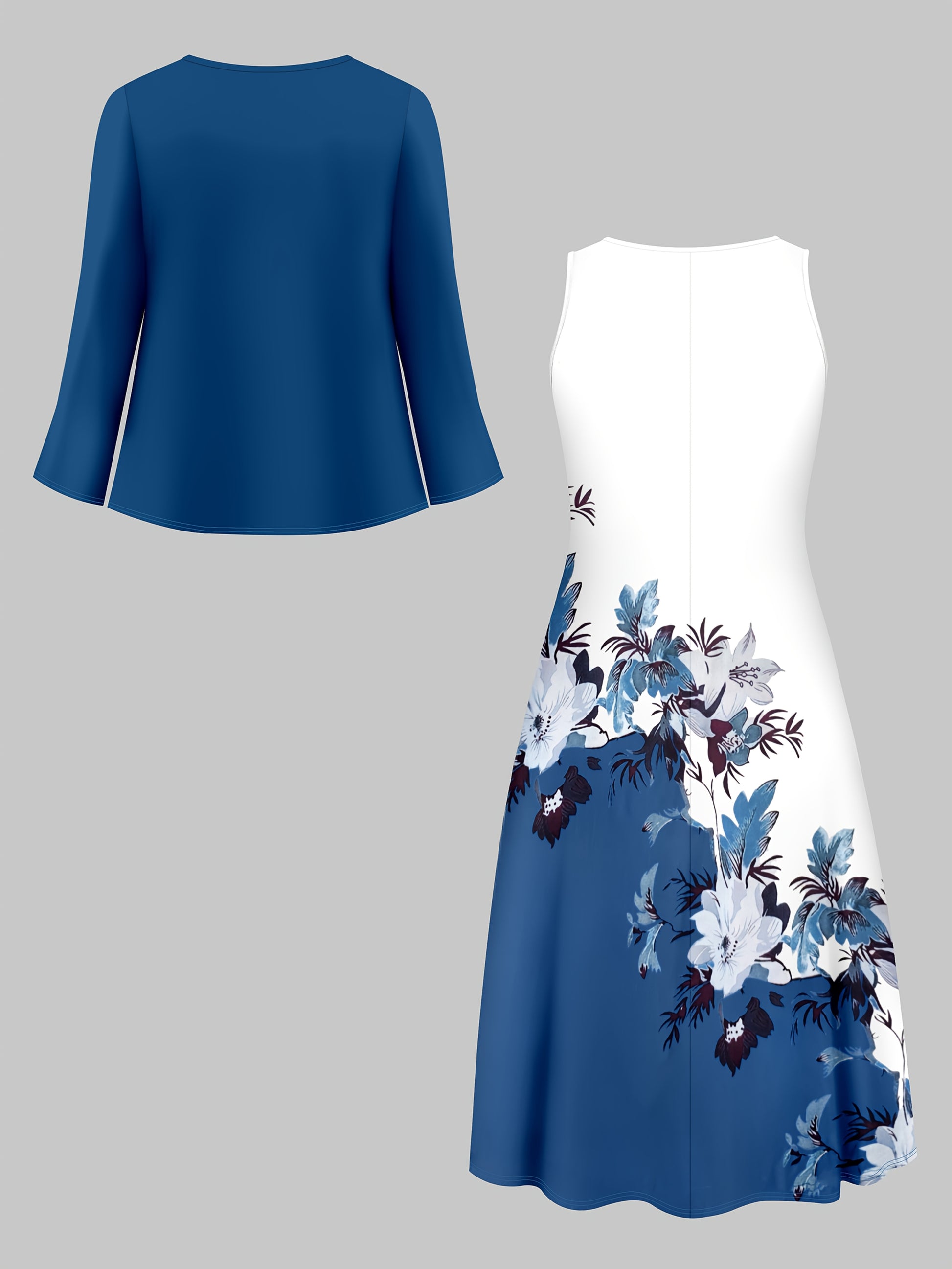 Fashion Women's solid color small cardigan and floral print patchwork dress two-piece set