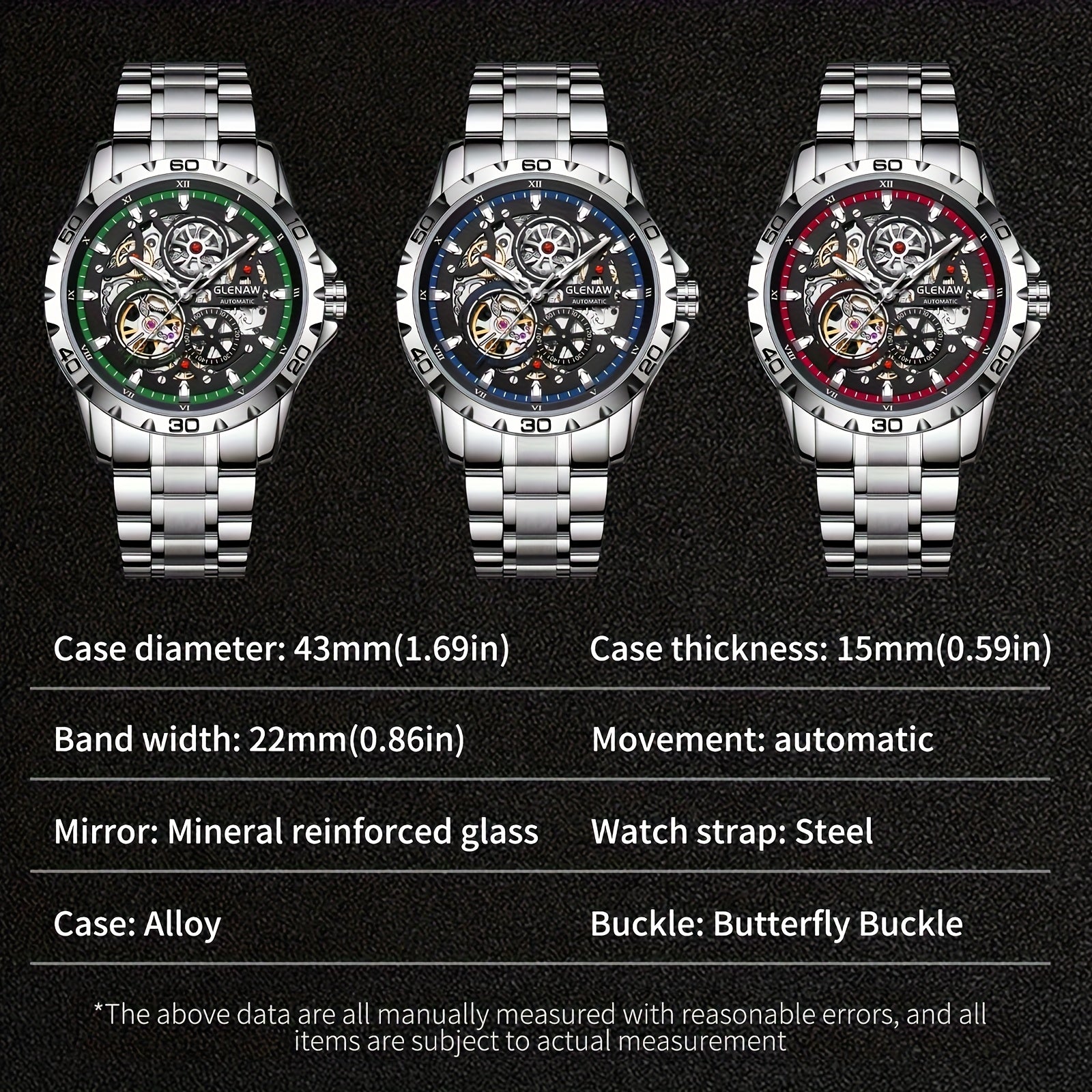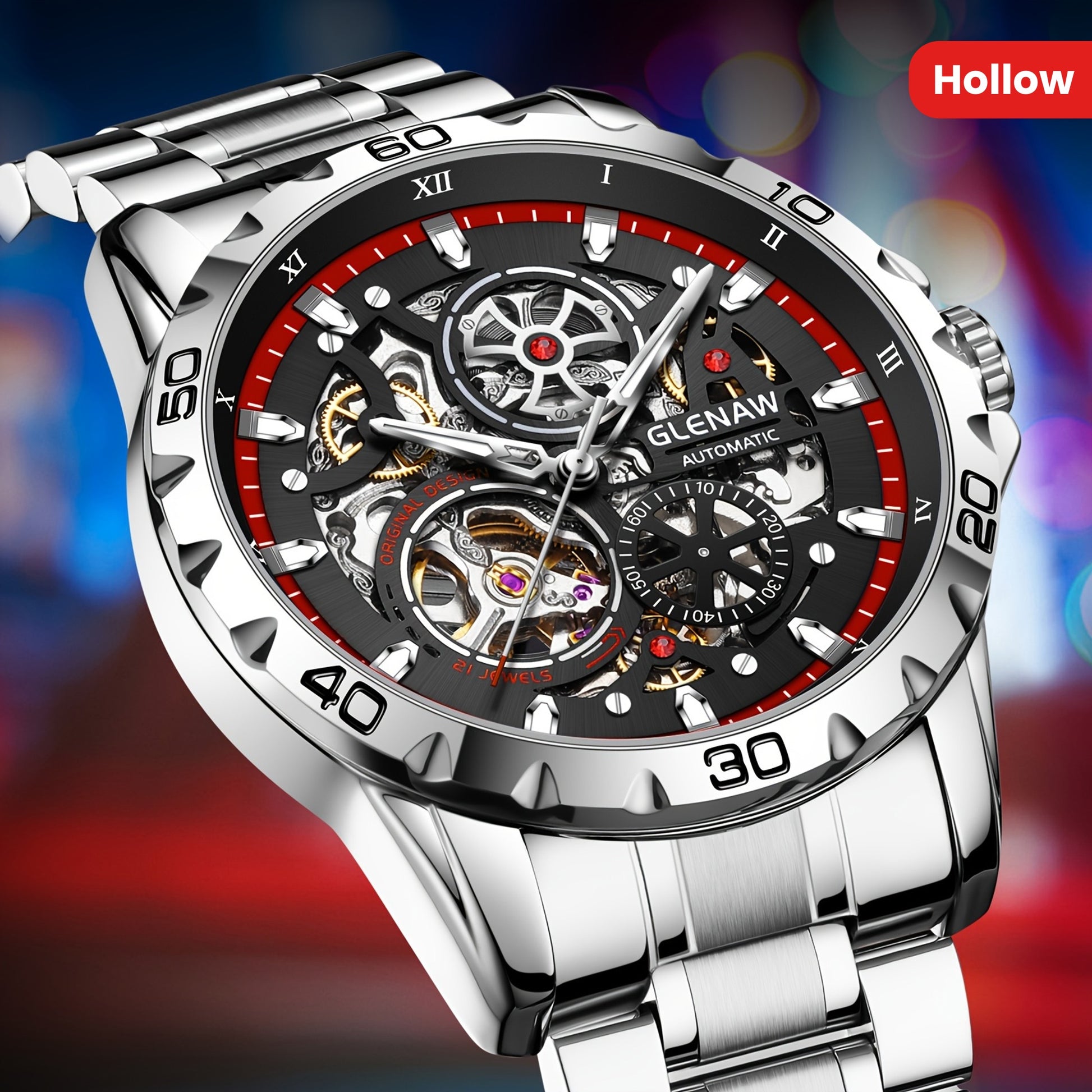 GLENAW Men's Automatic Skeleton Watch - Self-Winding Mechanical Watch with Flywheel Rotation, Transparent dial, Date Display, Stainless Steel Band - No Battery Needed, Wristwatch for Everyday & Formal Events - Ideal Gift for