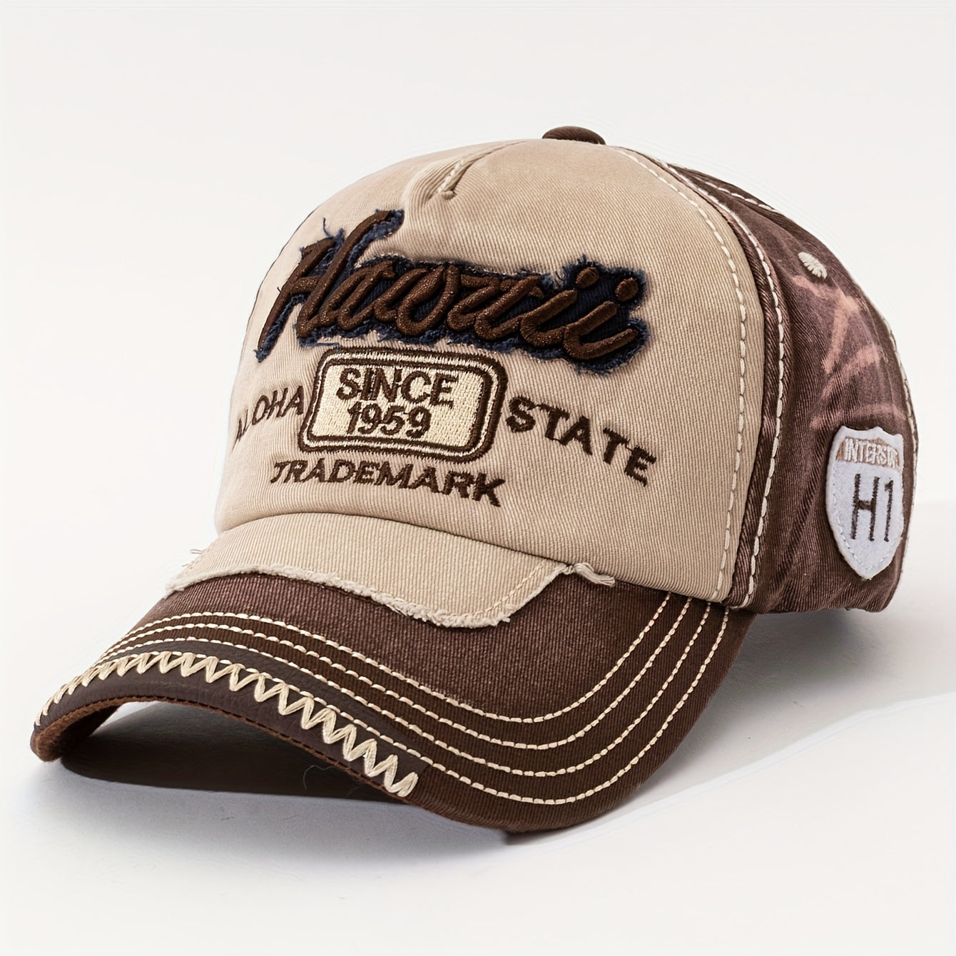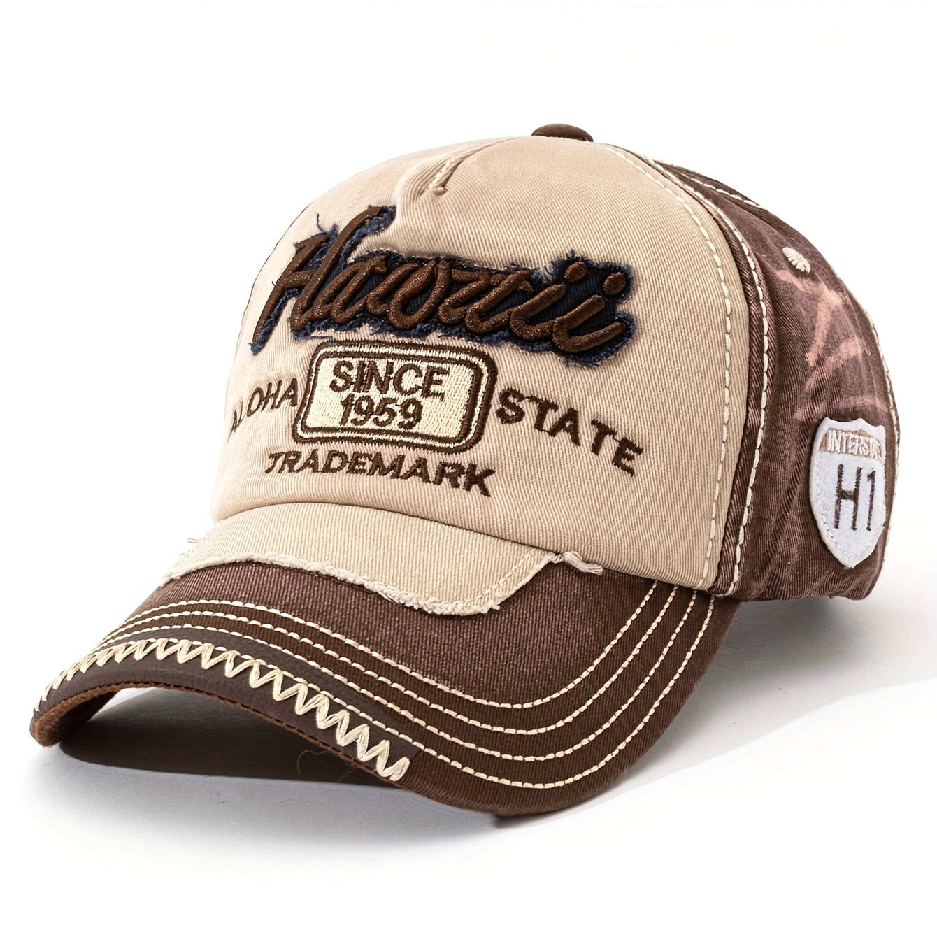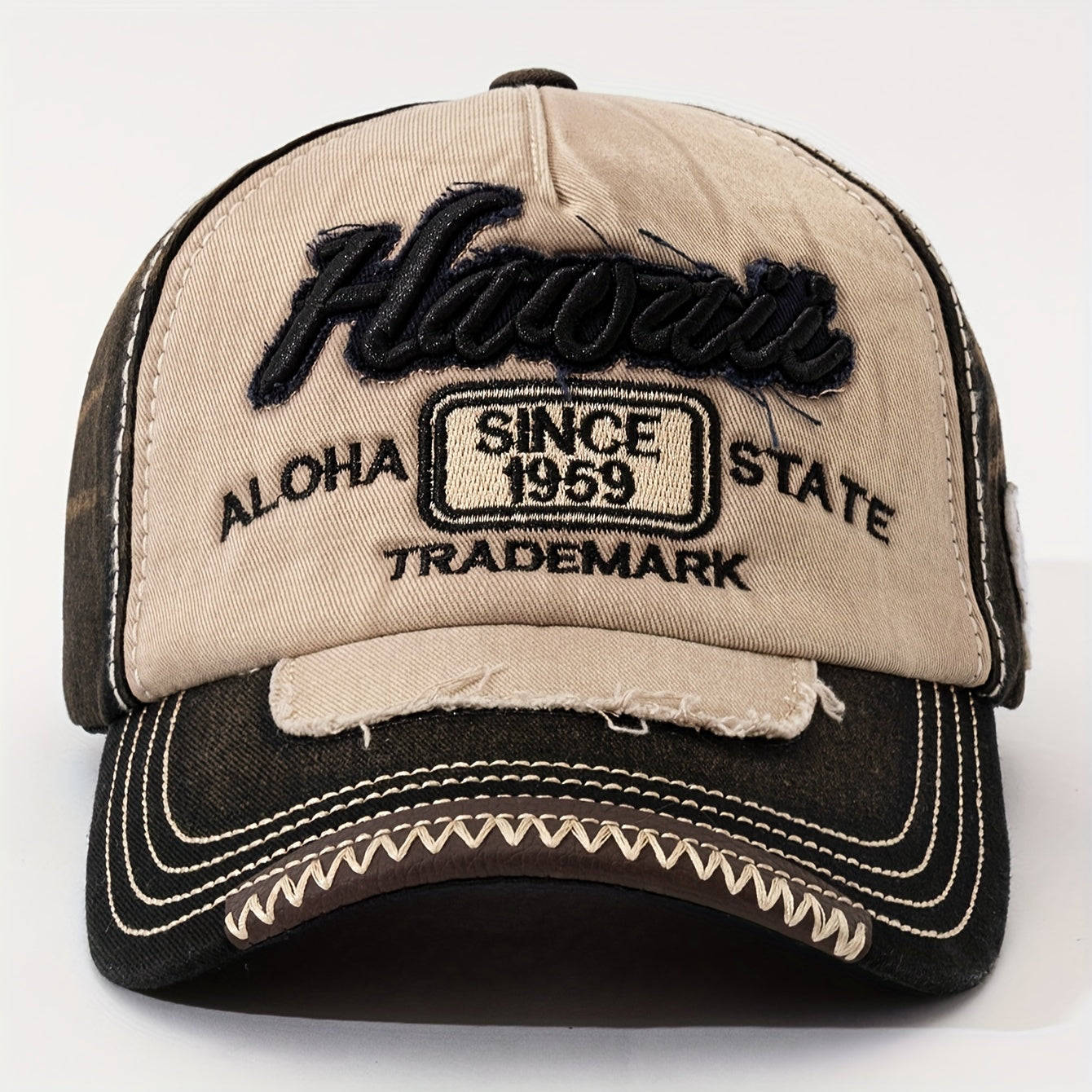 HAWAII Vintage Distressed Baseball Cap - Adjustable Lightweight Unisex Hat with 3D Embroidered Aloha Text, Dual-Tone Beige & Brown, Breathable Design for Men & Women, Daily Use & Vacation, Hawaiian Accessories, Casual Headwea