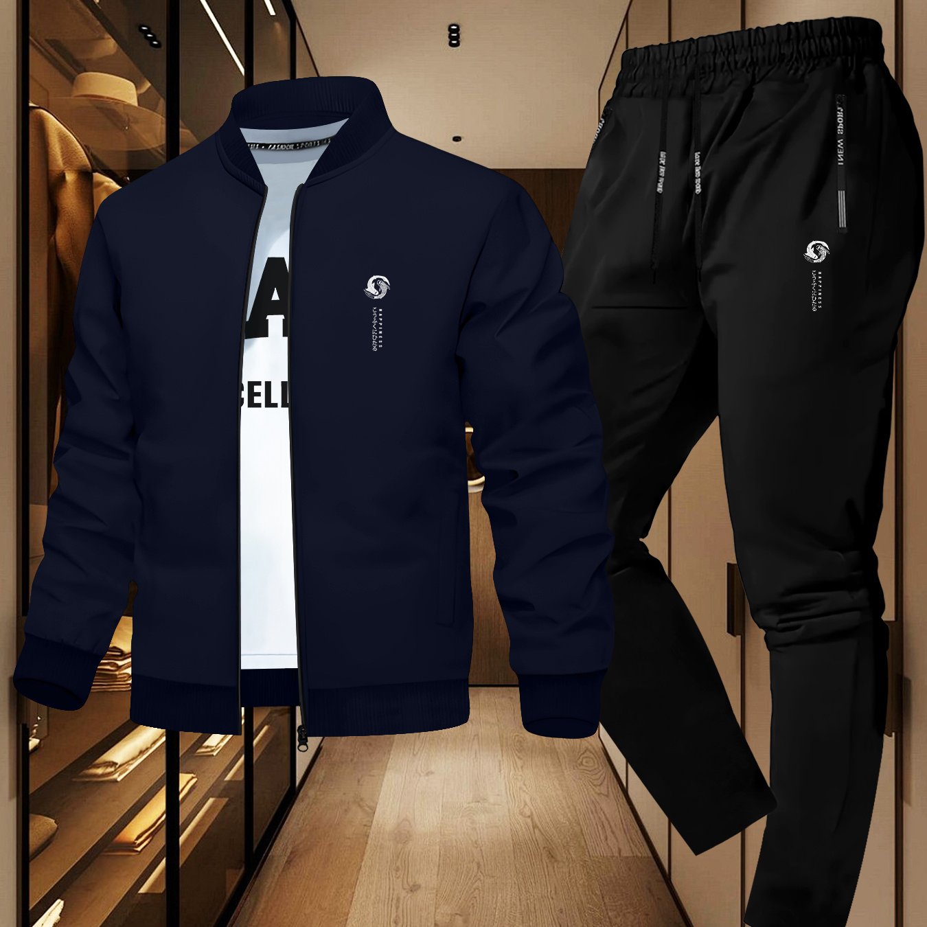 Japanese-Style Happiness Print, Casual Men'S Suit for Spring And Autumn, Featuring a Simple Two-Piece Set with a Round Neck Jacket And Long Pants, Perfect for Daily Sports And Travel, Trendy.