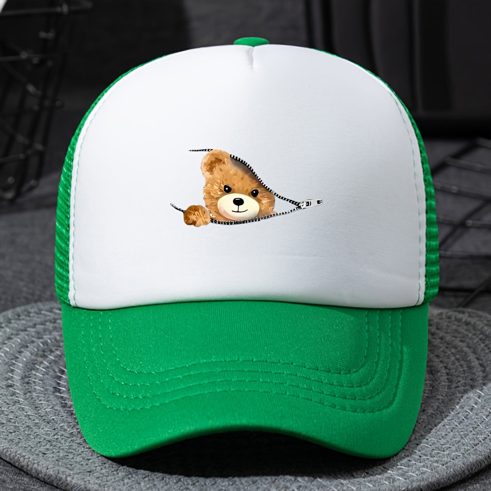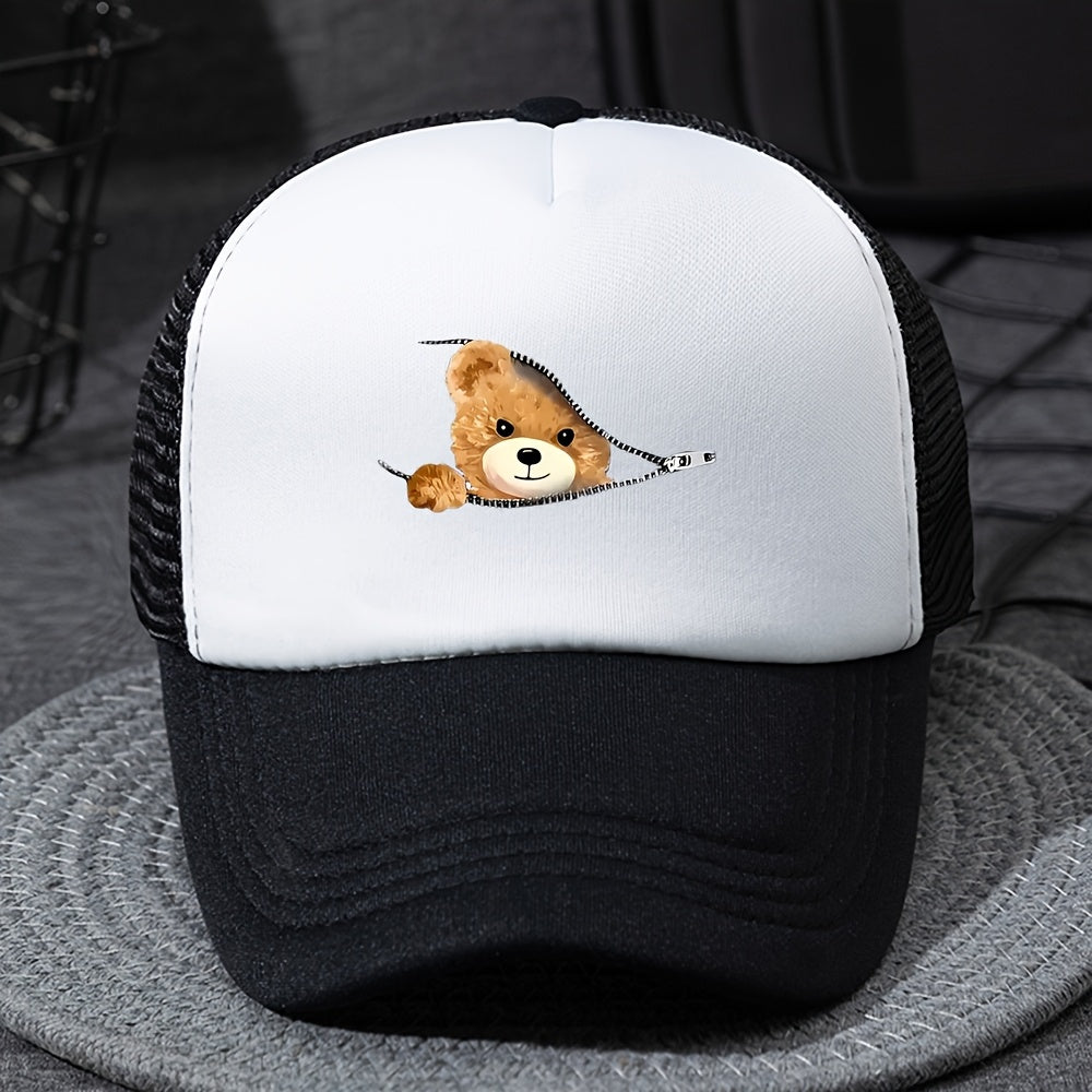 Kids' Breathable Mesh Baseball Cap with Teddy Bear Design - Adjustable Snapback, Sun-Protective Trucker Hat for Boys & Girls, Black