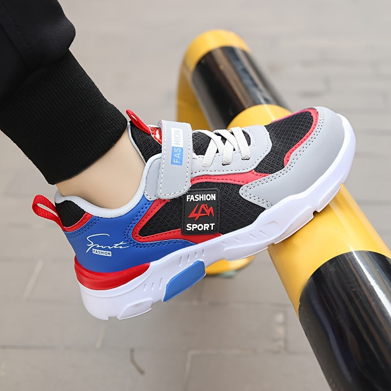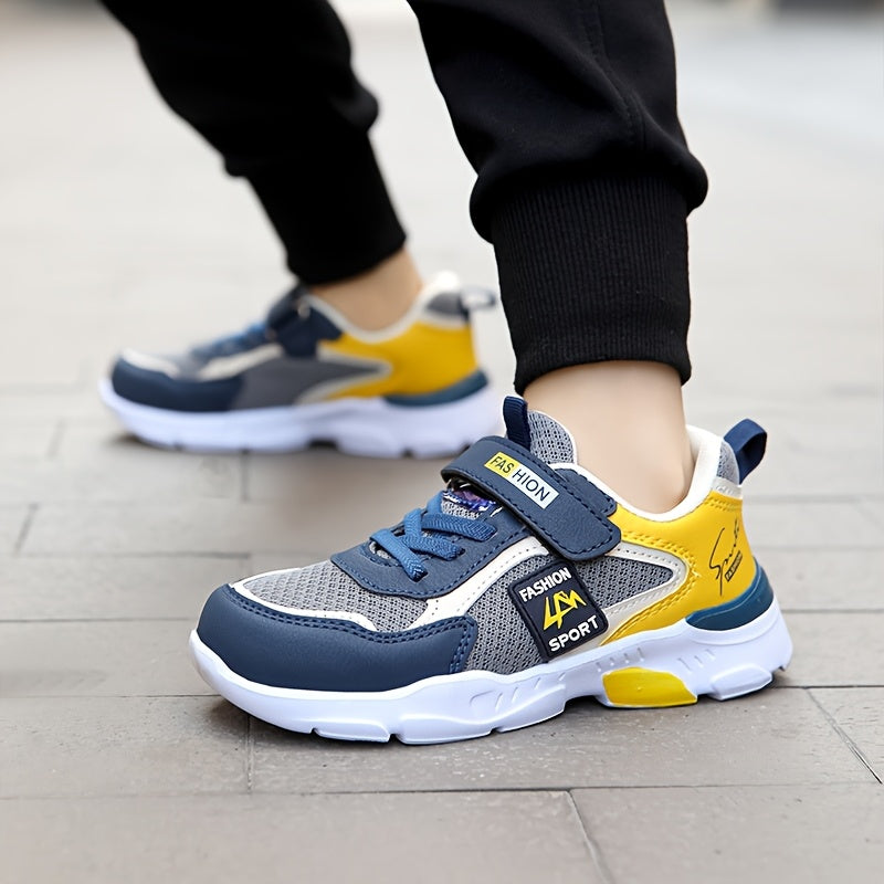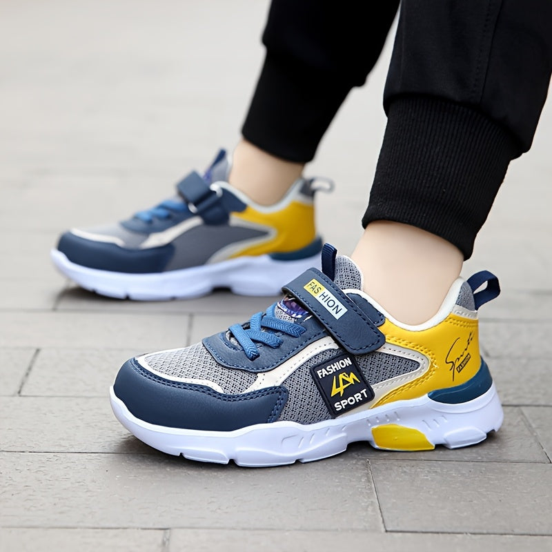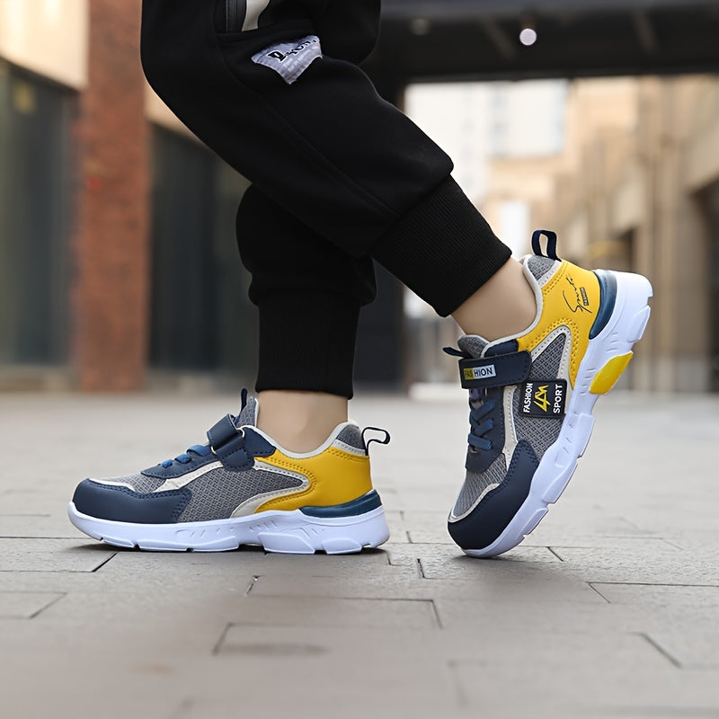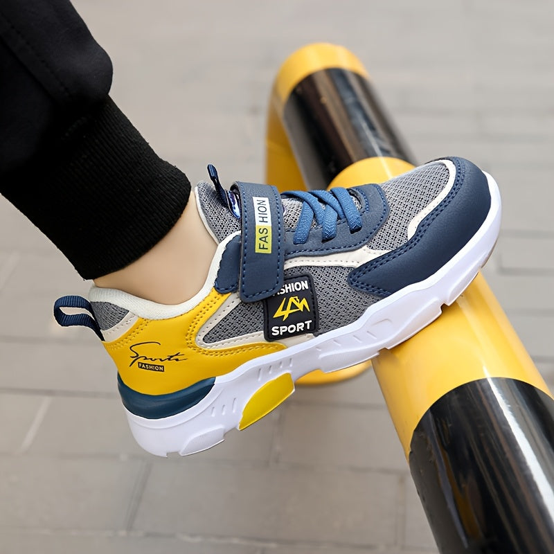 Kids' Low-Top Outdoor Sports Shoes with Closure - Breathable Mesh & Upper, EVA Cushioned Sole for Hiking Running Basketball - Grey/Yellow/Blue Colorway, All-Season Boys & Girls Sneakers, Kids Hiking Gear, Durable Kids Footwea