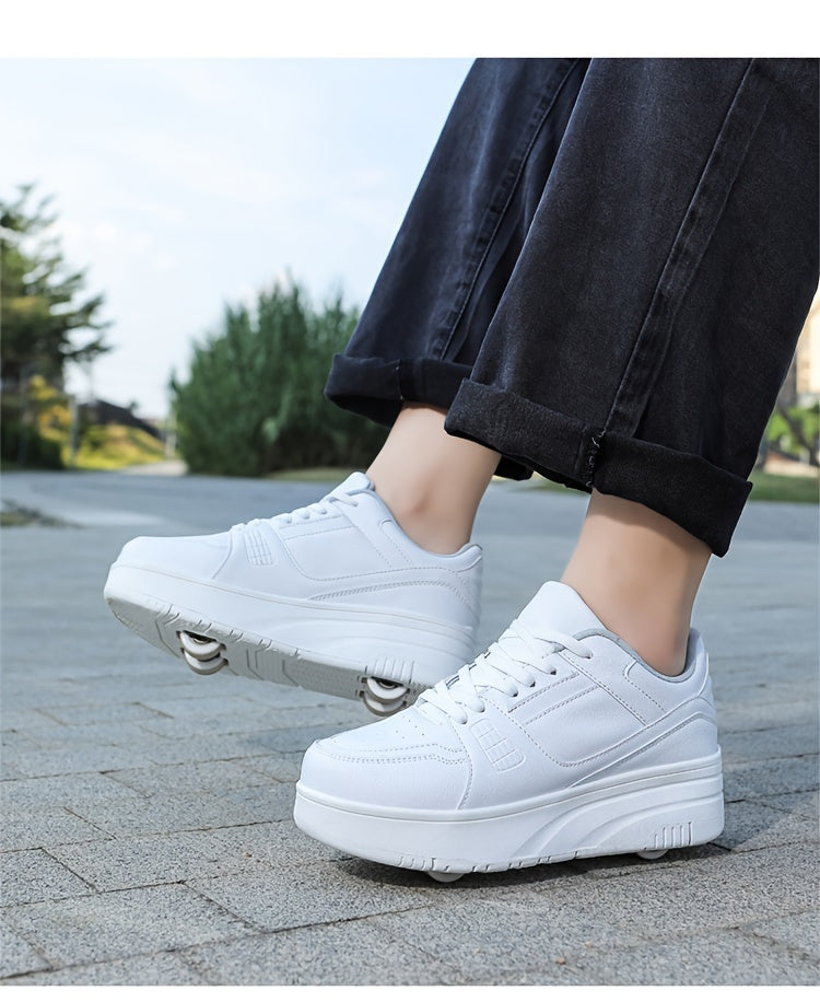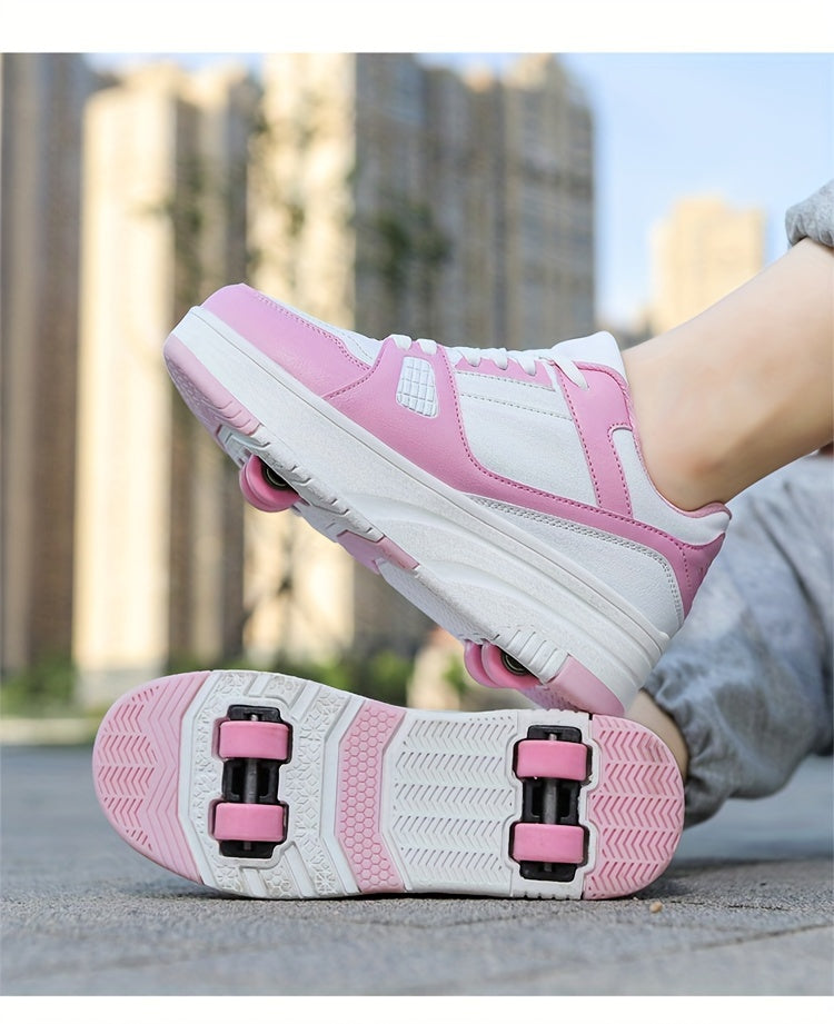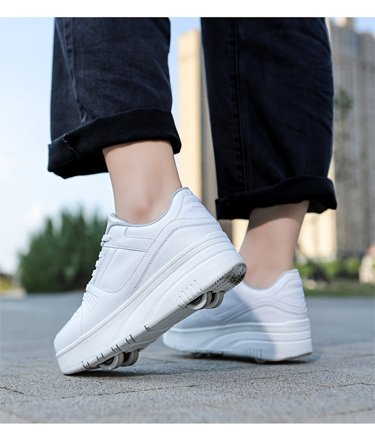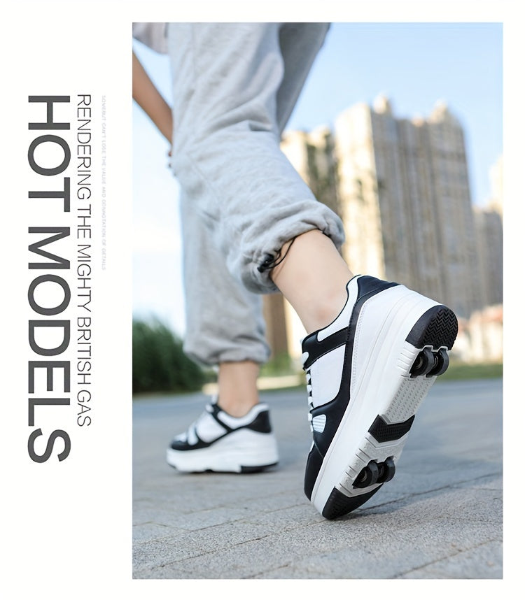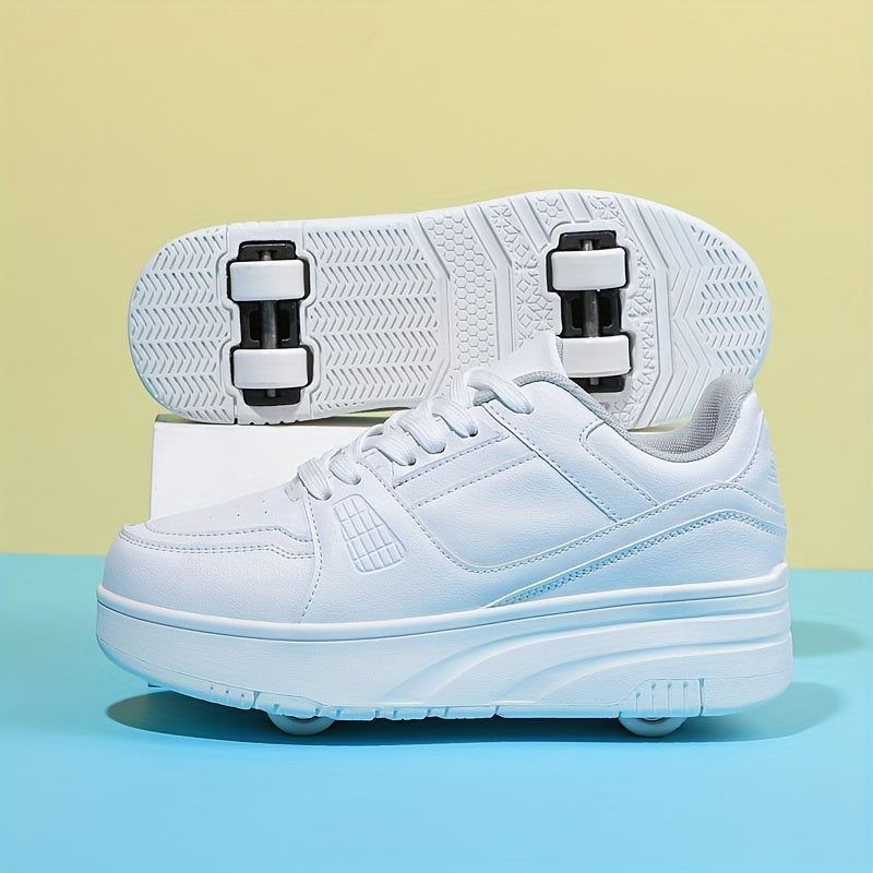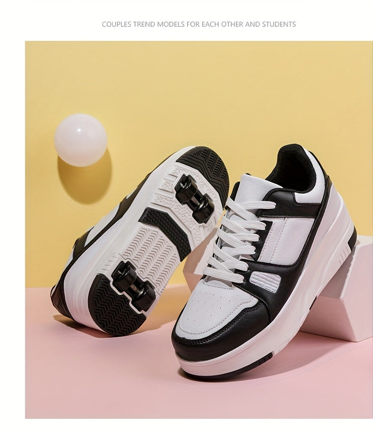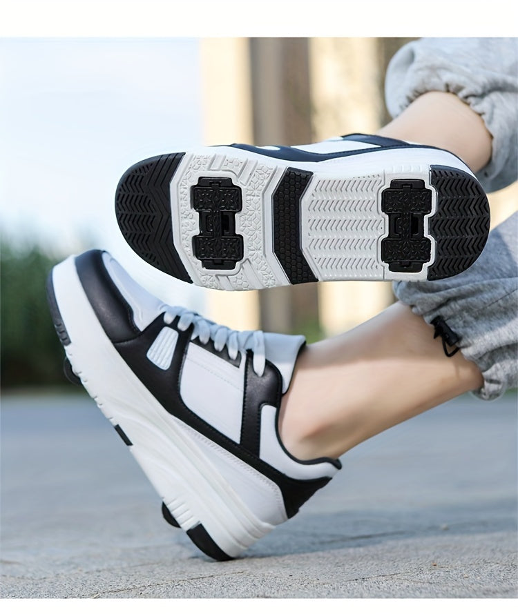 Kids Unisex Skateboard Shoes, 8-Wheel Removable Roller Skates, Plaid Fabric Low Top Sneakers, Lace-Up, TPR Sole, Fabric Insole, for Hiking & Casual Wear, Suitable for Boys & Girls Ages 14 and Under, All-Season
