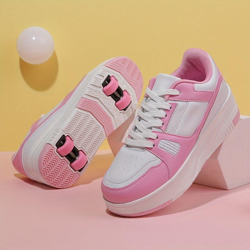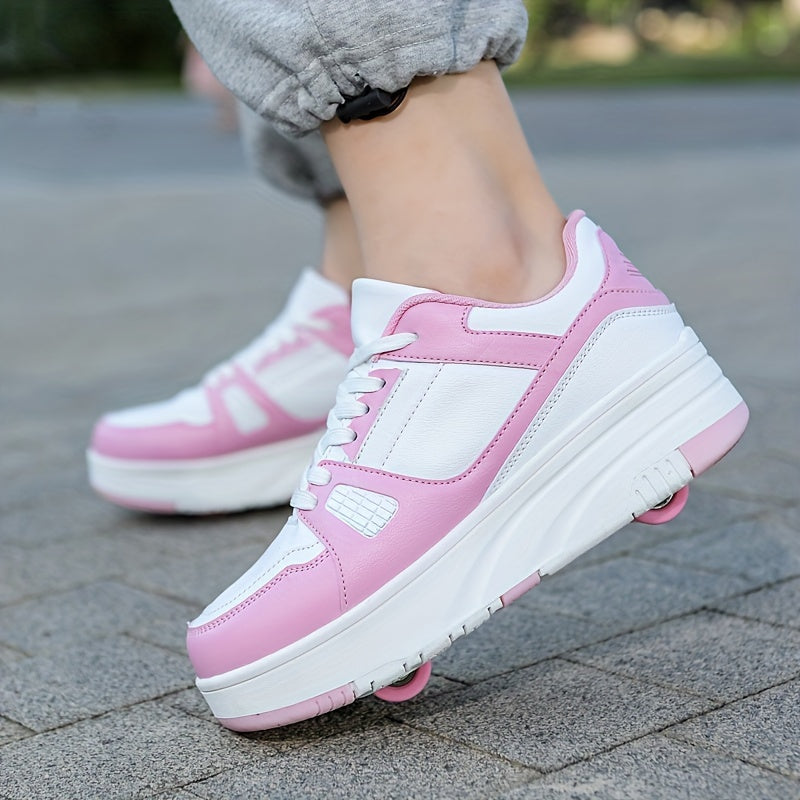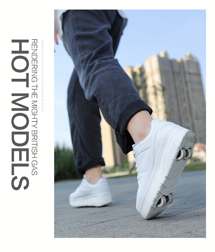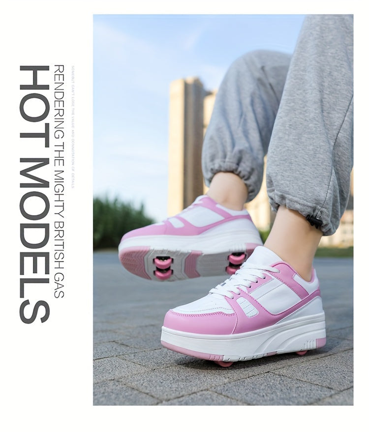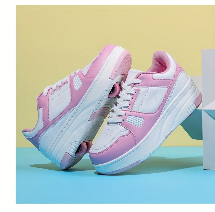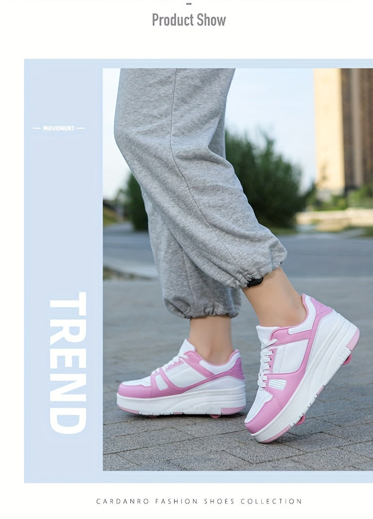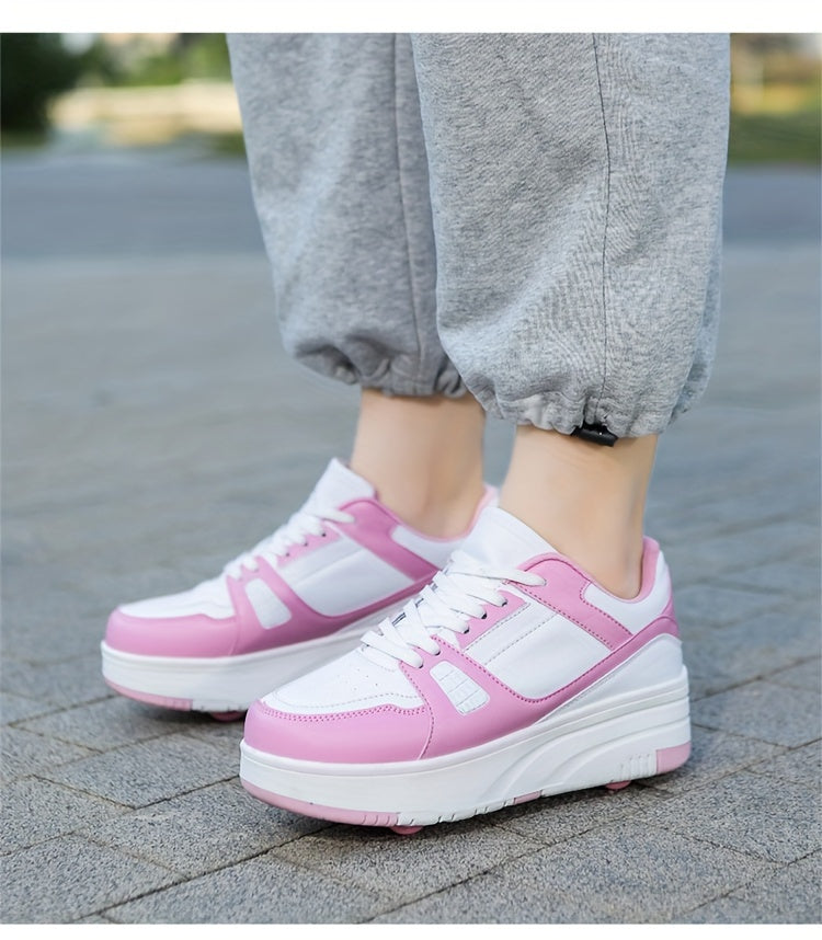 Kids Unisex Skateboard Shoes, 8-Wheel Removable Roller Skates, Plaid Fabric Low Top Sneakers, Lace-Up, TPR Sole, Fabric Insole, for Hiking & Casual Wear, Suitable for Boys & Girls Ages 14 and Under, All-Season