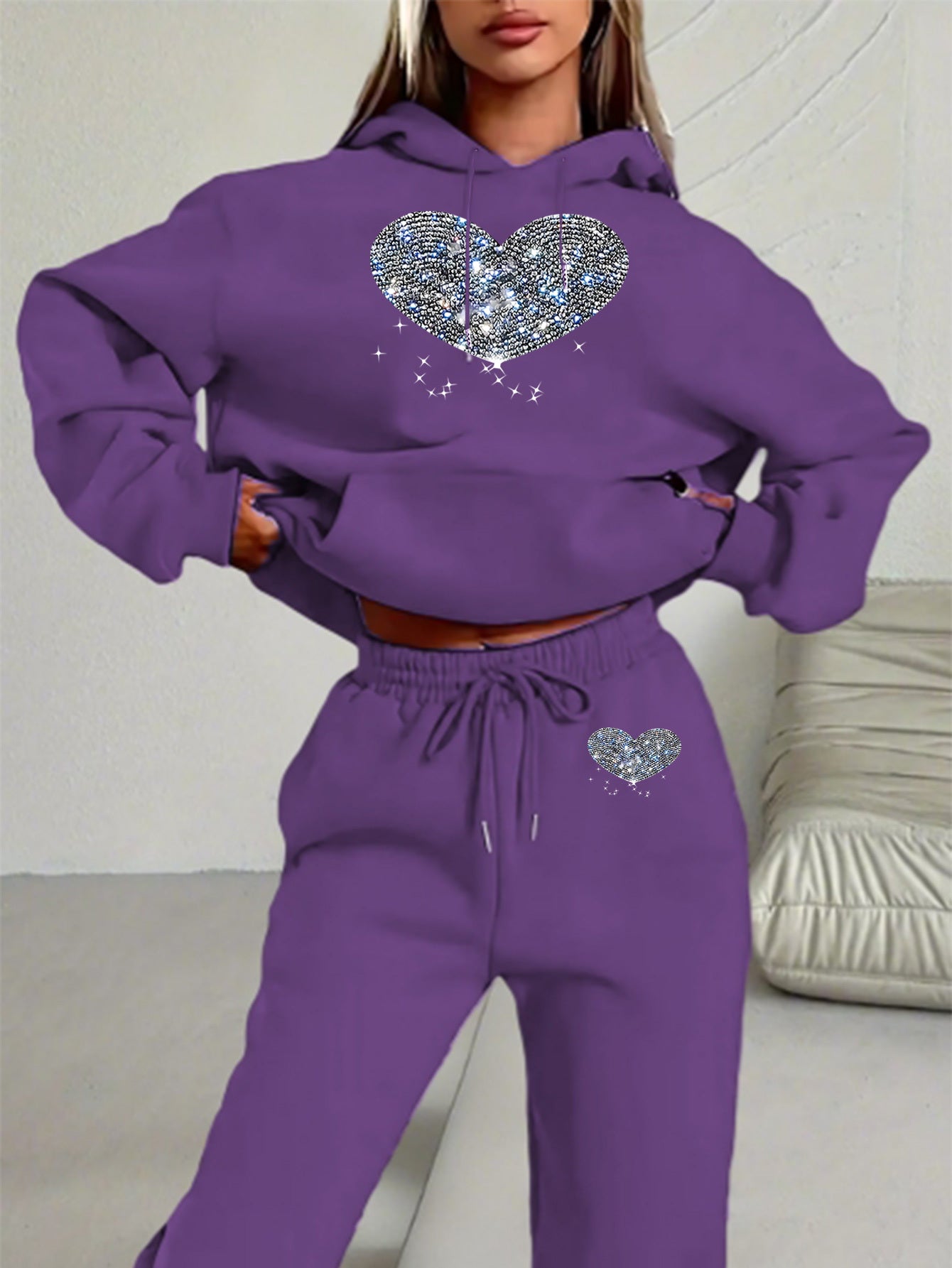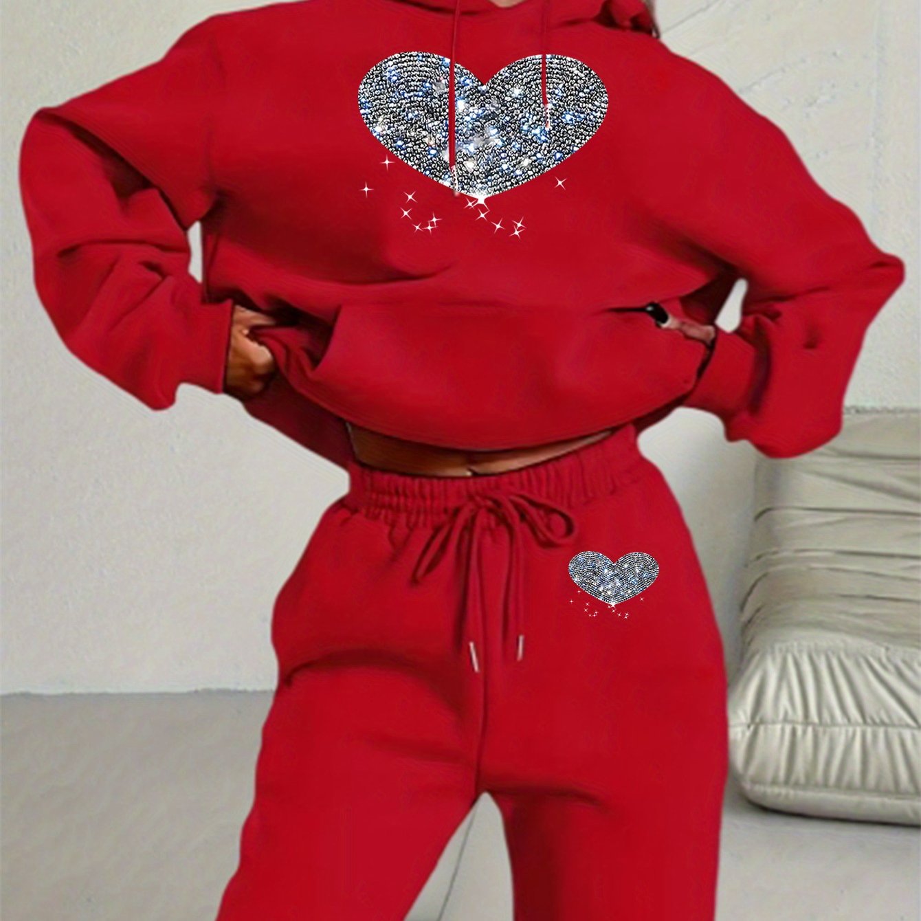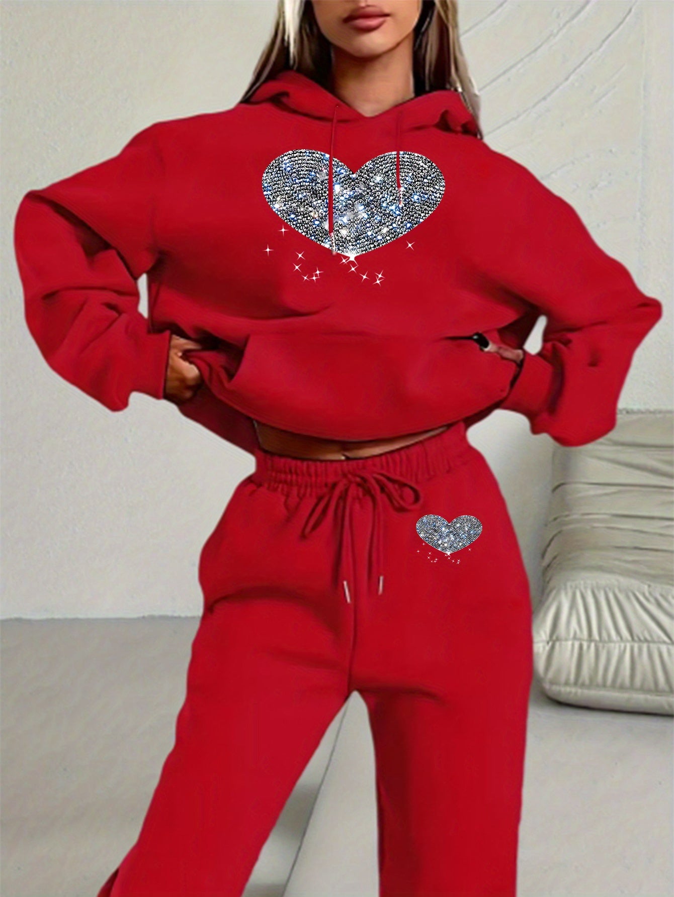 Ladies' Autumn-Winter Casual Hooded Sweatshirt and Pants Set with Shiny Heart Print | Comfortable Fleece-Like Feel, Drawstring Details
