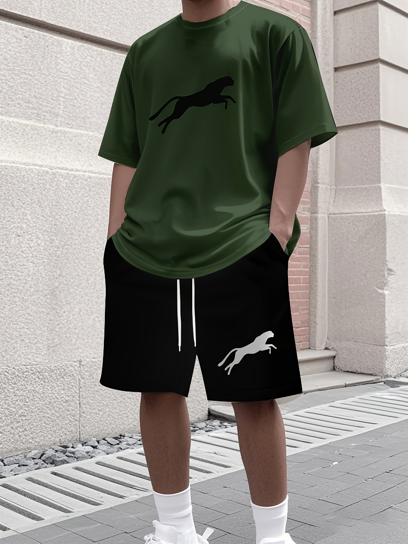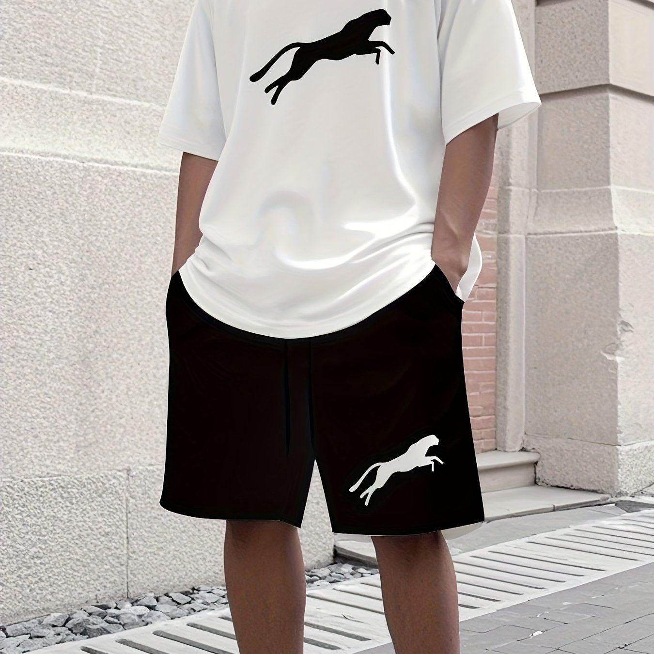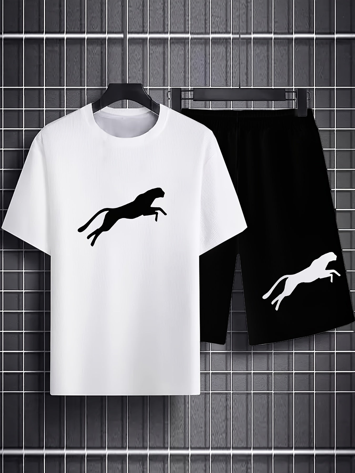 Leopard Print 3D Printed Men's Casual Sportswear Set - Breathable Polyester Knit Fabric, Crew Neck Short Sleeve T-Shirt and Shorts Combo, Regular Fit for All Seasons