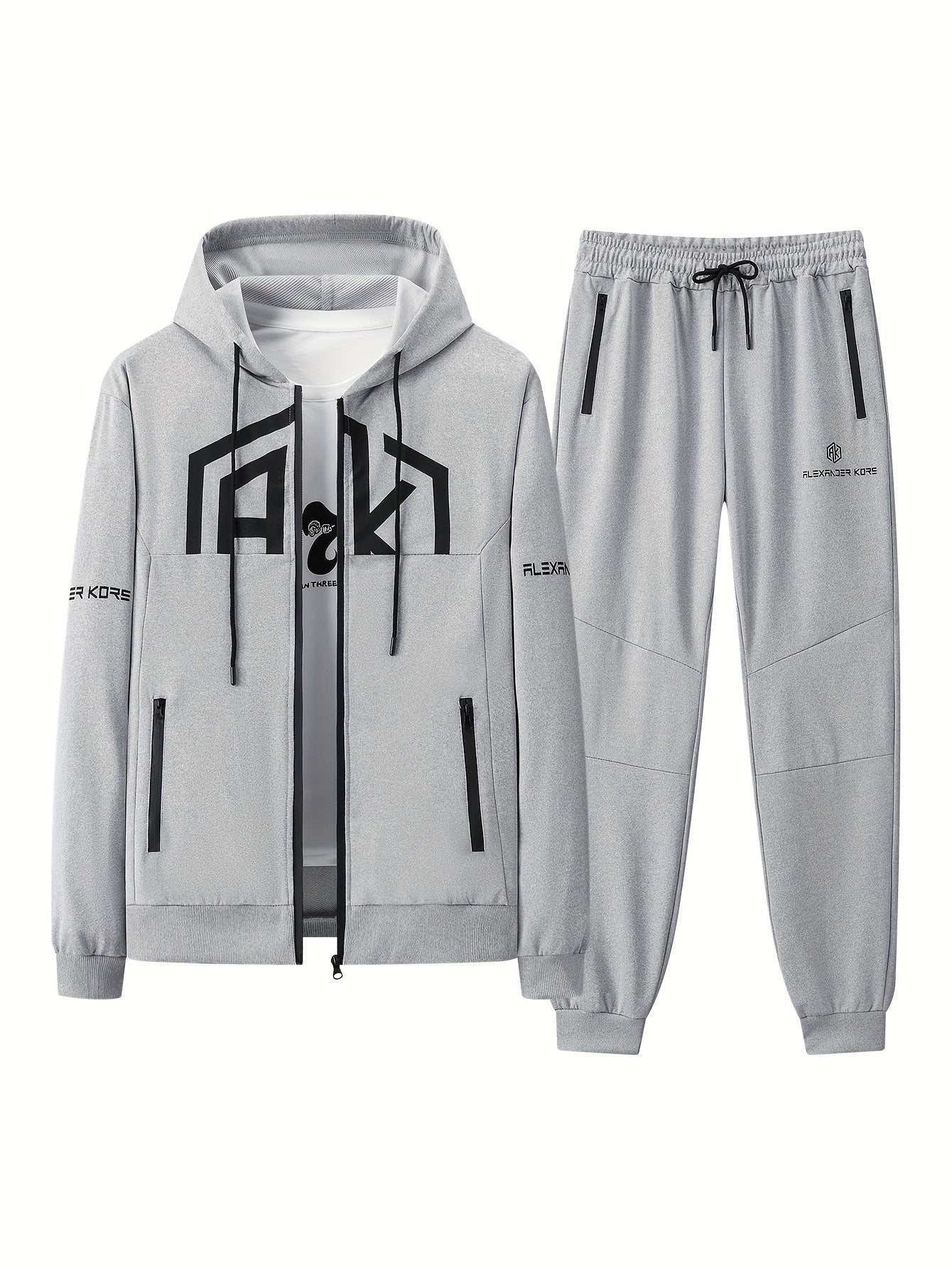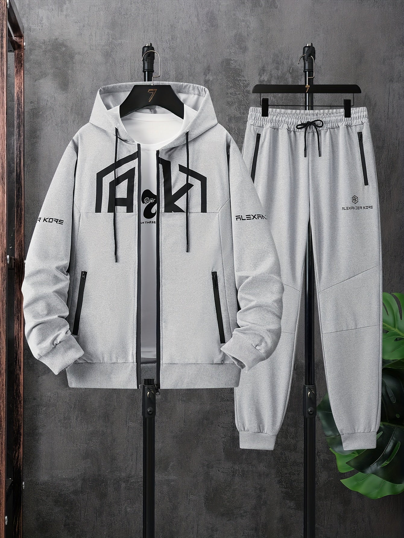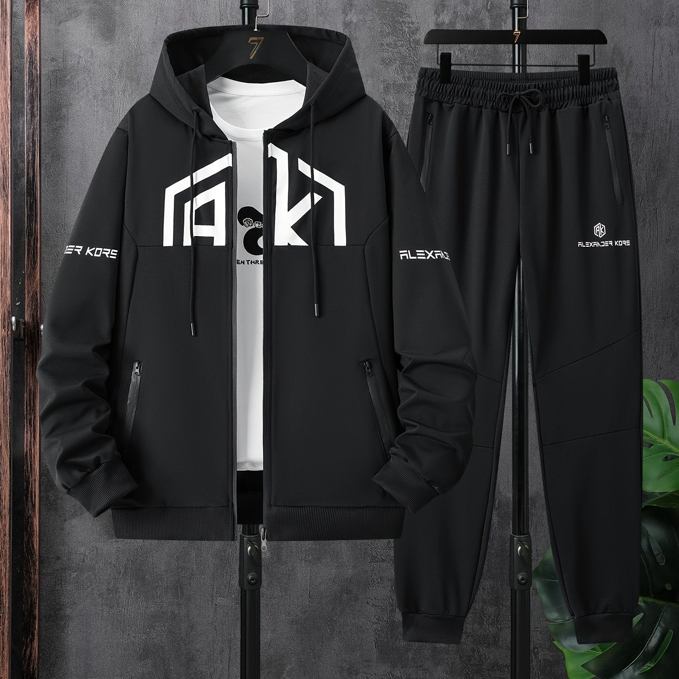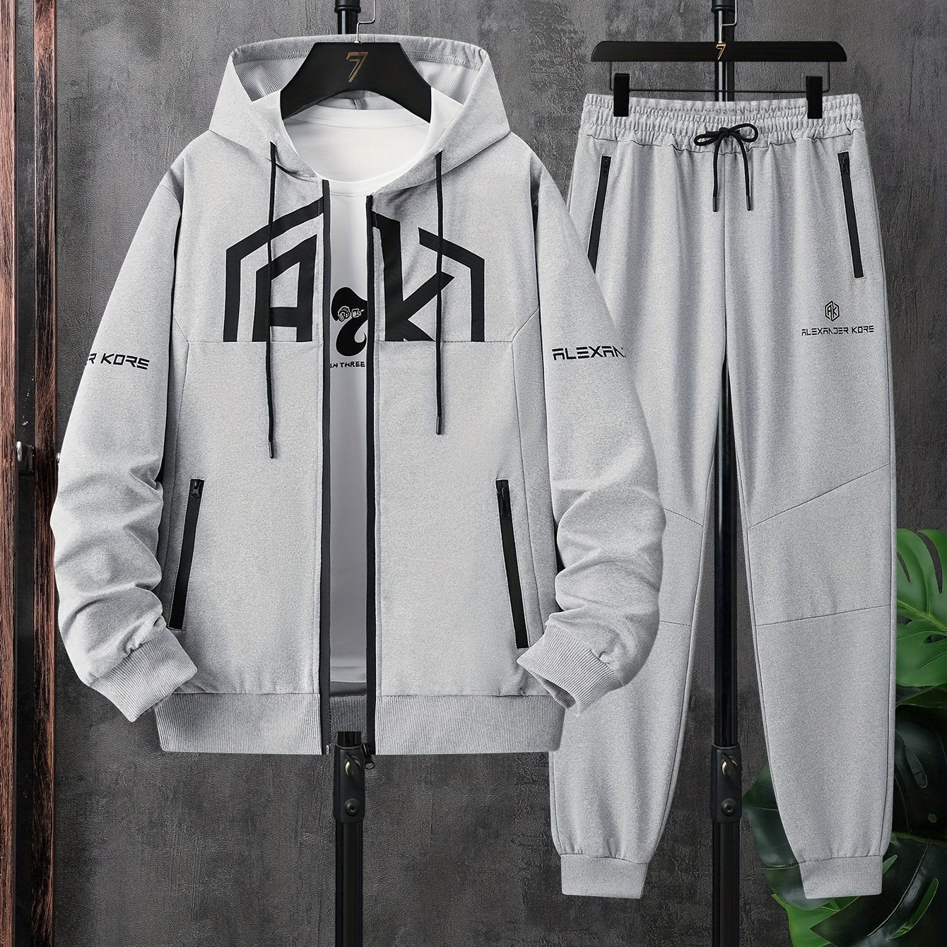 Men's AK Letter Print Long Sleeves Hoodies With Zipper Detail & Long Pants Two-piece Set, Slight Stretch Comfortable Clothing For Spring And Autumn