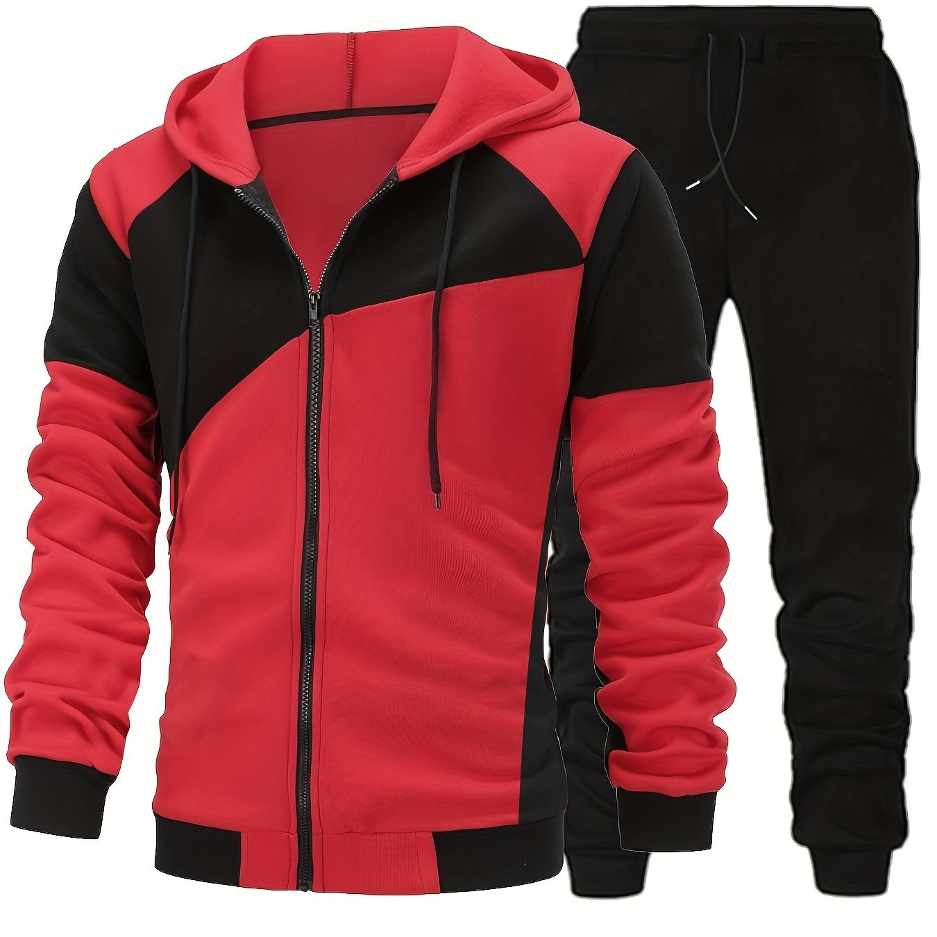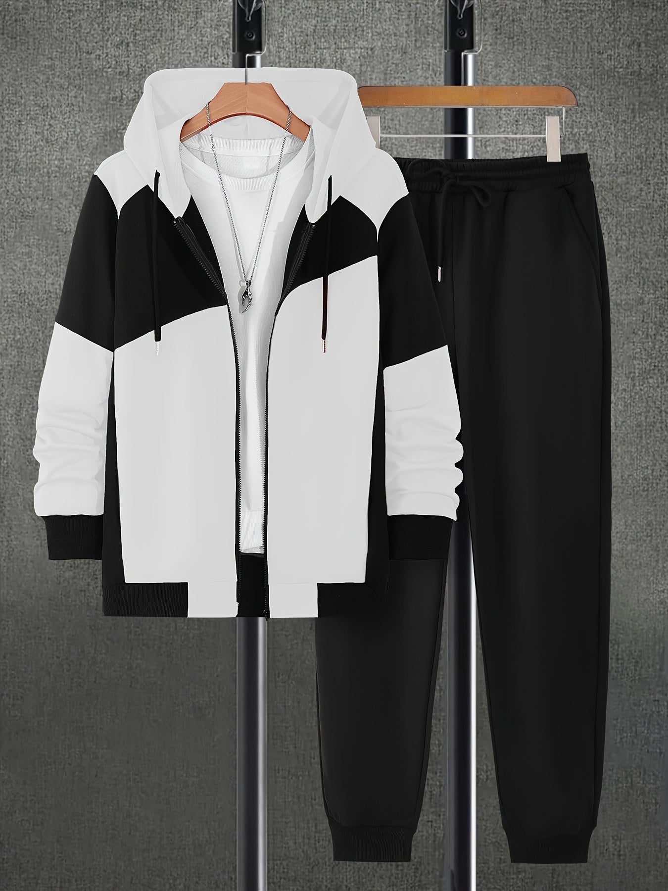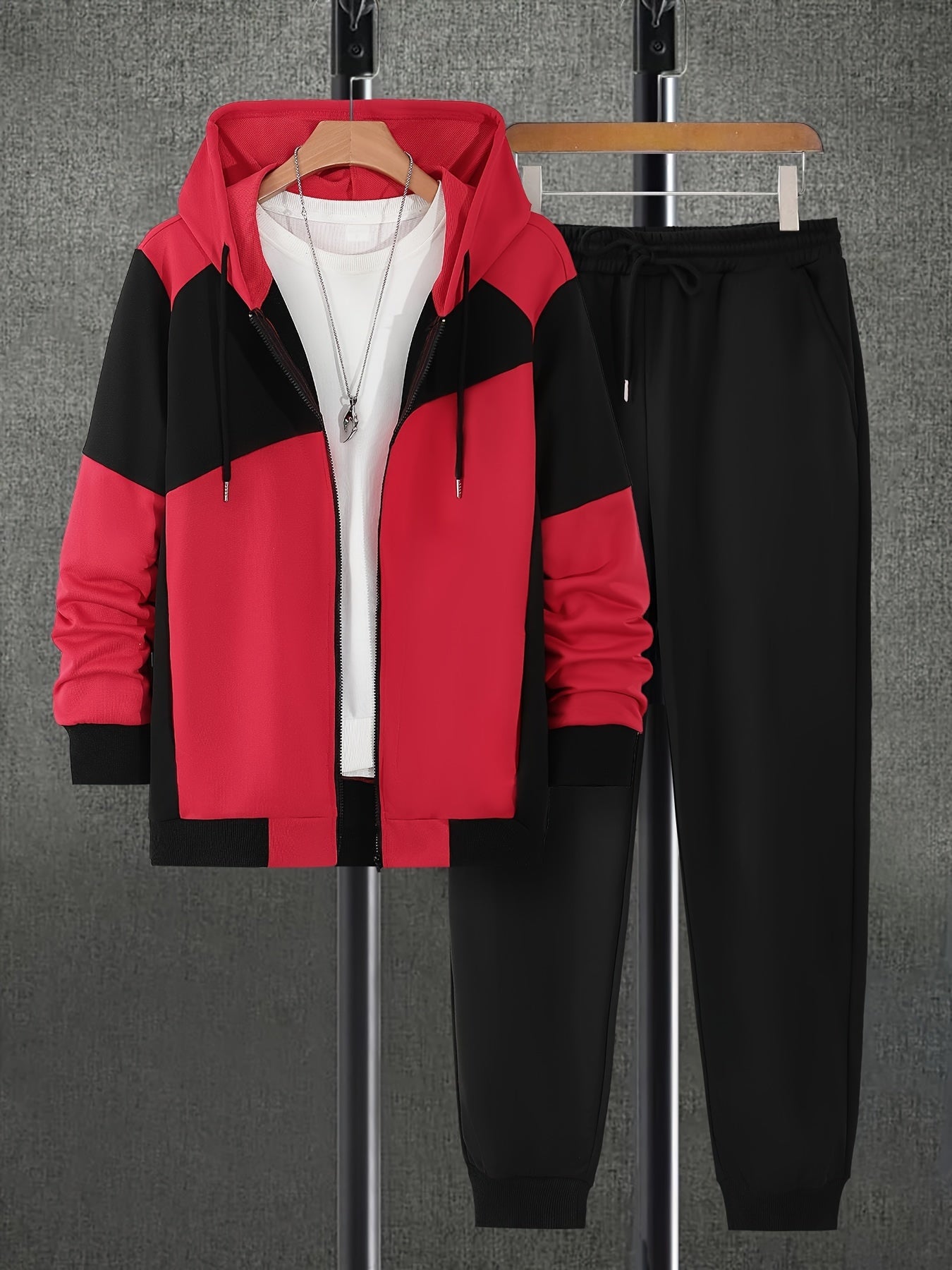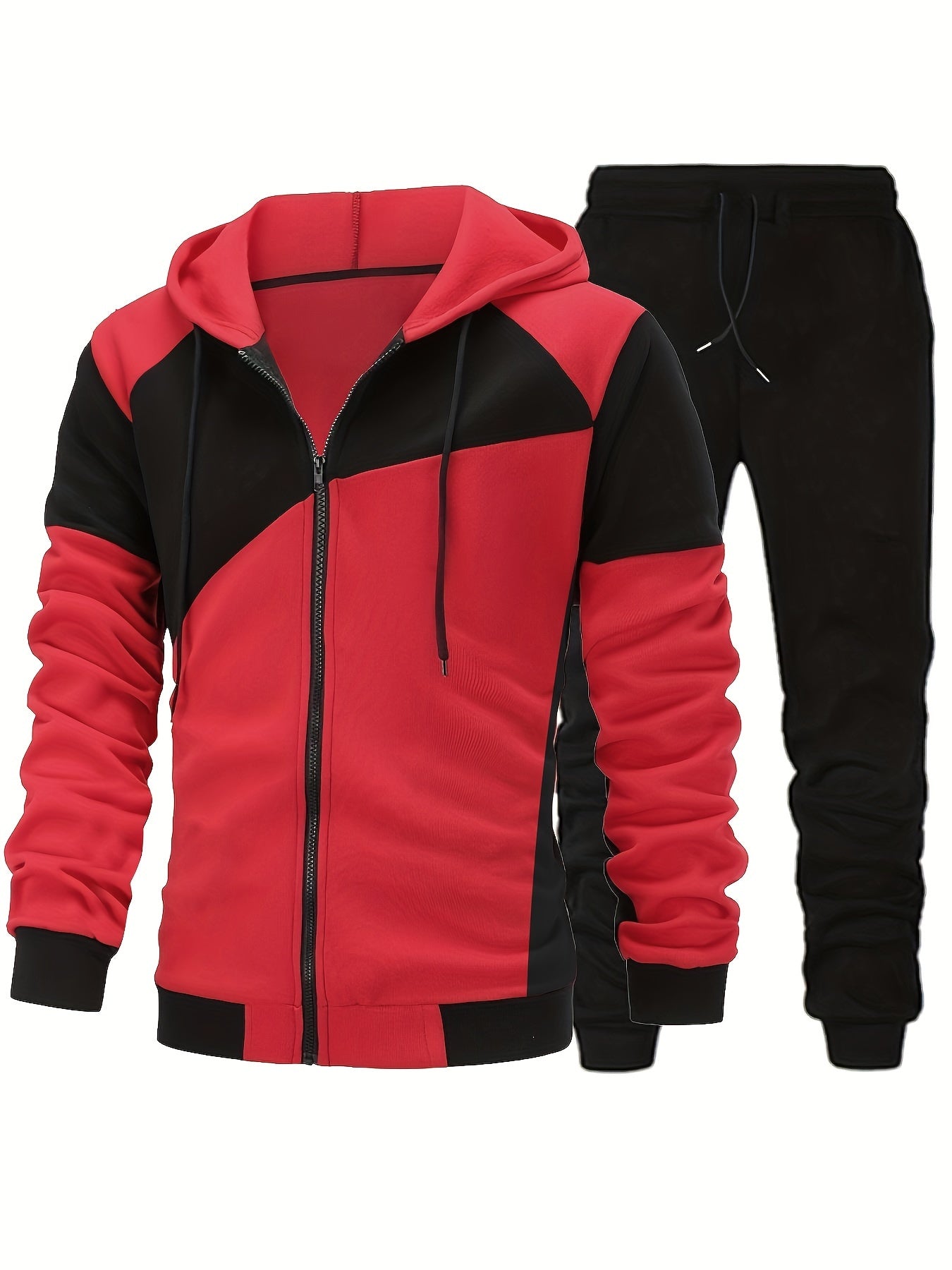 Men's Autumn Color-Blocked Zip-Up Hoodie with Side Pockets And Solid Color Drawstring Long Pants Set.