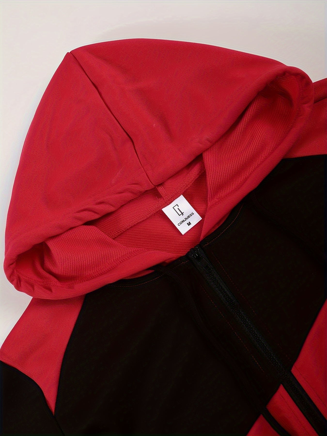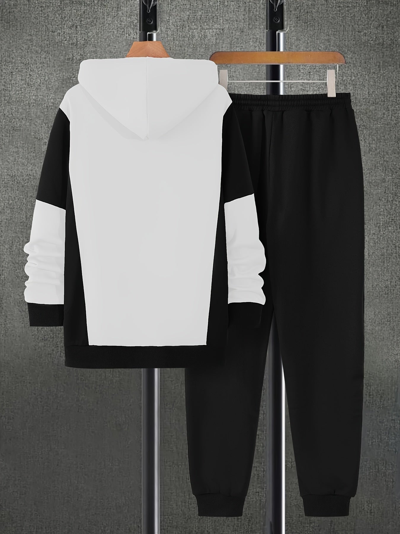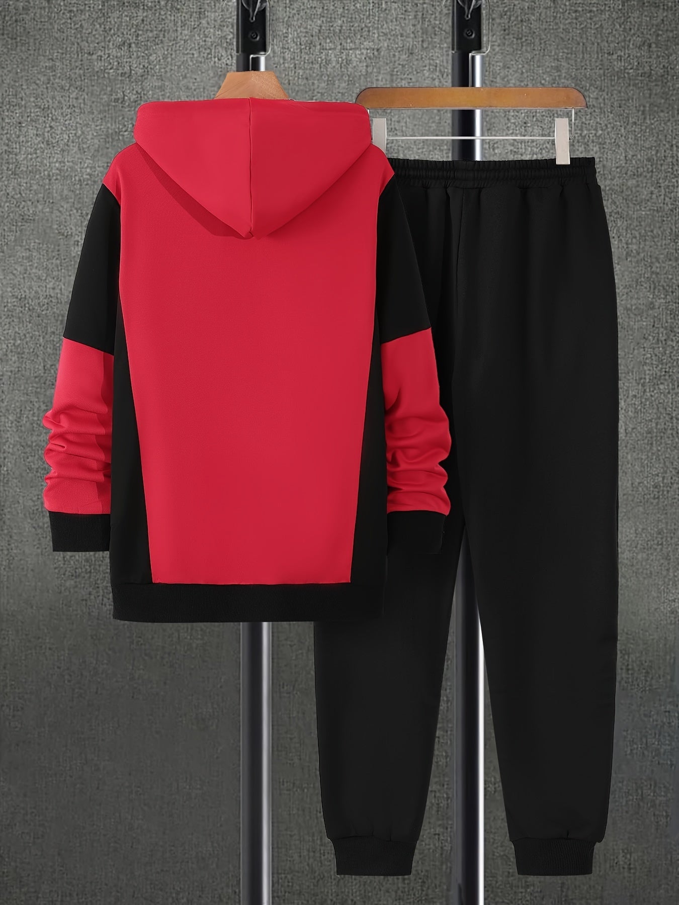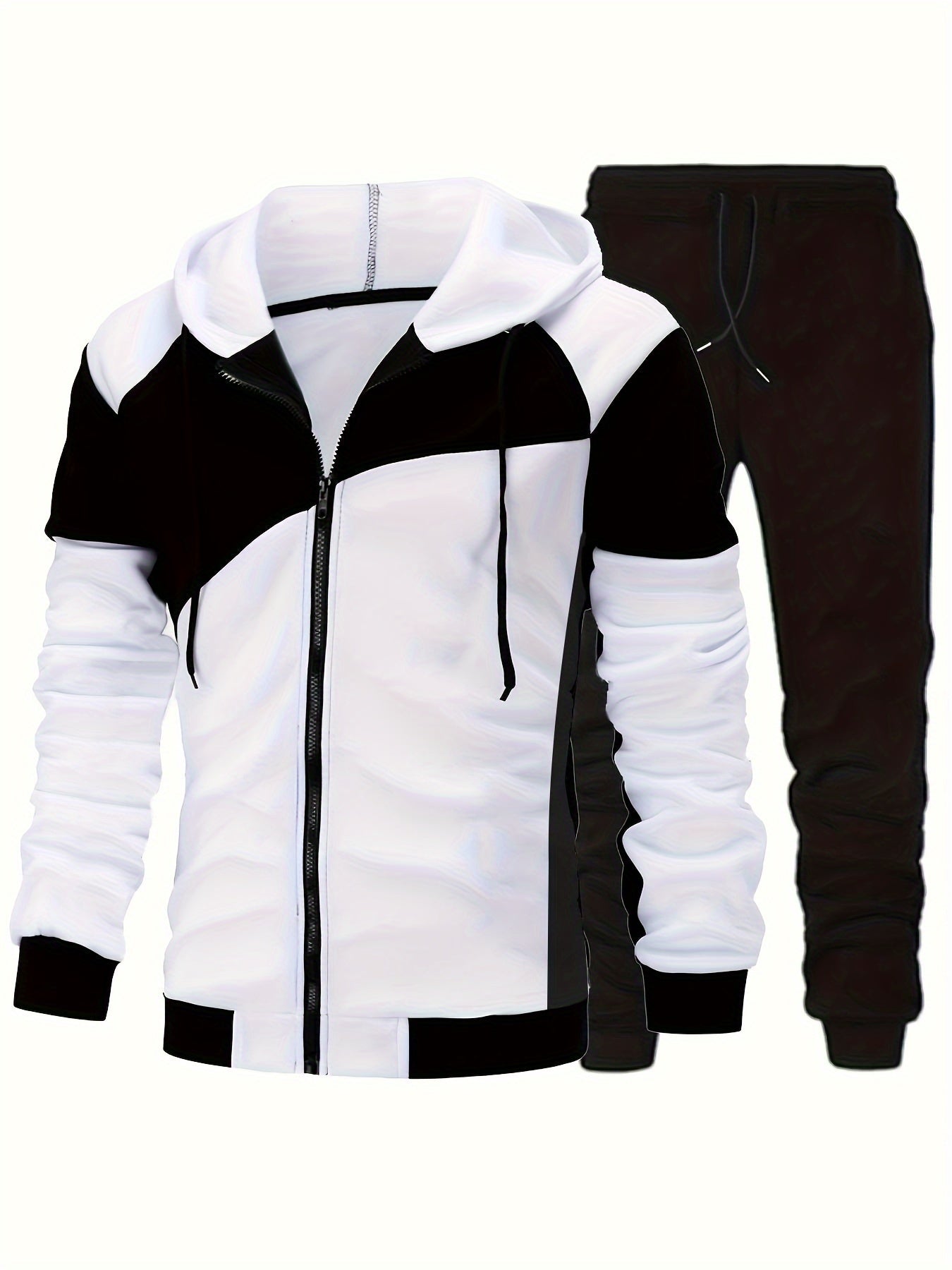 Men's Autumn Color-Blocked Zip-Up Hoodie with Side Pockets And Solid Color Drawstring Long Pants Set.
