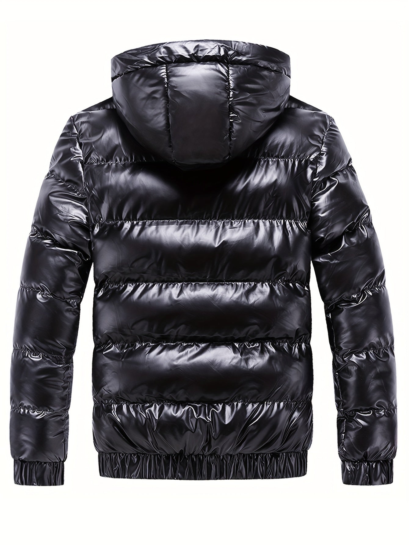 Men's Black Glossy Finish Jacket with Hood - Winter Coat, Zippered Pockets, Ribbed Cuffs & Waistband, Hand Wash Only, Regular Fit for Autumn & Cold Weather