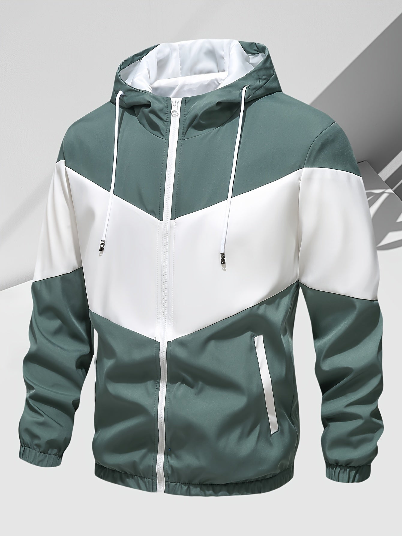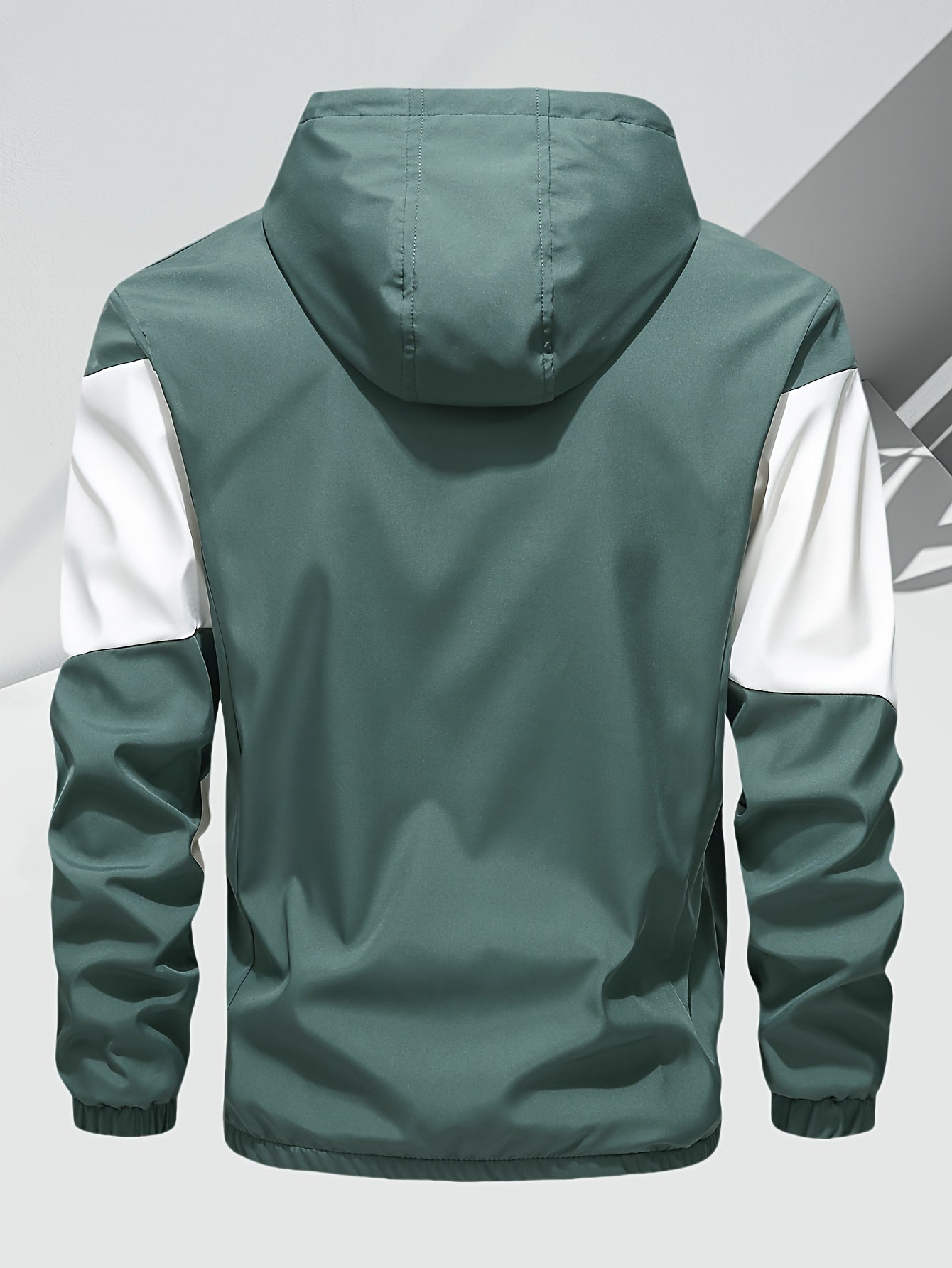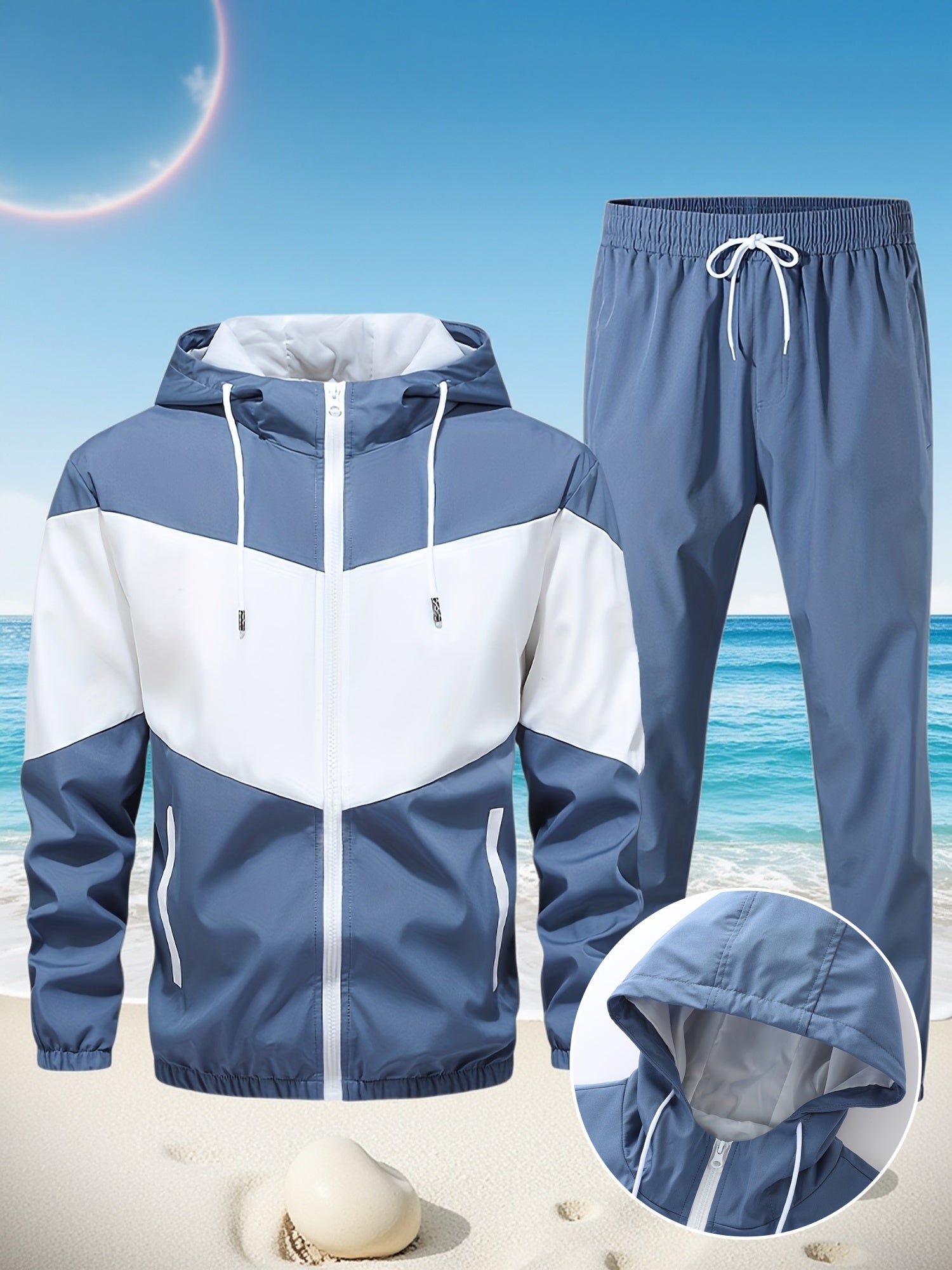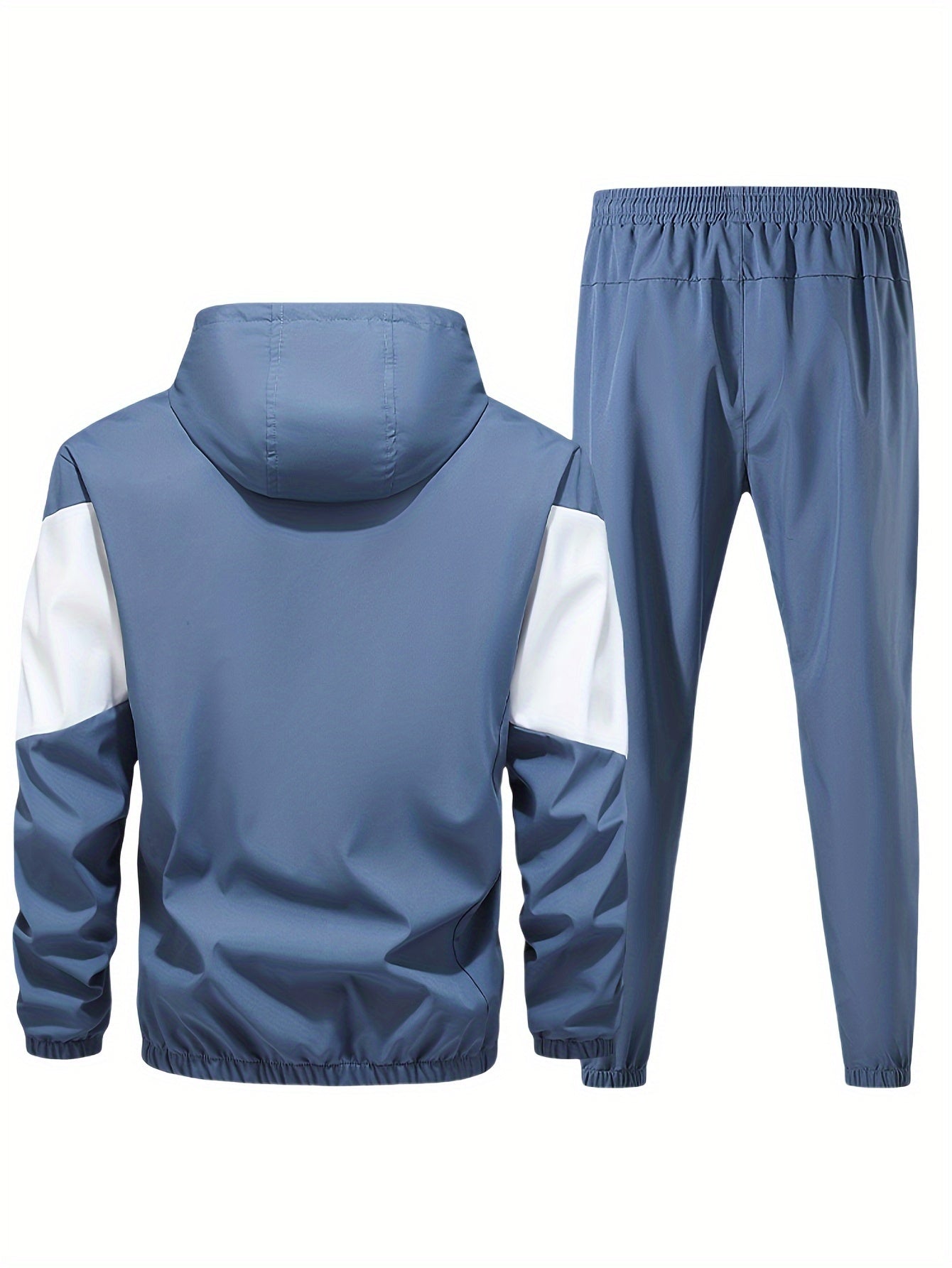 Men's Casual 2-Piece Outfit, Stylish Color Block Zip Up Hooded Jacket, Breathable Solid Color Drawstring Pants