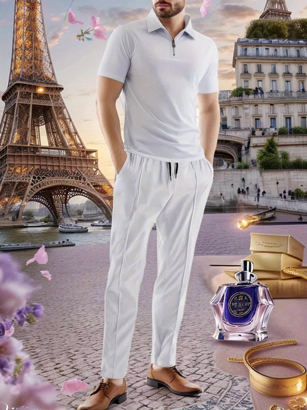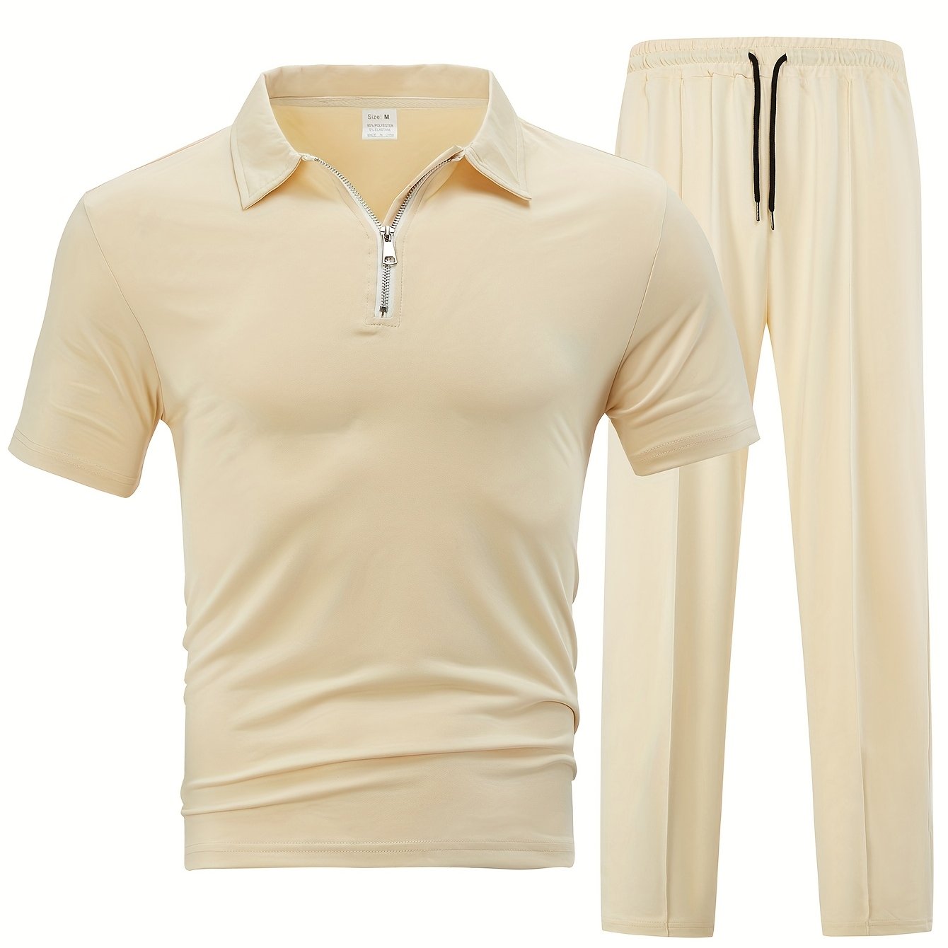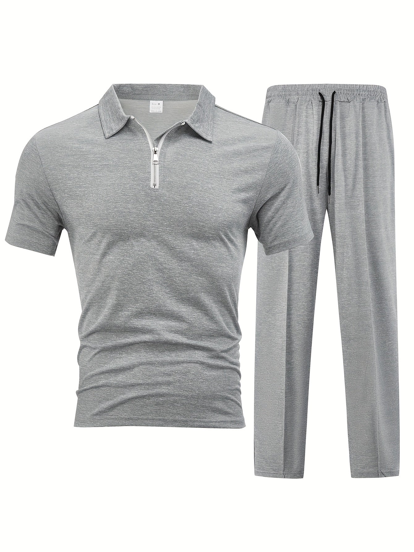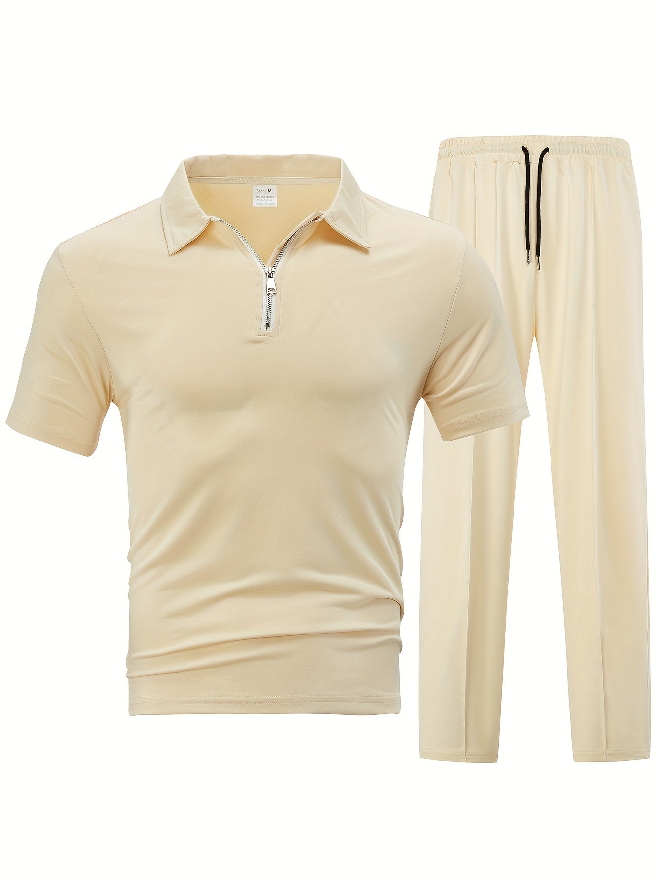 Men'S Casual 2pcs Set Knitted: Zipper Short Sleeve Shirt and Drawstring Pants - Black, Polyester, Suitable for Spring/Summer Casual Wea