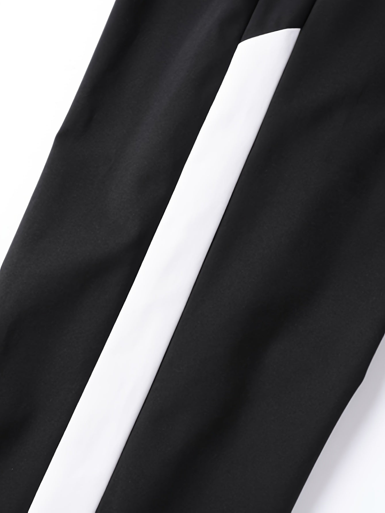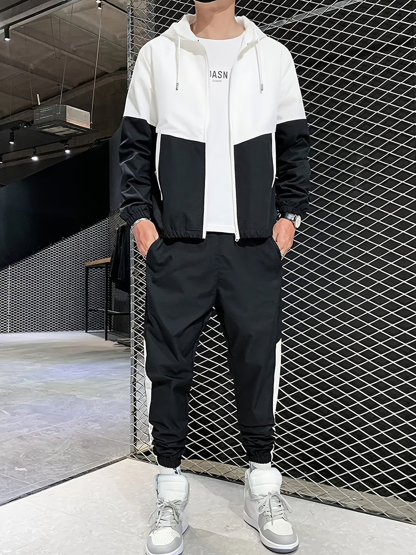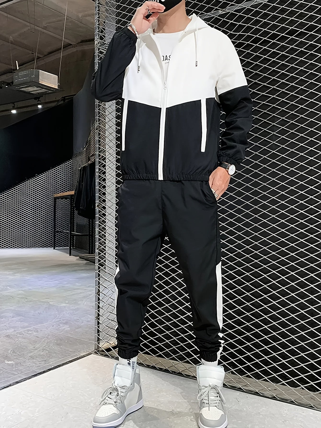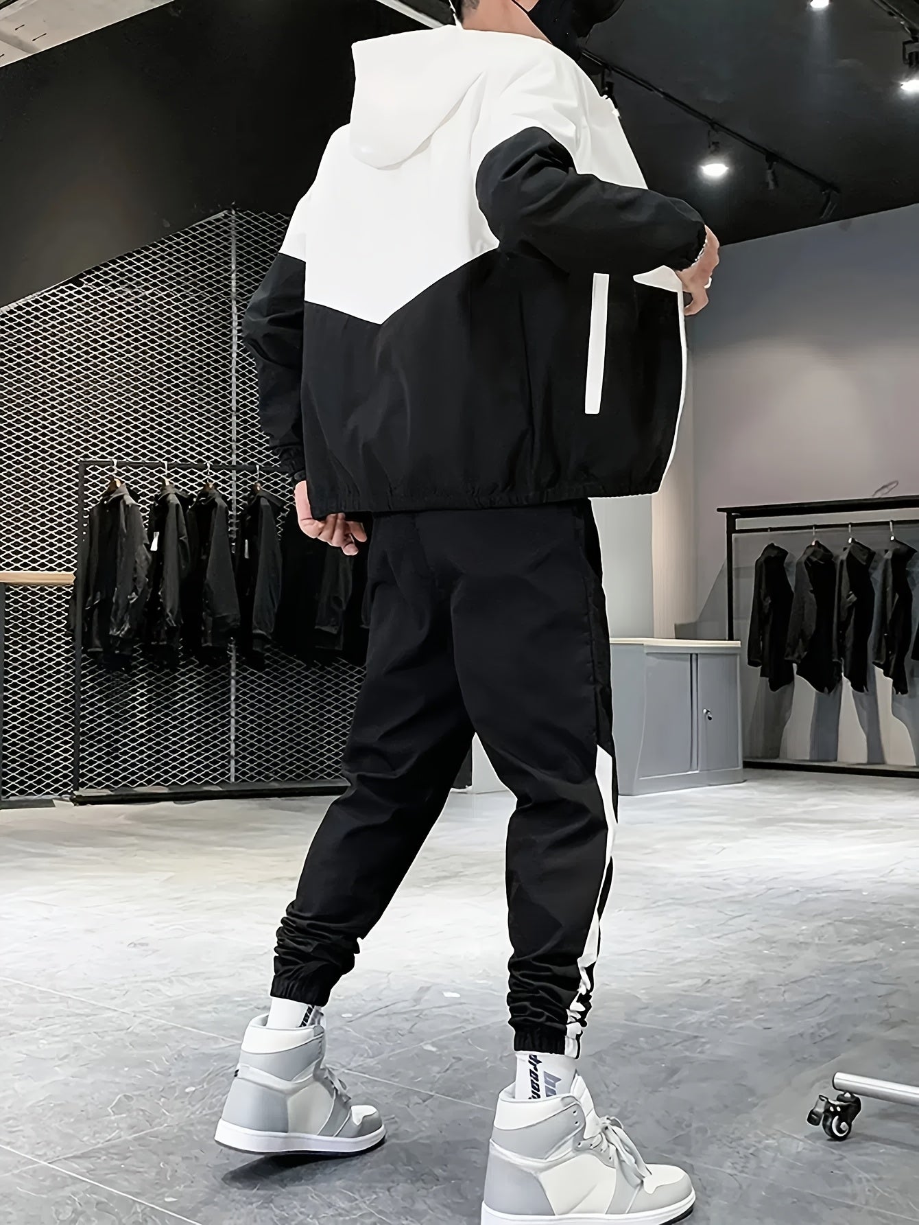 Men's Casual Athletic Hoodie and Pants Set - Color Block Design, Polyester, Machine Washable, Spring/Fall Sportswear, Blue & White Two-Piece Outfit, Everyday Activewear|Modern Athletic Look|Polyester Sportswear