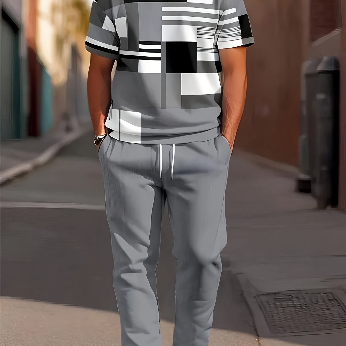 Men'S Casual Geometric Sweat Suit - Sporty Polyester Blend, Crew Neck, Short Sleeve, Regular Fit, All-Season Track Suit