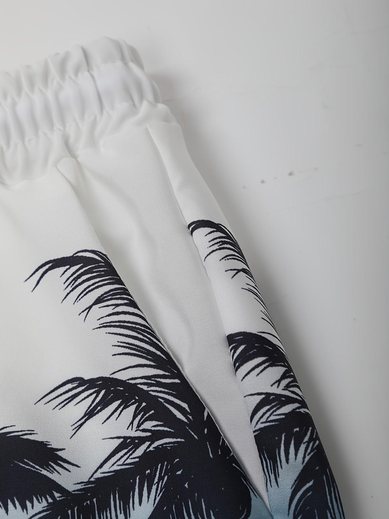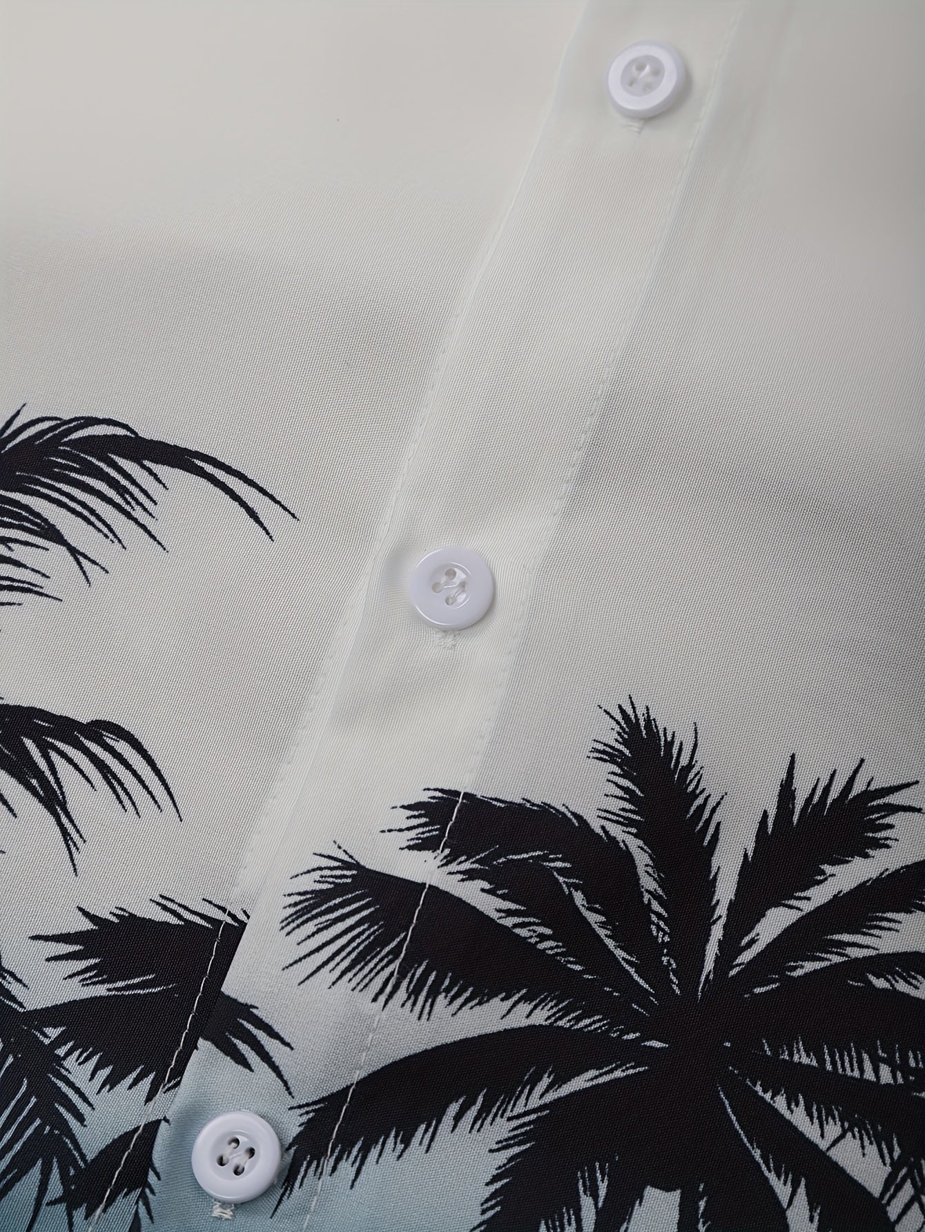 Men'S Casual Gradient Coconut Tree Short Sleeve Shirt + Shorts 2pcs Set - Tropical Palm Print, Button-Up Collared Design, Lightweight Polyester Blend for Spring/Summer Outings, Summer Outfit | Tropical Print | Lightweight Fab