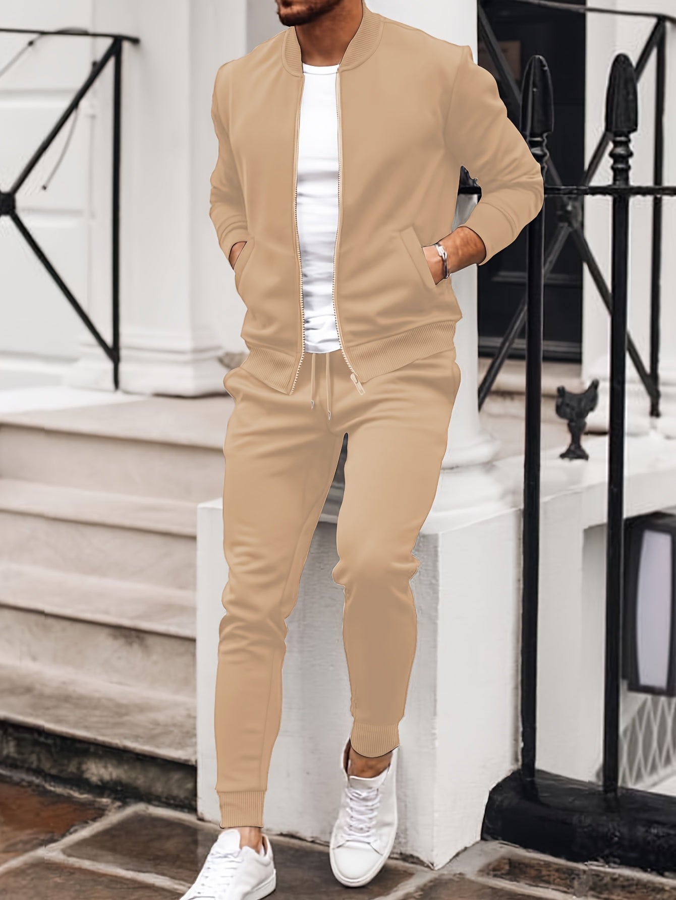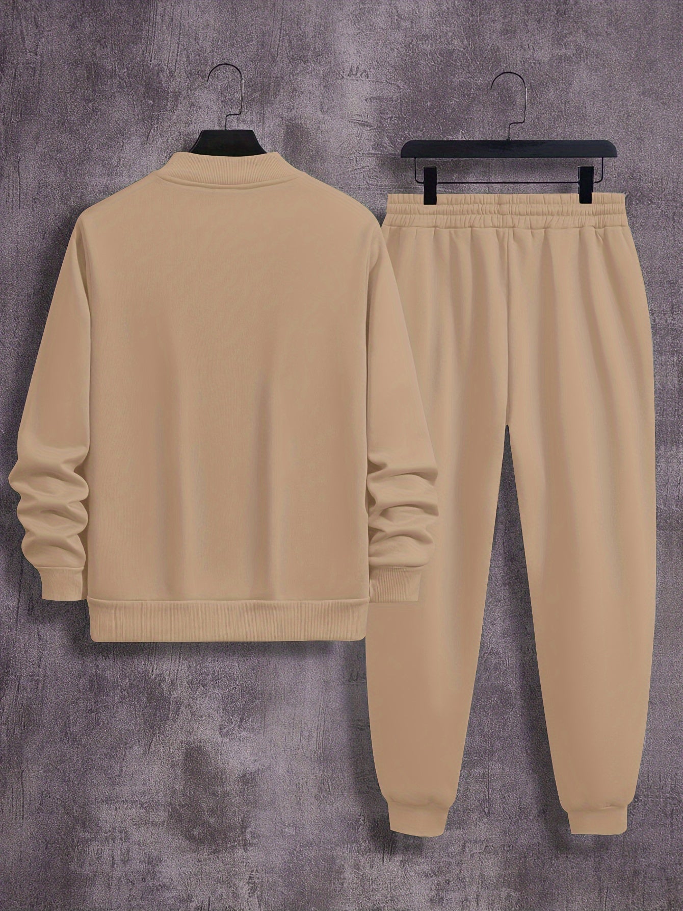 Men'S Casual Polyester Sweatsuit Set with Baseball Collar and Slight Stretch - Solid Color Long Sleeve Knit Fabric Track Suit for Fall/Winter