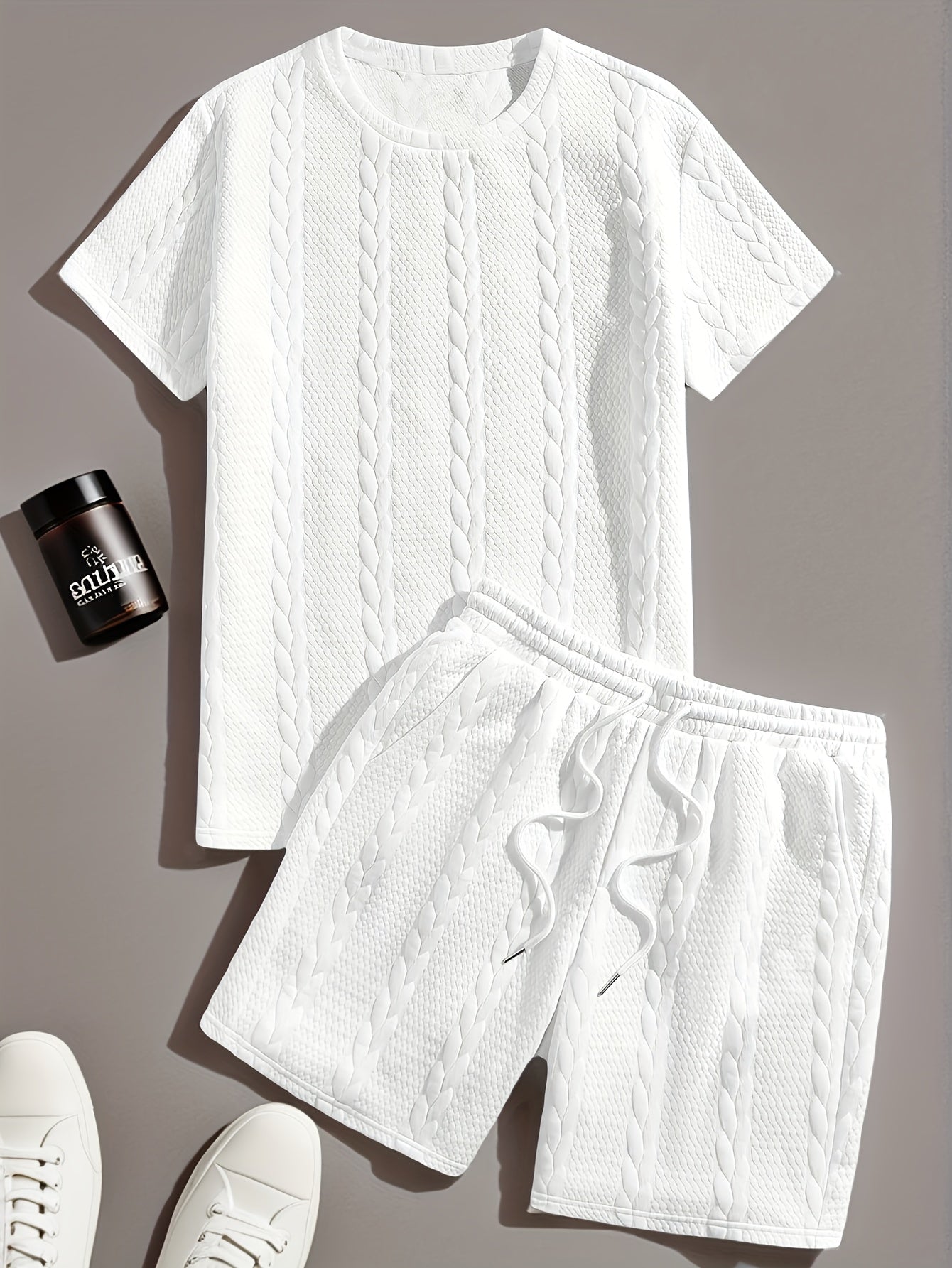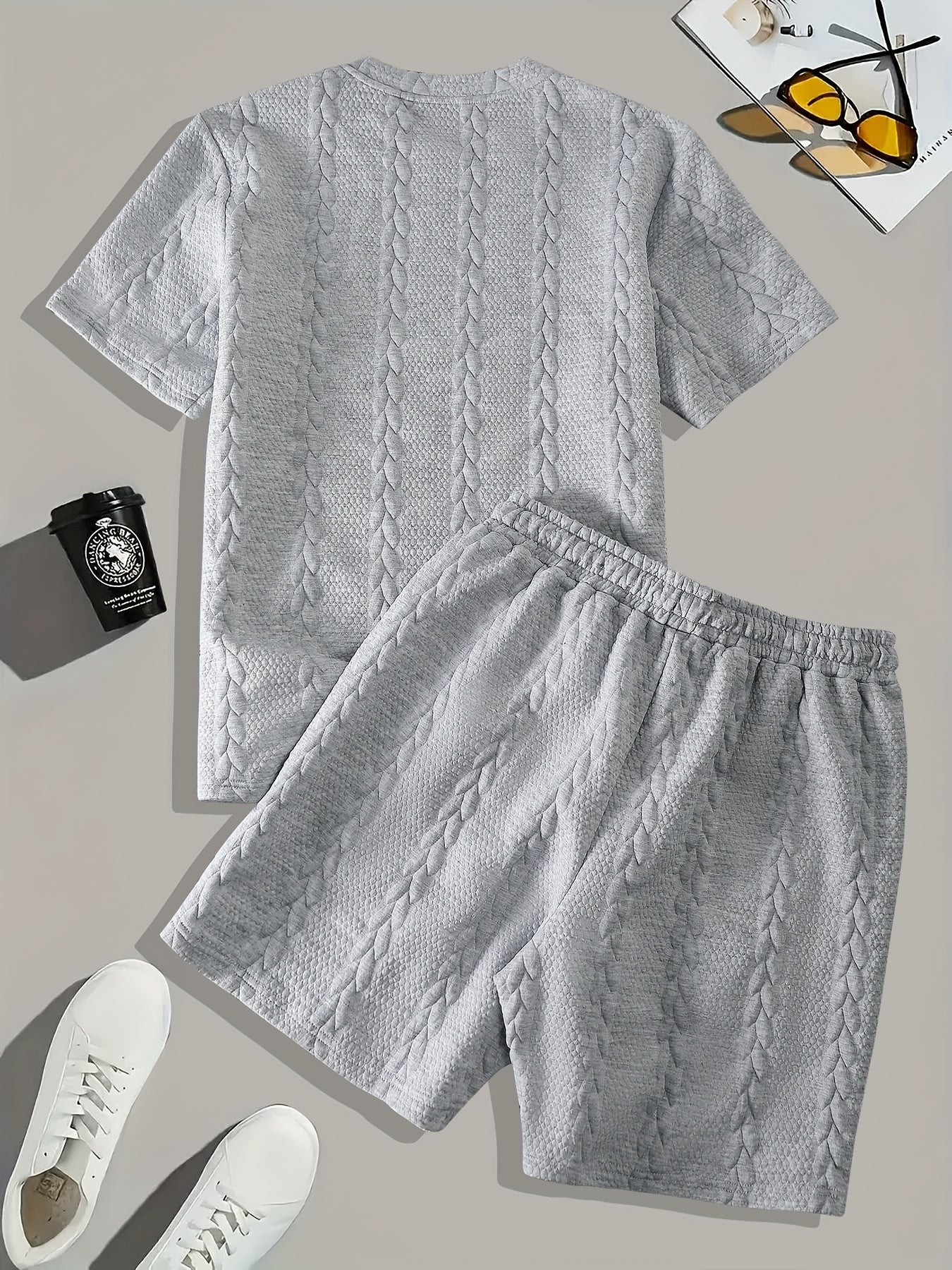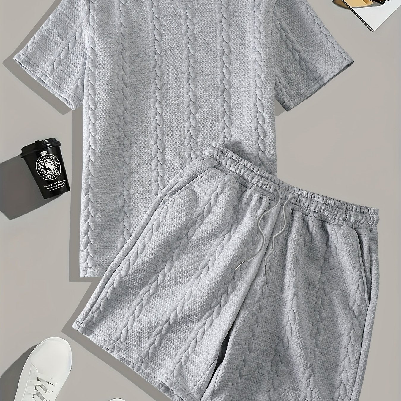 Men'S Casual Short Sleeve T-Shirt and Shorts Set - Knit, Light Gray, Two-Piece, All-Season Comfort, Drawstring Waist, Casual Style, Allseason Comfortwear | Casual Style Set | Knit Texture, Thick