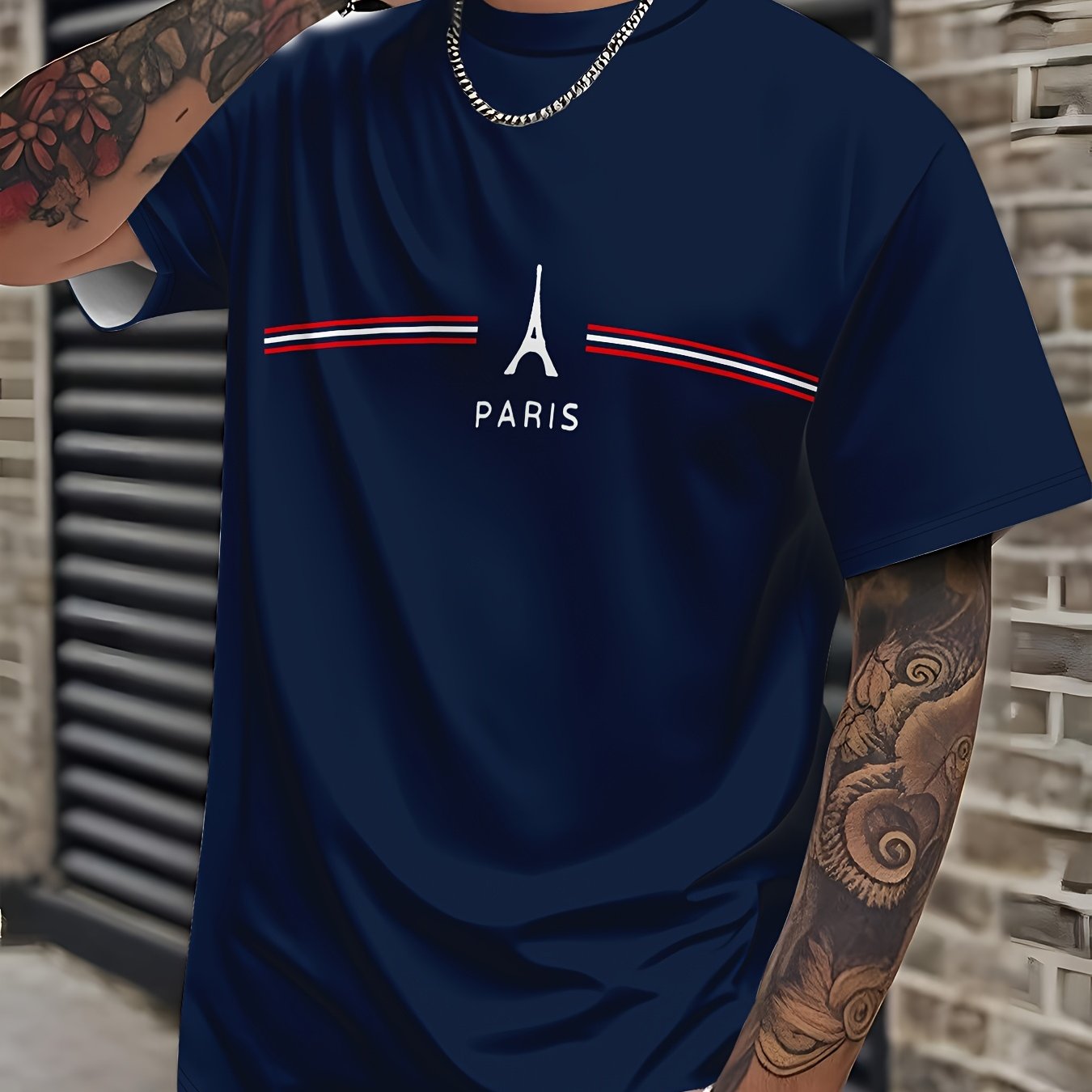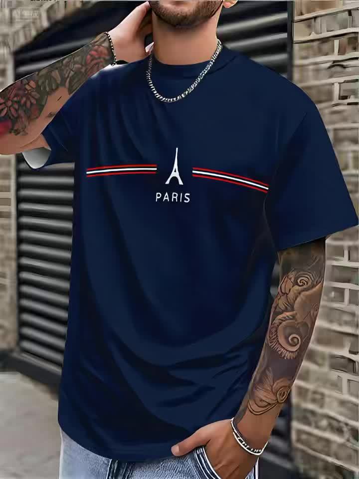 Men's Casual Short Sleeve T-Shirt with Paris Graphic Print - Navy Blue Relaxed Fit Round Neck Tee, Machine Washable for Casual Attire, Leisure Clothing, Classic Round Neck, Durable Casualwear, Weekend Attire, Simple Design, S