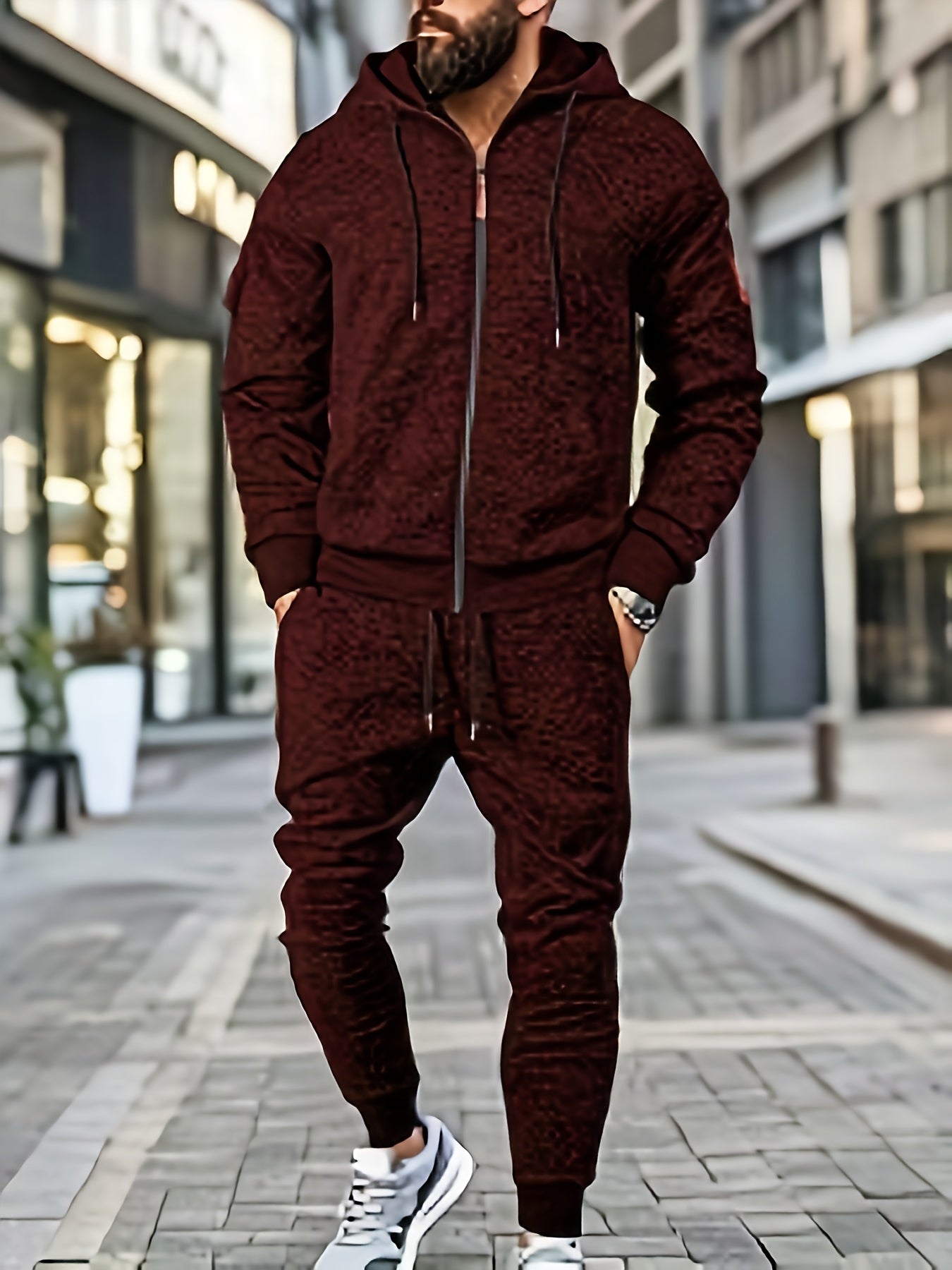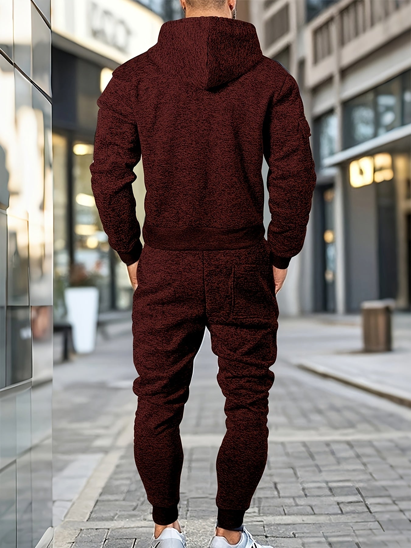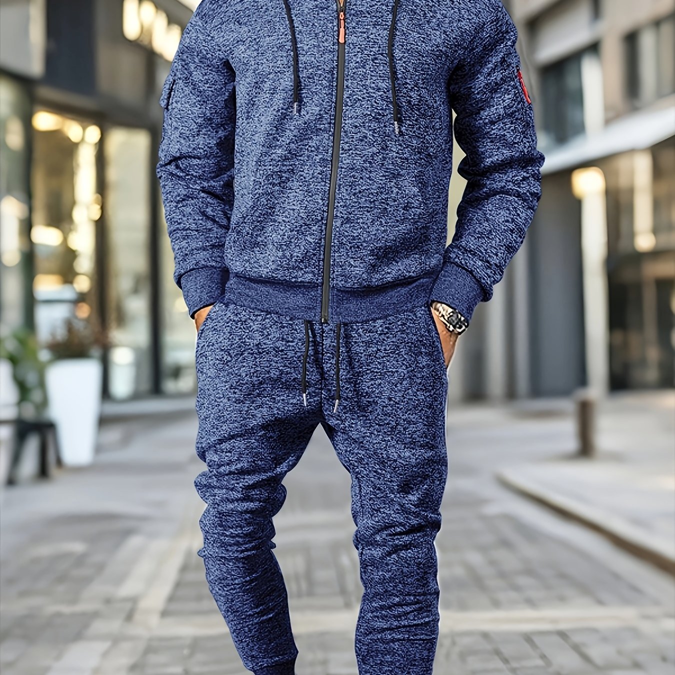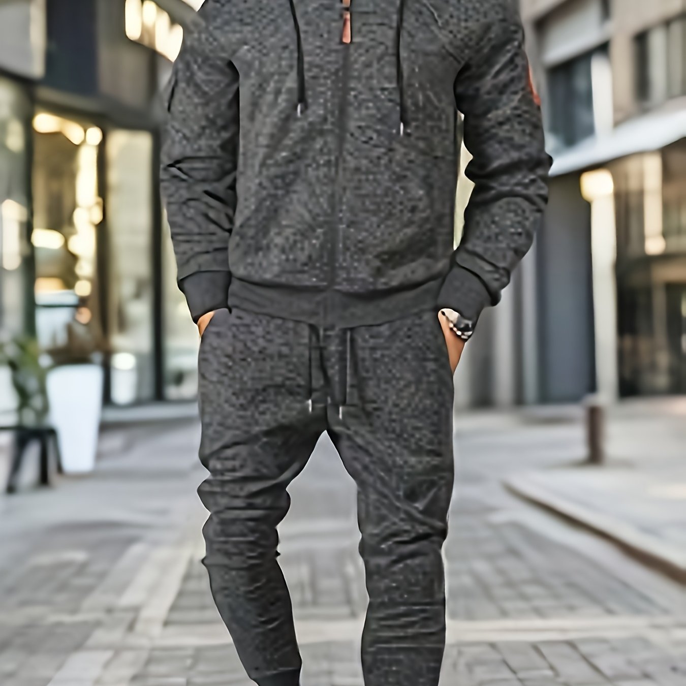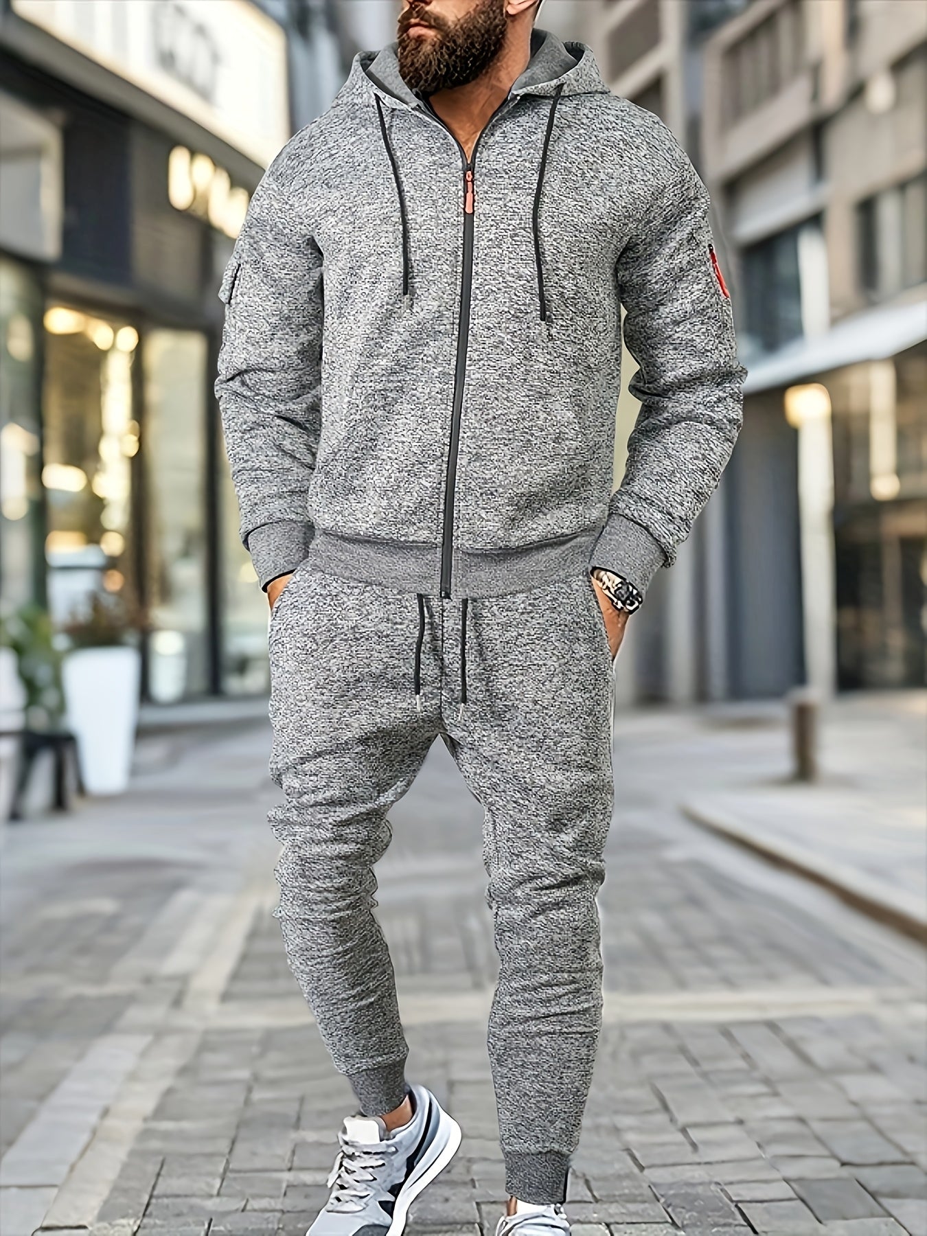 Men's Casual Sports Hoodie and Pants Set with Zipper, Drawstring, Fleece-Lined - Polyester Blend, Machine Washable