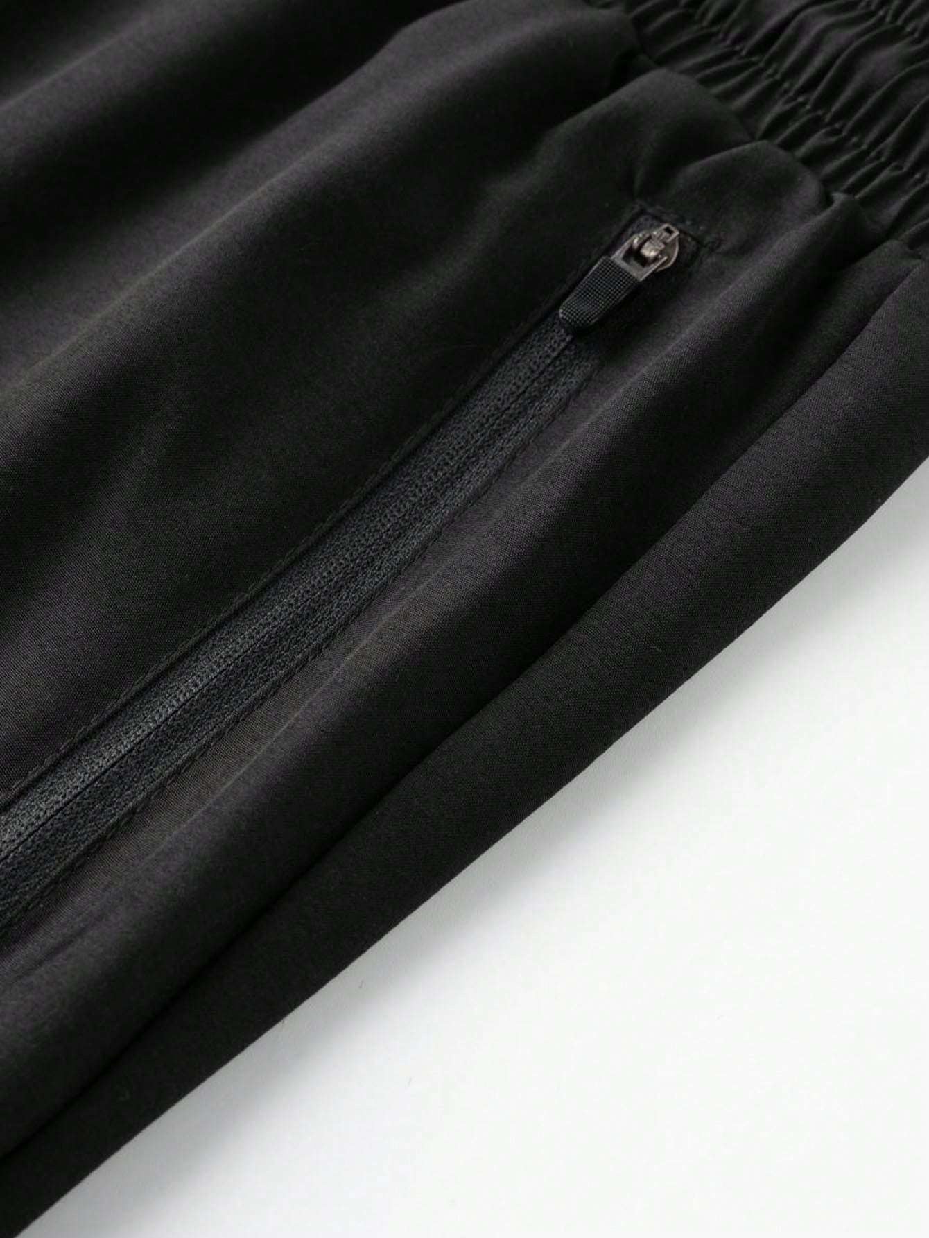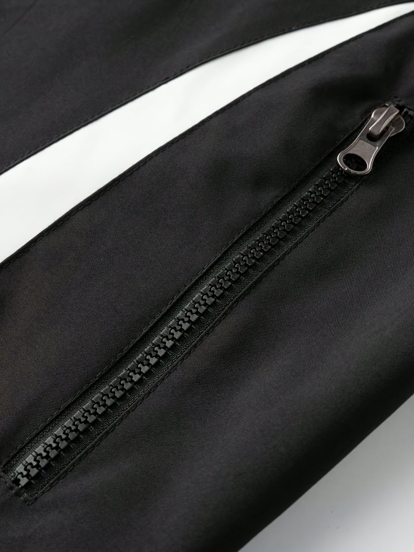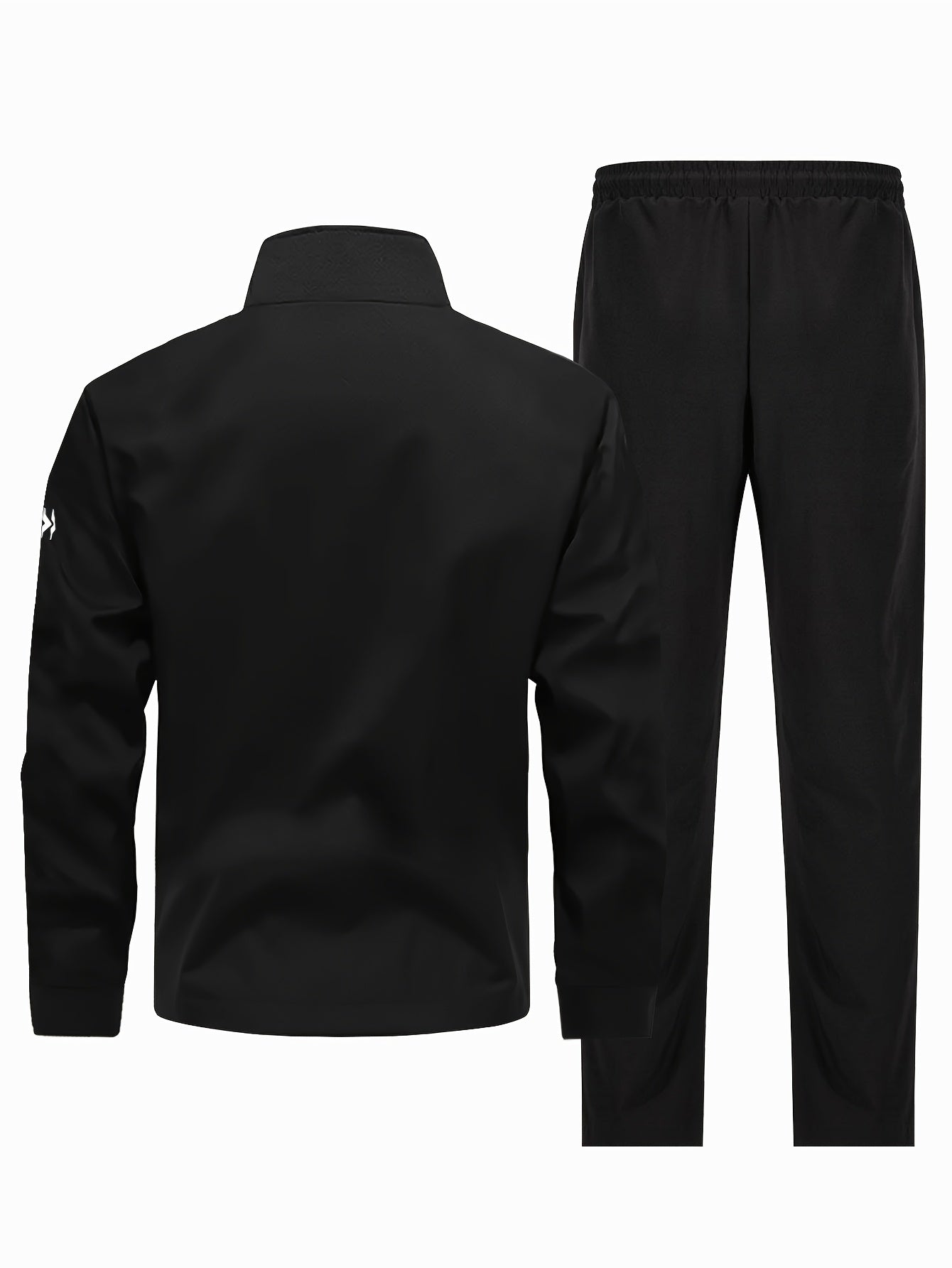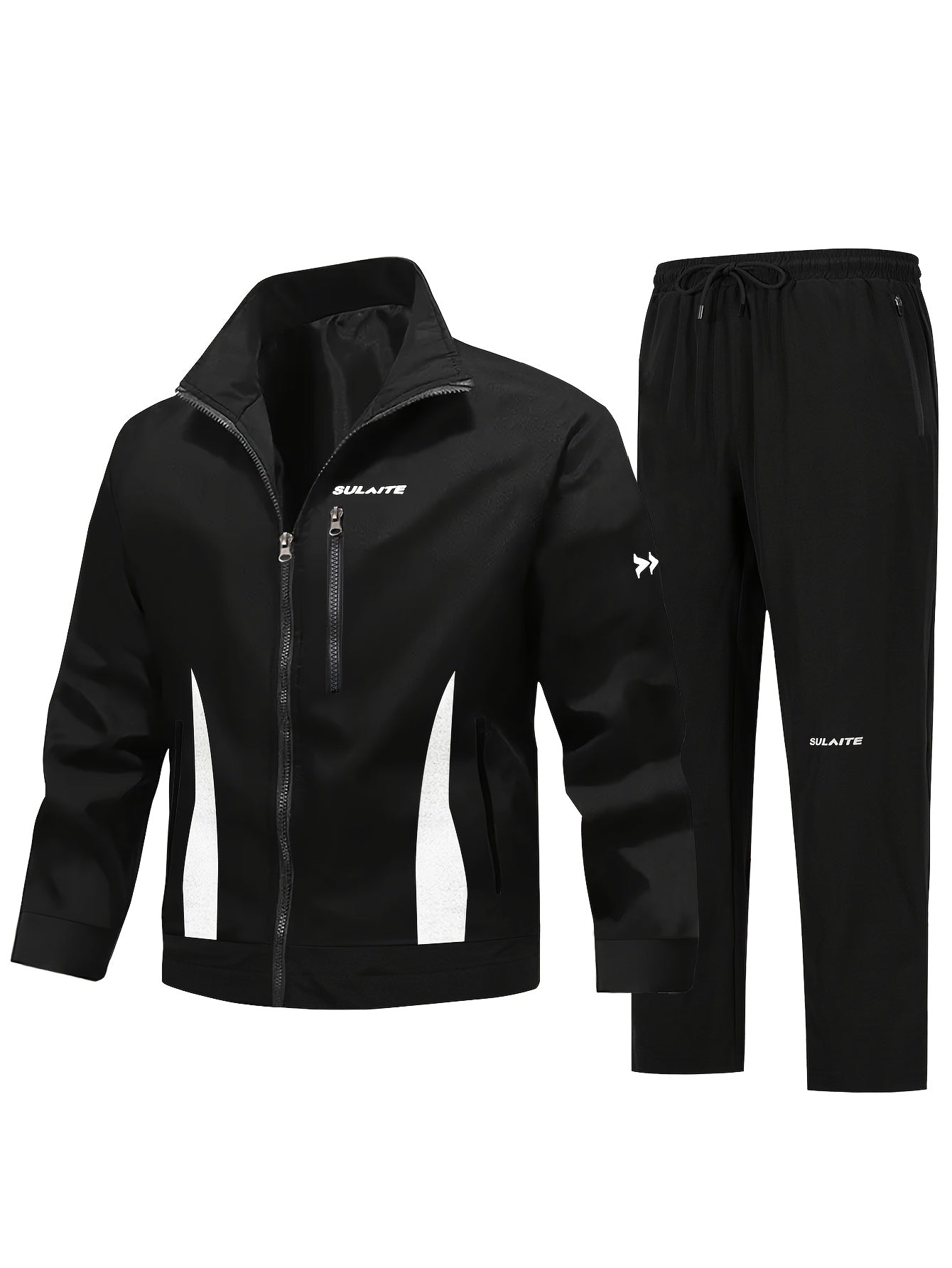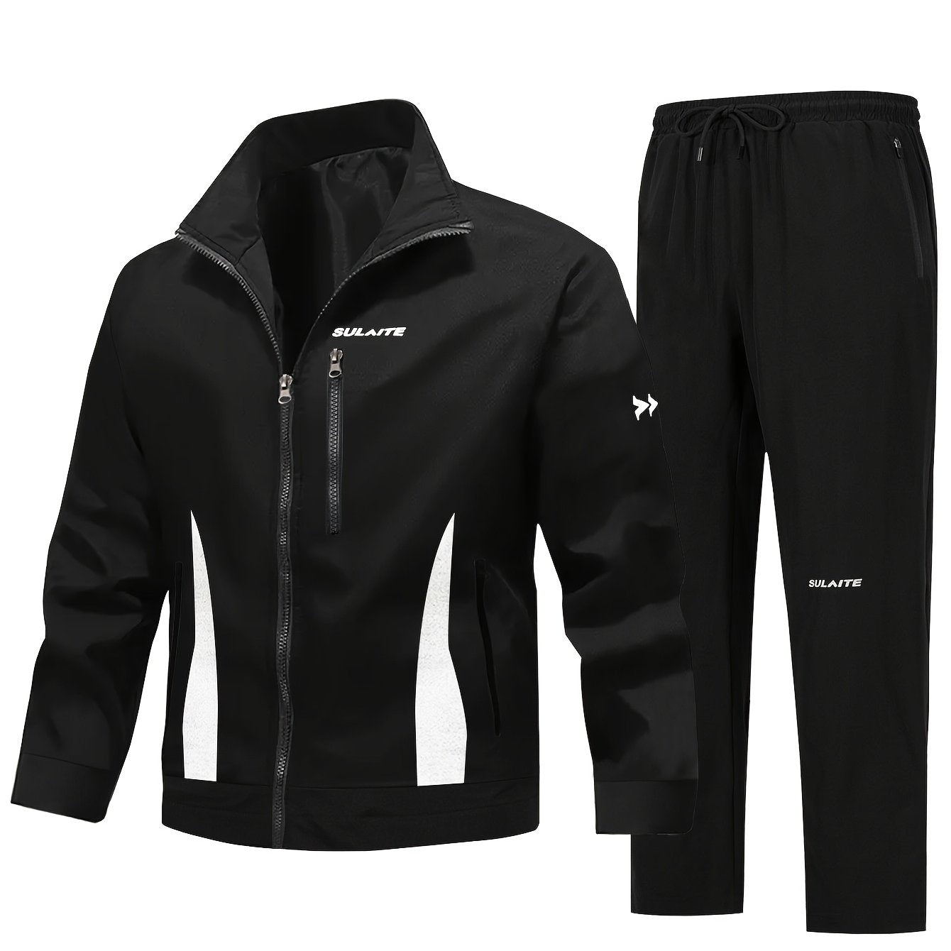Men'S Casual Sportswear Set - Black Jacket with Zipper Pockets & White Accents, Matching Pants, Perfect for Spring & Fall, Sportswear Outfit|Zippered Jacket|Functional Pockets