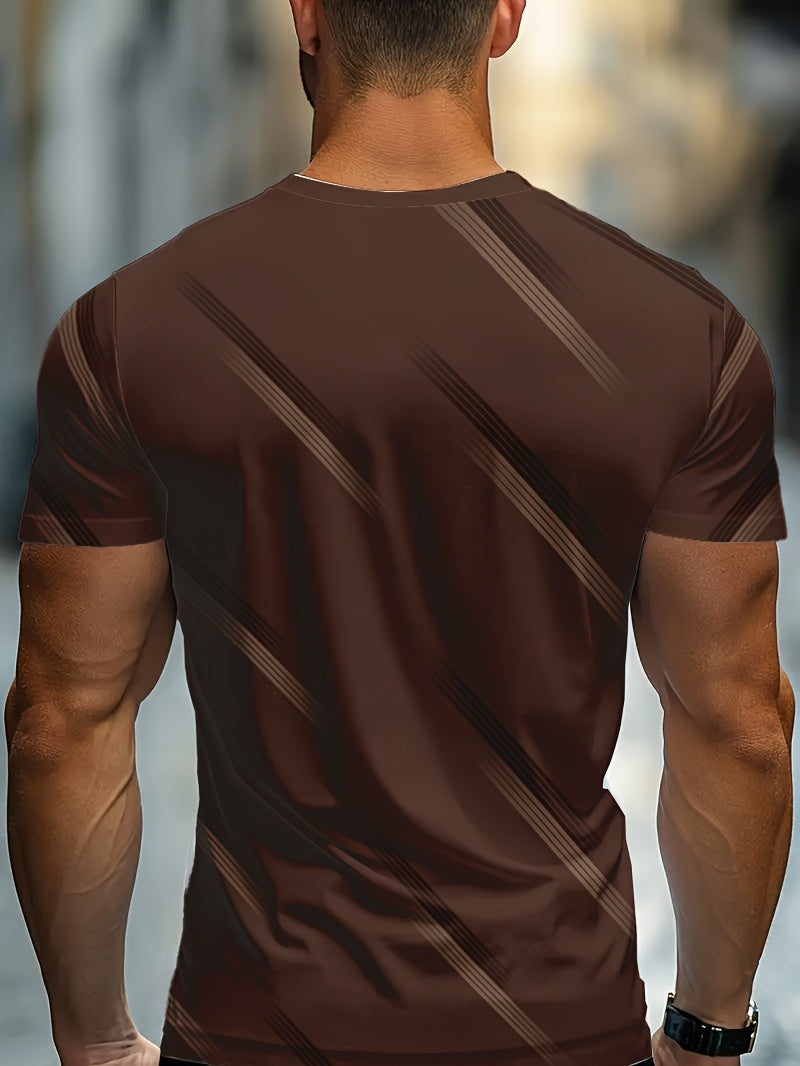 Men's Casual Striped T-Shirt - Brown with White Contrast Stripes, Regular Fit Round Neck, Machine Washable for Everyday Comfort, Summer Clothing, Modern Look, Nontransparent Fabric