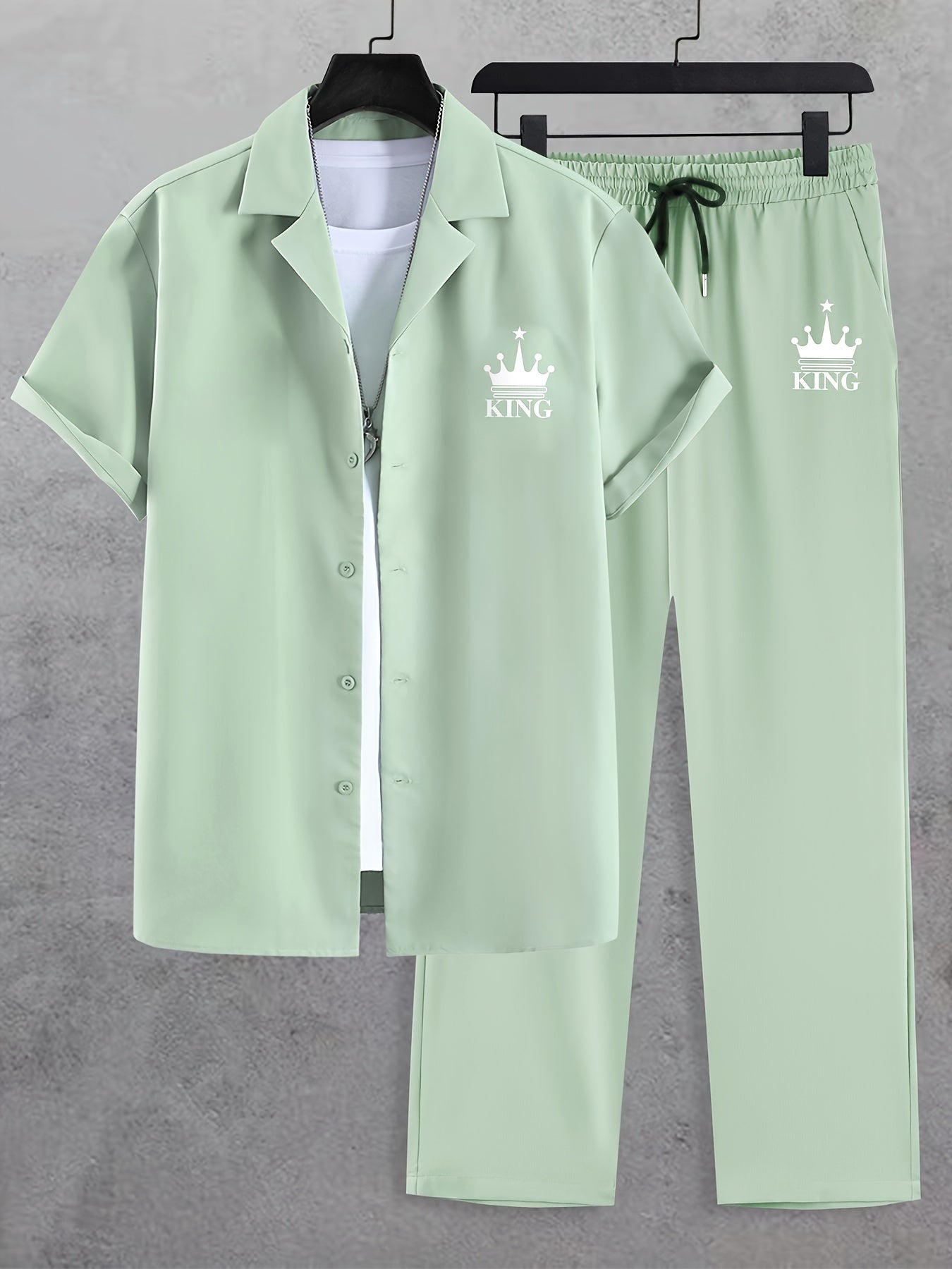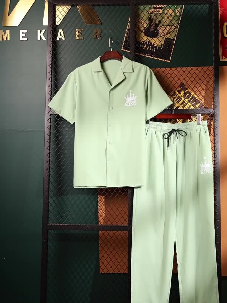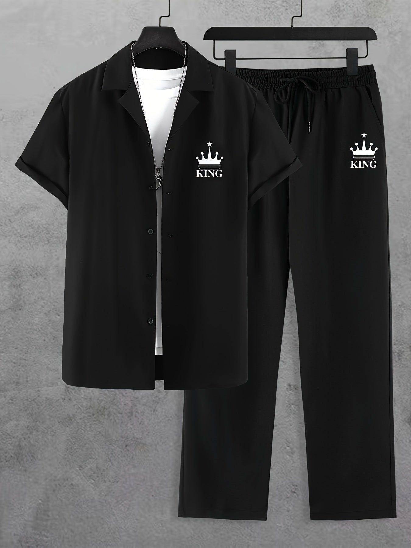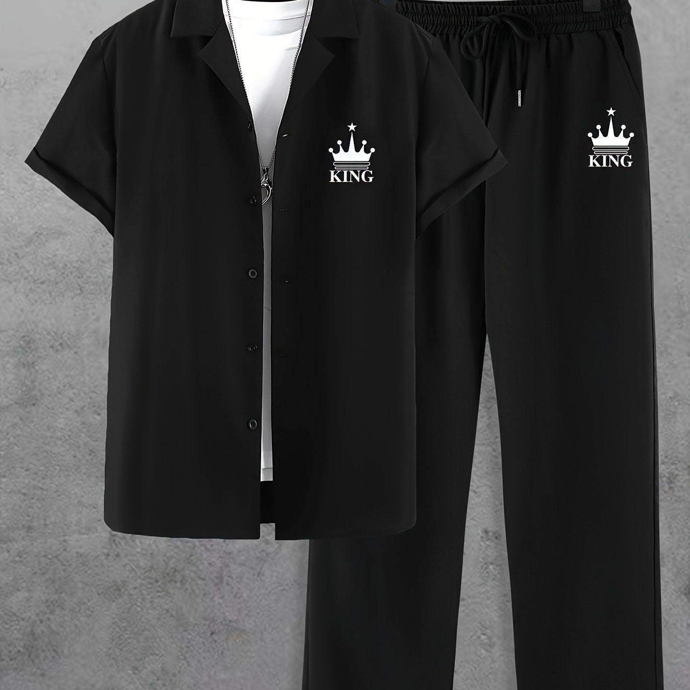 Men'S Casual Summer Crown Print Short Sleeve Button-Up Shirt & Pants Set - Black, Relaxed Fit, Non-Stretch Fabric, Lapel Collar, Stylish for Casual Attire, Casual Attire|Crown Print Design|Relaxed Fit Pants, Crown Shirt