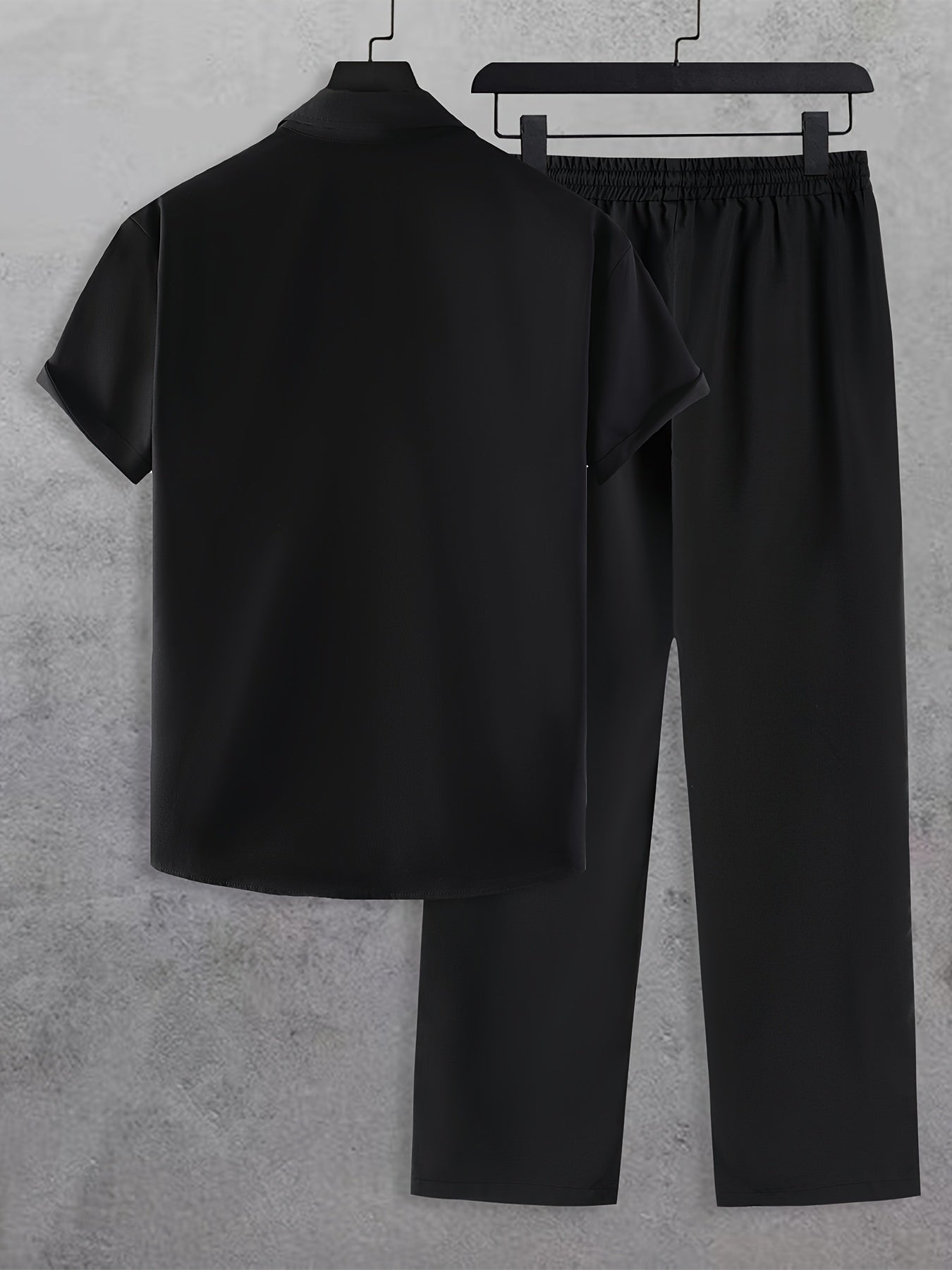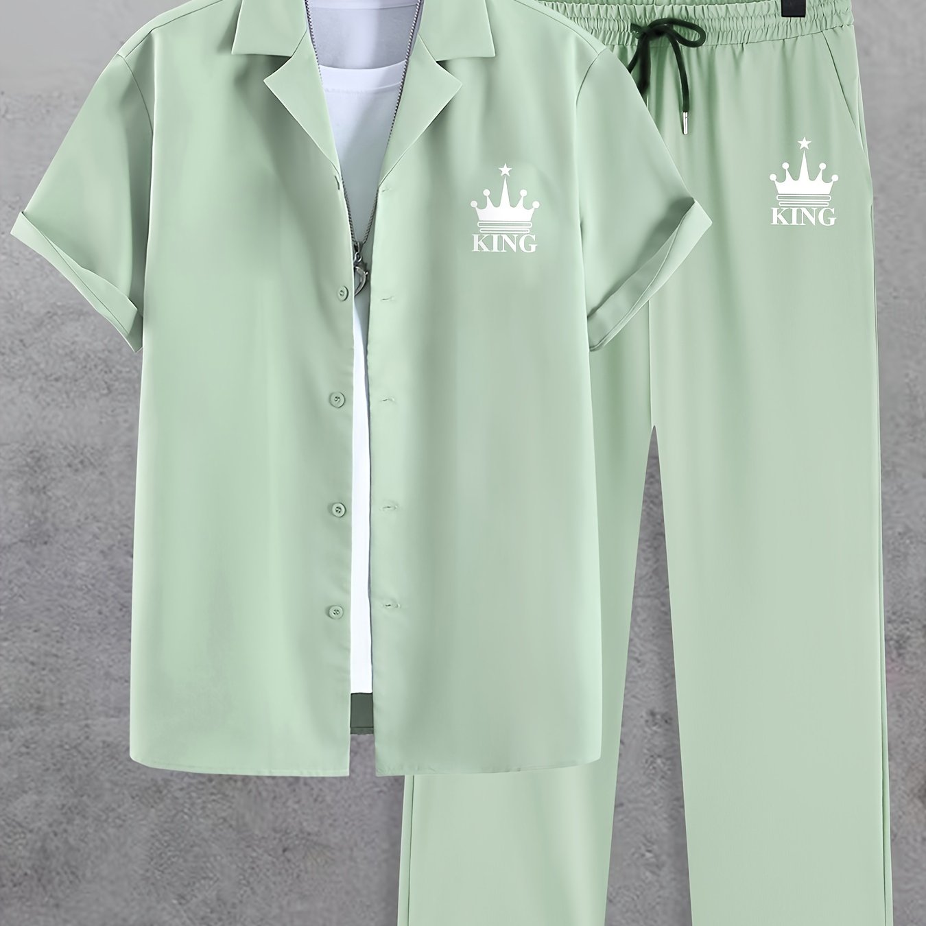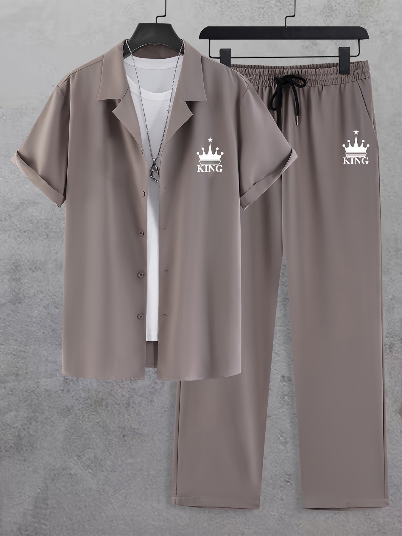 Men'S Casual Summer Crown Print Short Sleeve Button-Up Shirt & Pants Set - Black, Relaxed Fit, Non-Stretch Fabric, Lapel Collar, Stylish for Casual Attire, Casual Attire|Crown Print Design|Relaxed Fit Pants, Crown Shirt