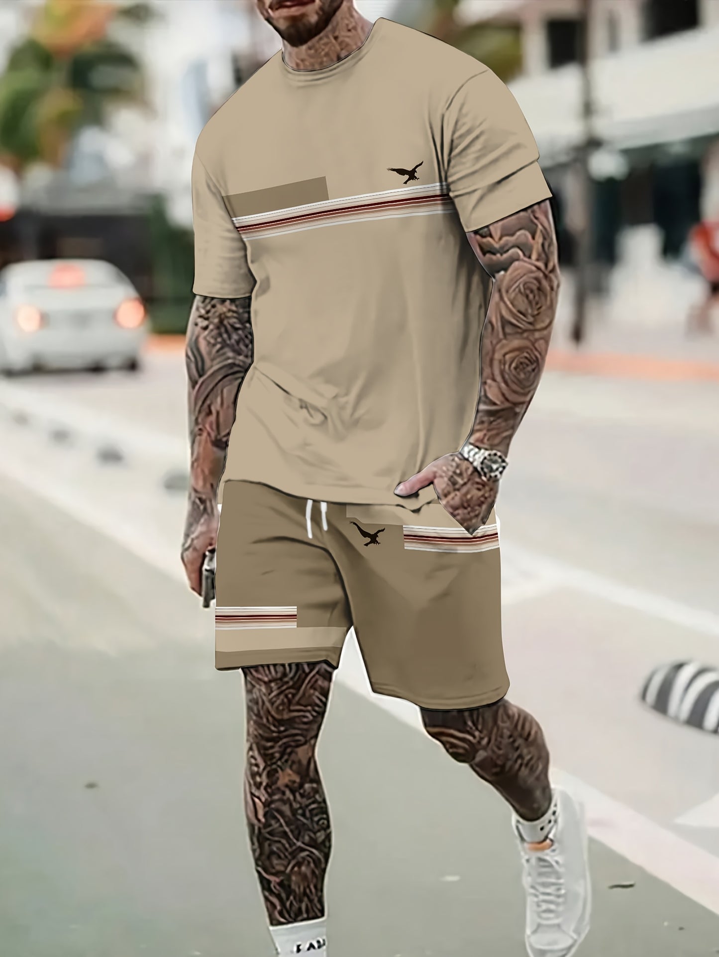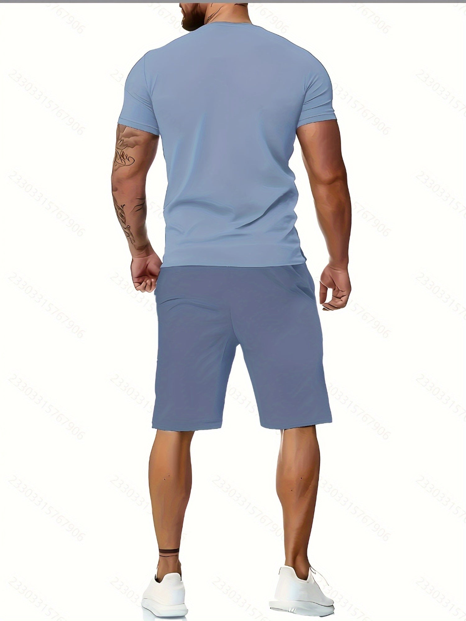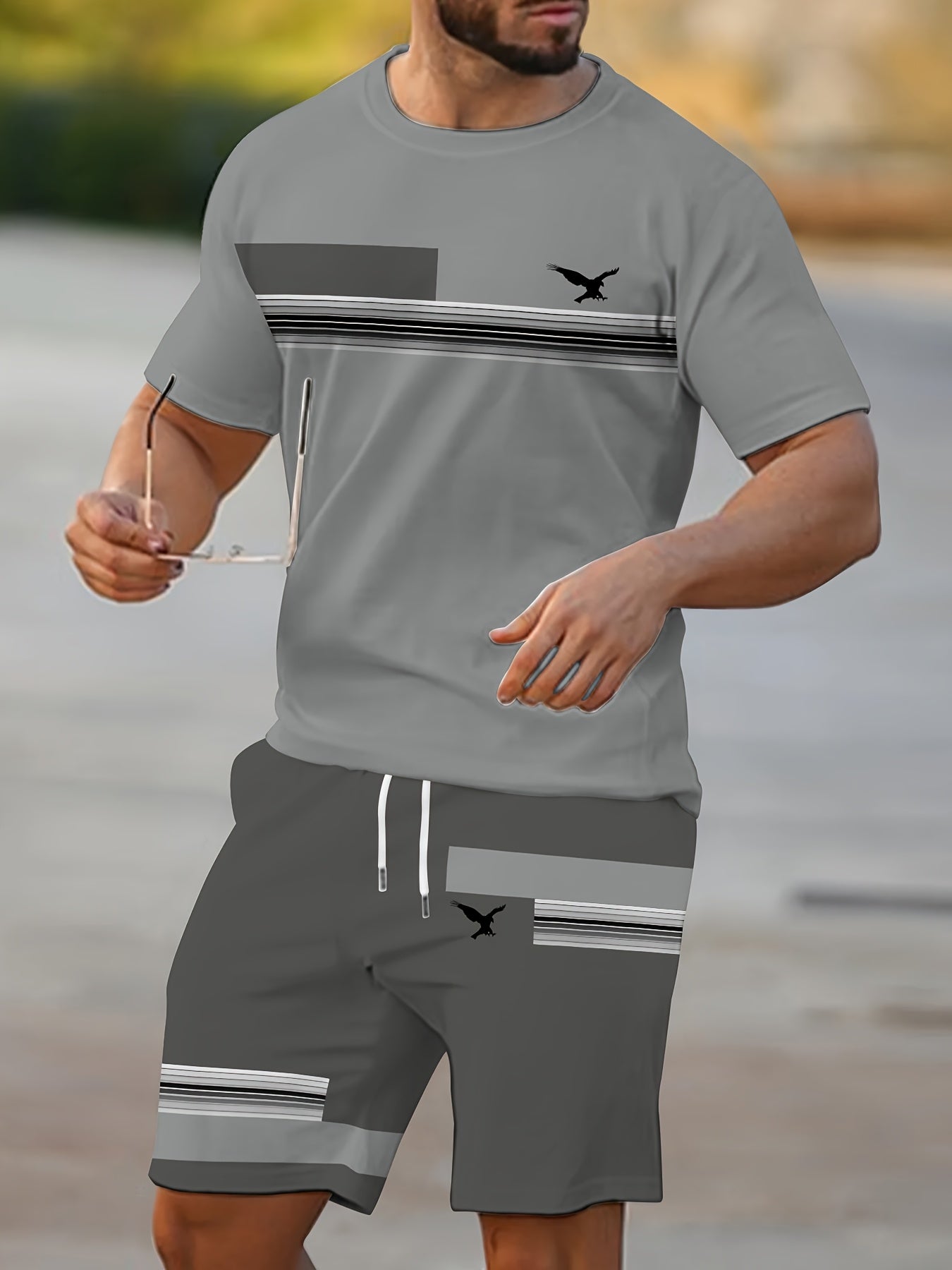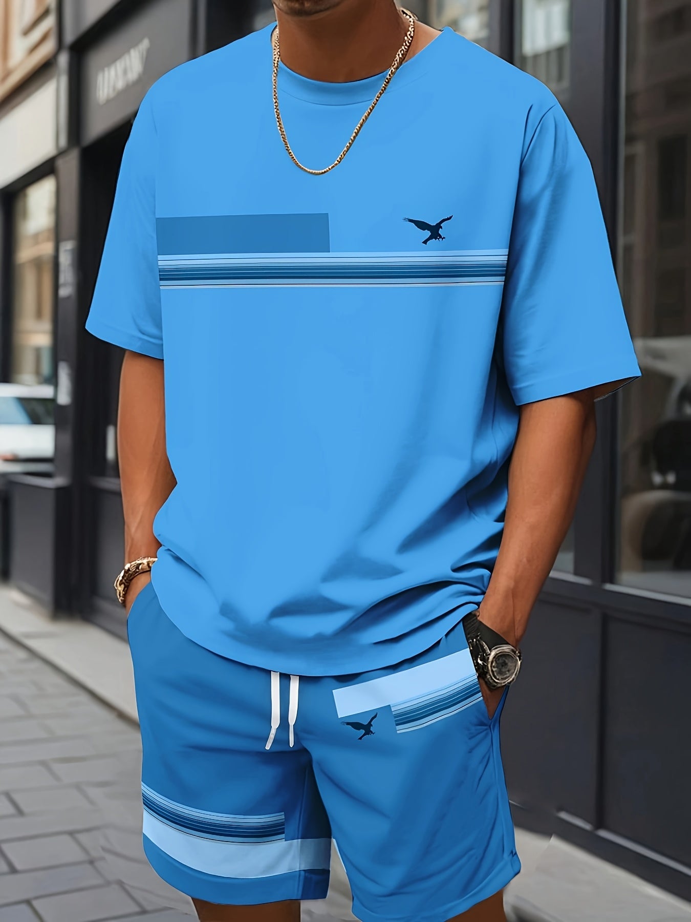 Men'S Casual Summer Two-Piece Athletic Wear Set - Light Blue T-Shirt with Green & White Stripes, Matching Shorts, Perfect for Daily Leisure, Vacation, and Sports, Casual Sportswear | Relaxed Fit Shorts | Stretchable Fabric