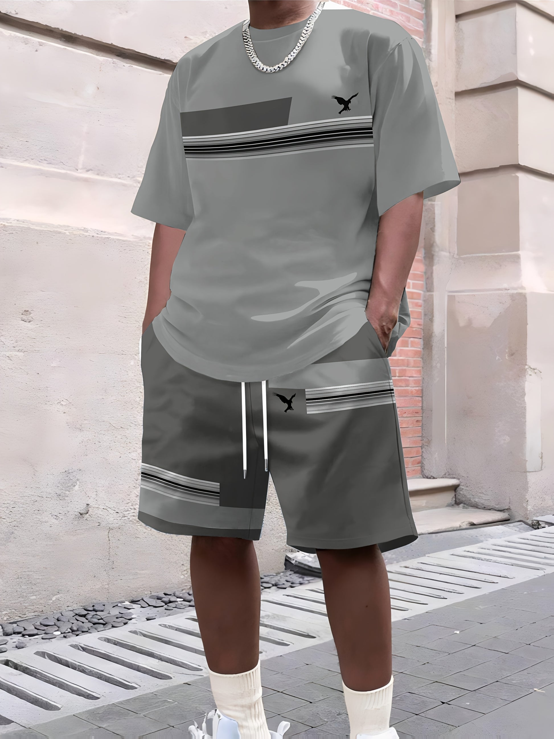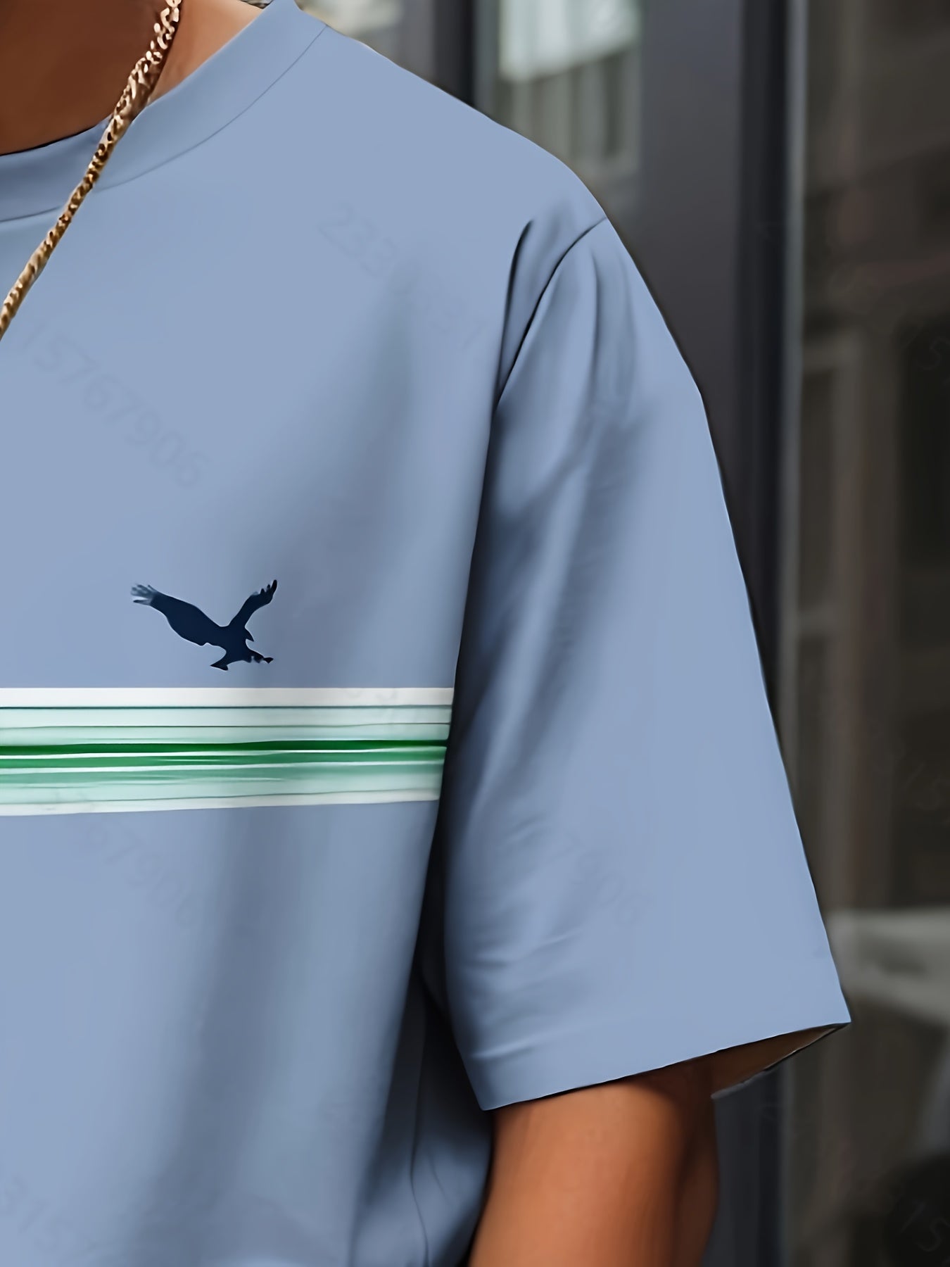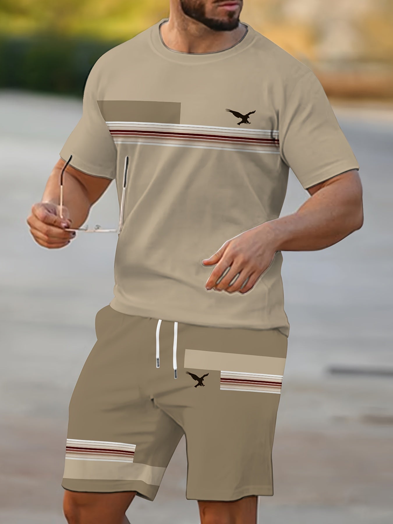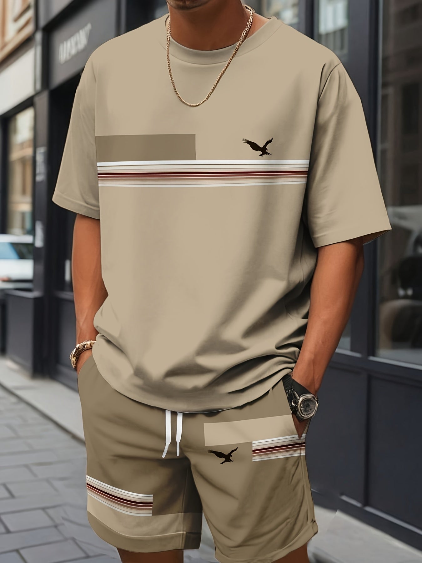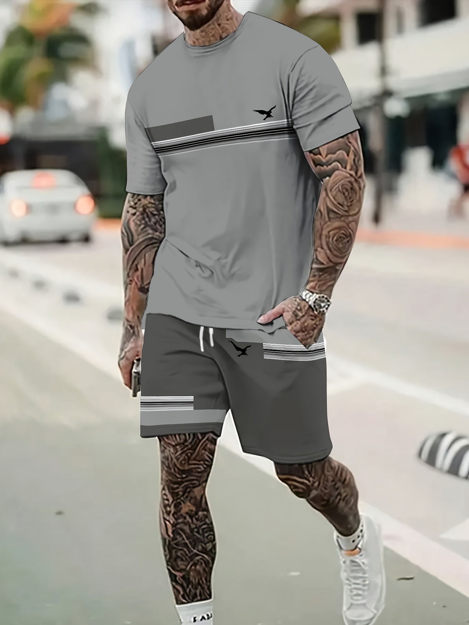 Men'S Casual Summer Two-Piece Athletic Wear Set - Light Blue T-Shirt with Green & White Stripes, Matching Shorts, Perfect for Daily Leisure, Vacation, and Sports, Casual Sportswear | Relaxed Fit Shorts | Stretchable Fabric