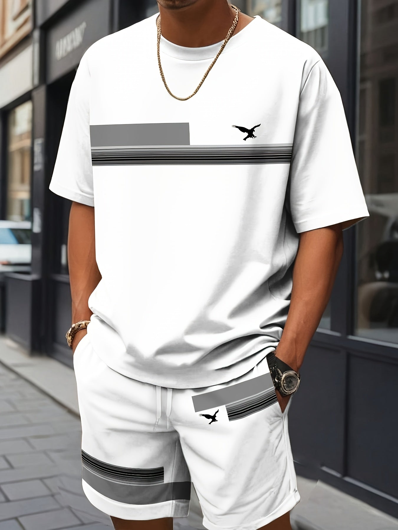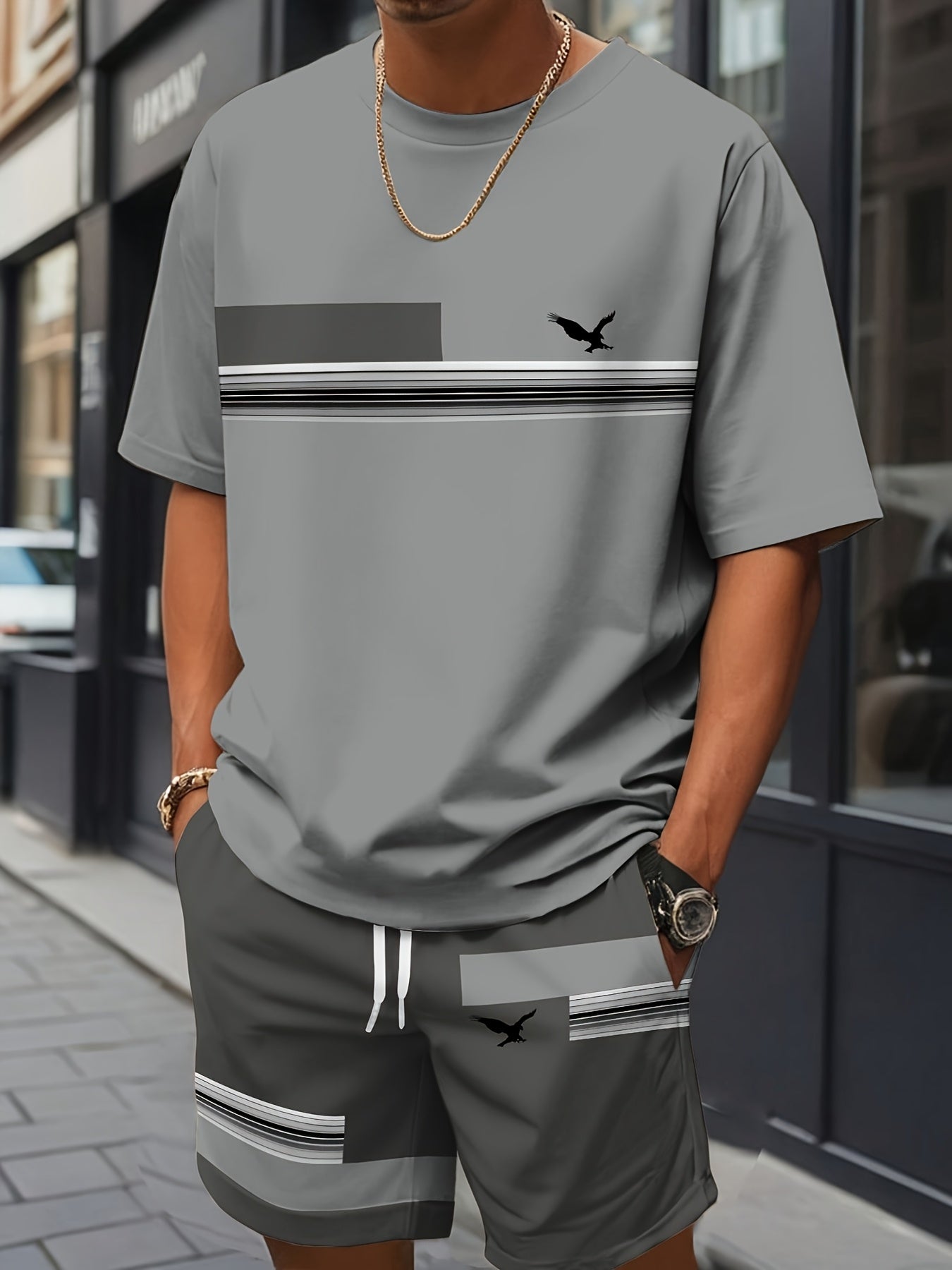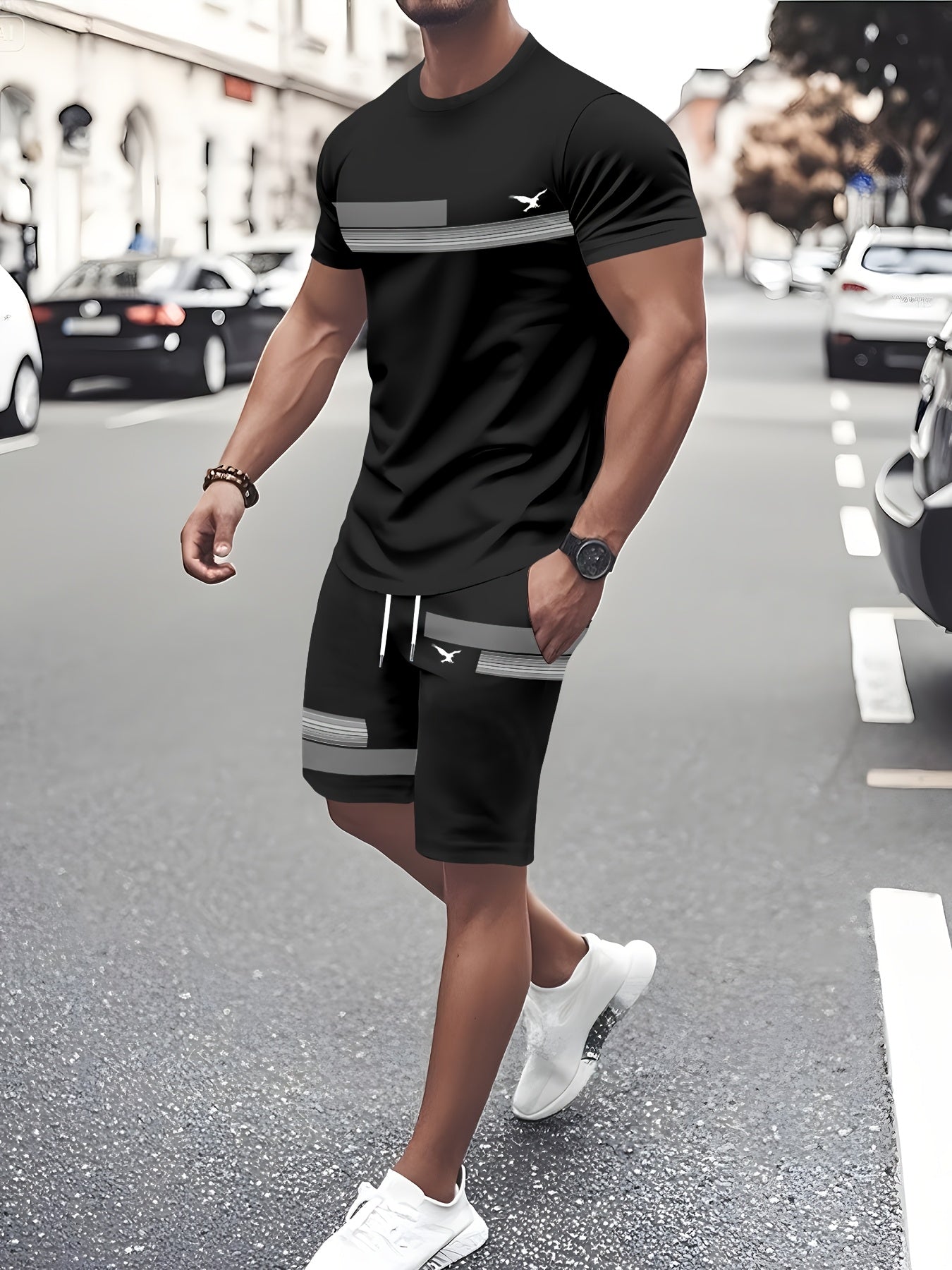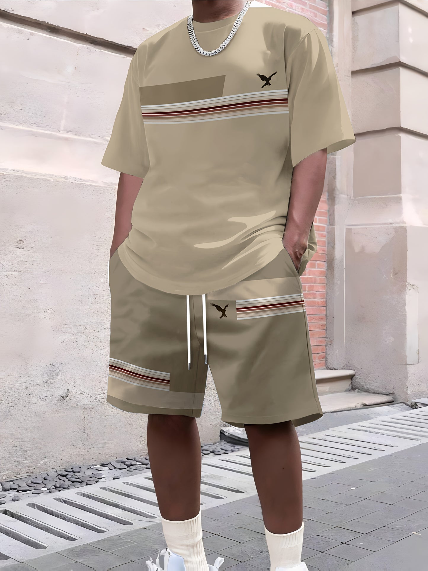 Men'S Casual Summer Two-Piece Athletic Wear Set - Light Blue T-Shirt with Green & White Stripes, Matching Shorts, Perfect for Daily Leisure, Vacation, and Sports, Casual Sportswear | Relaxed Fit Shorts | Stretchable Fabric