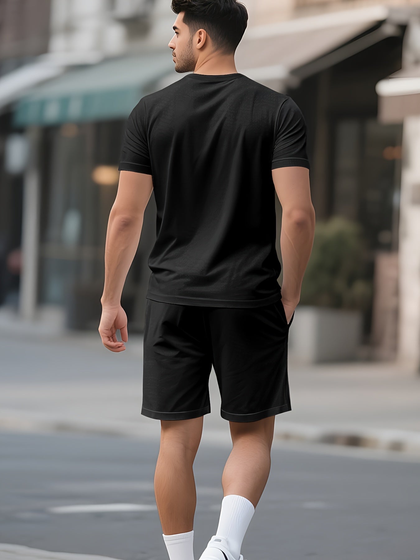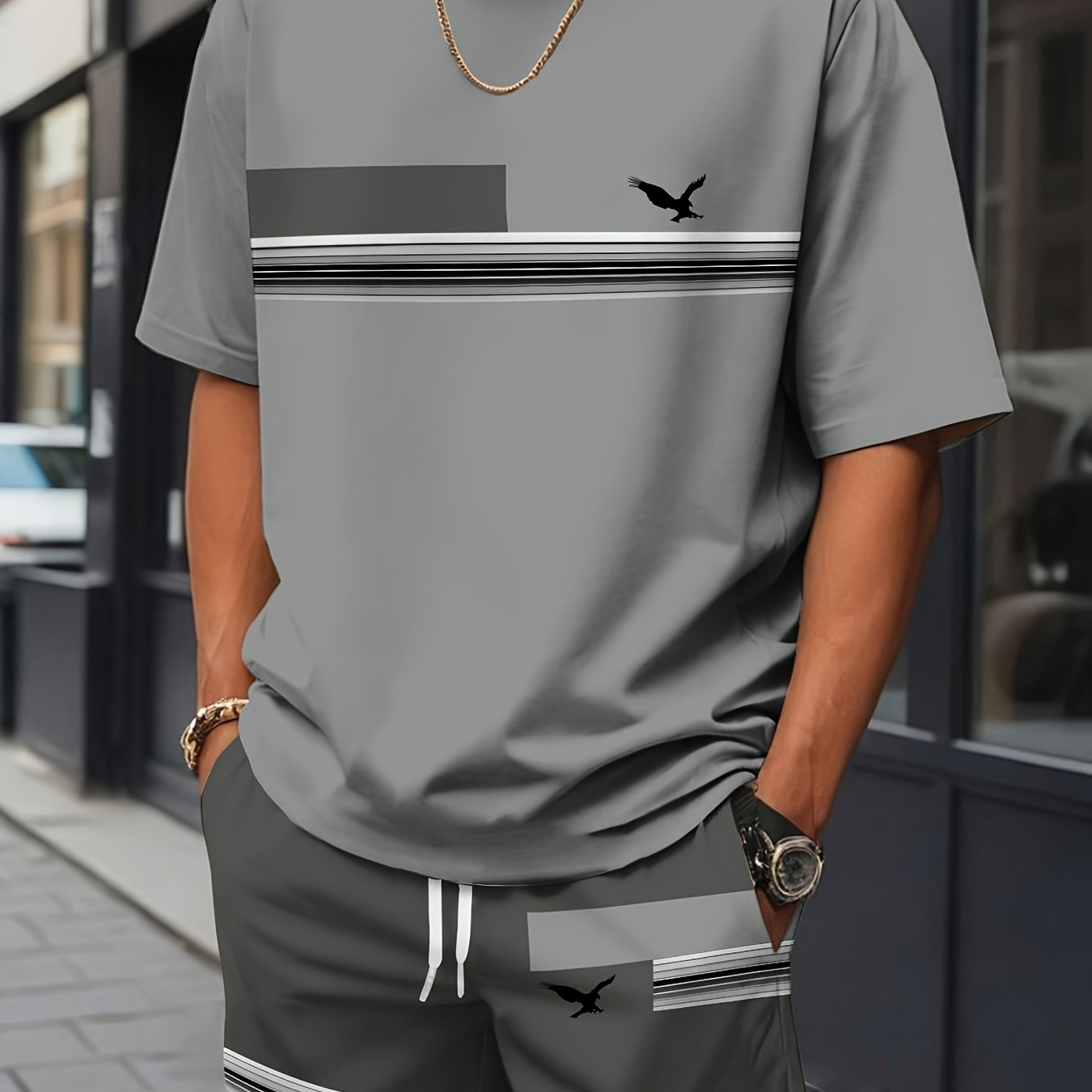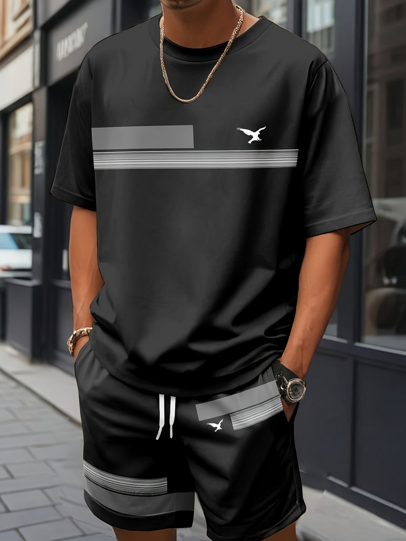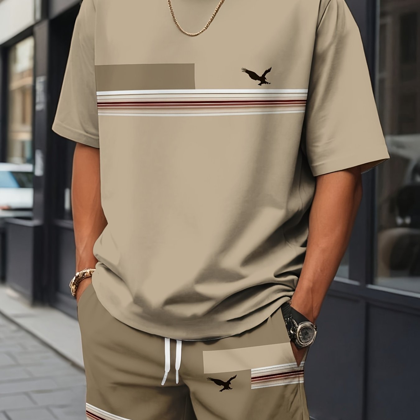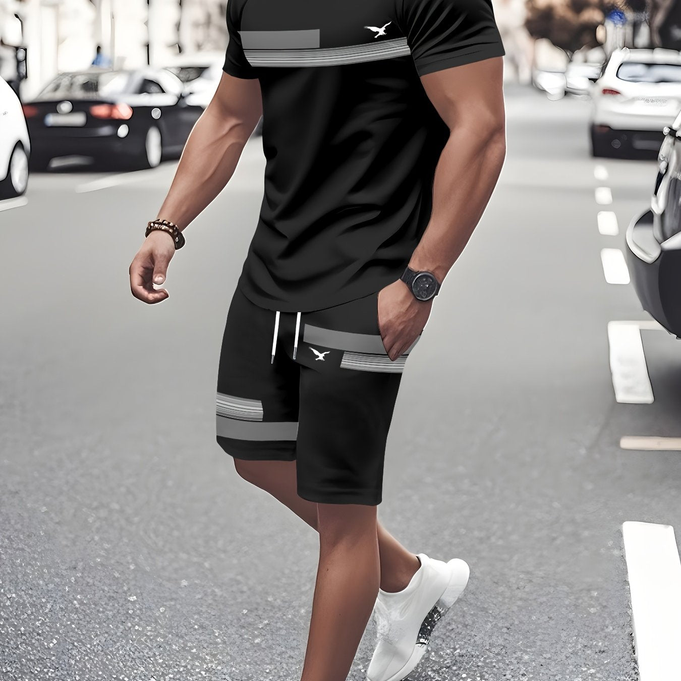 Men'S Casual Summer Two-Piece Athletic Wear Set - Light Blue T-Shirt with Green & White Stripes, Matching Shorts, Perfect for Daily Leisure, Vacation, and Sports, Casual Sportswear | Relaxed Fit Shorts | Stretchable Fabric