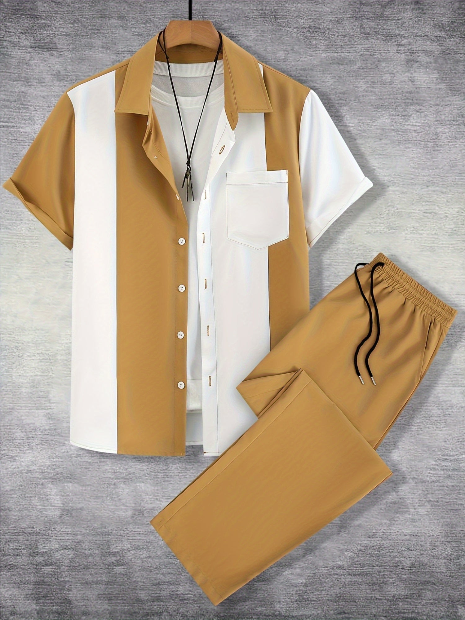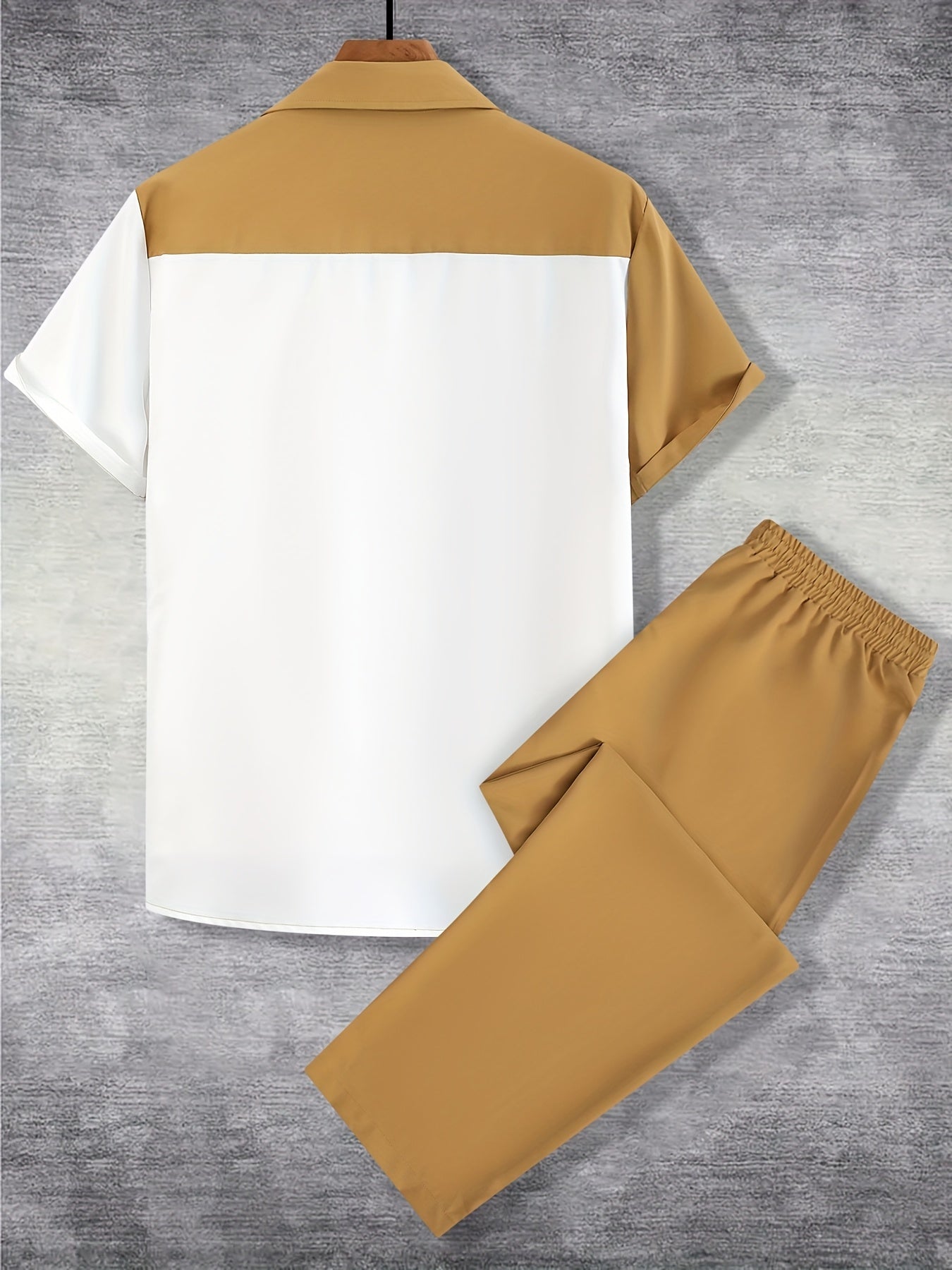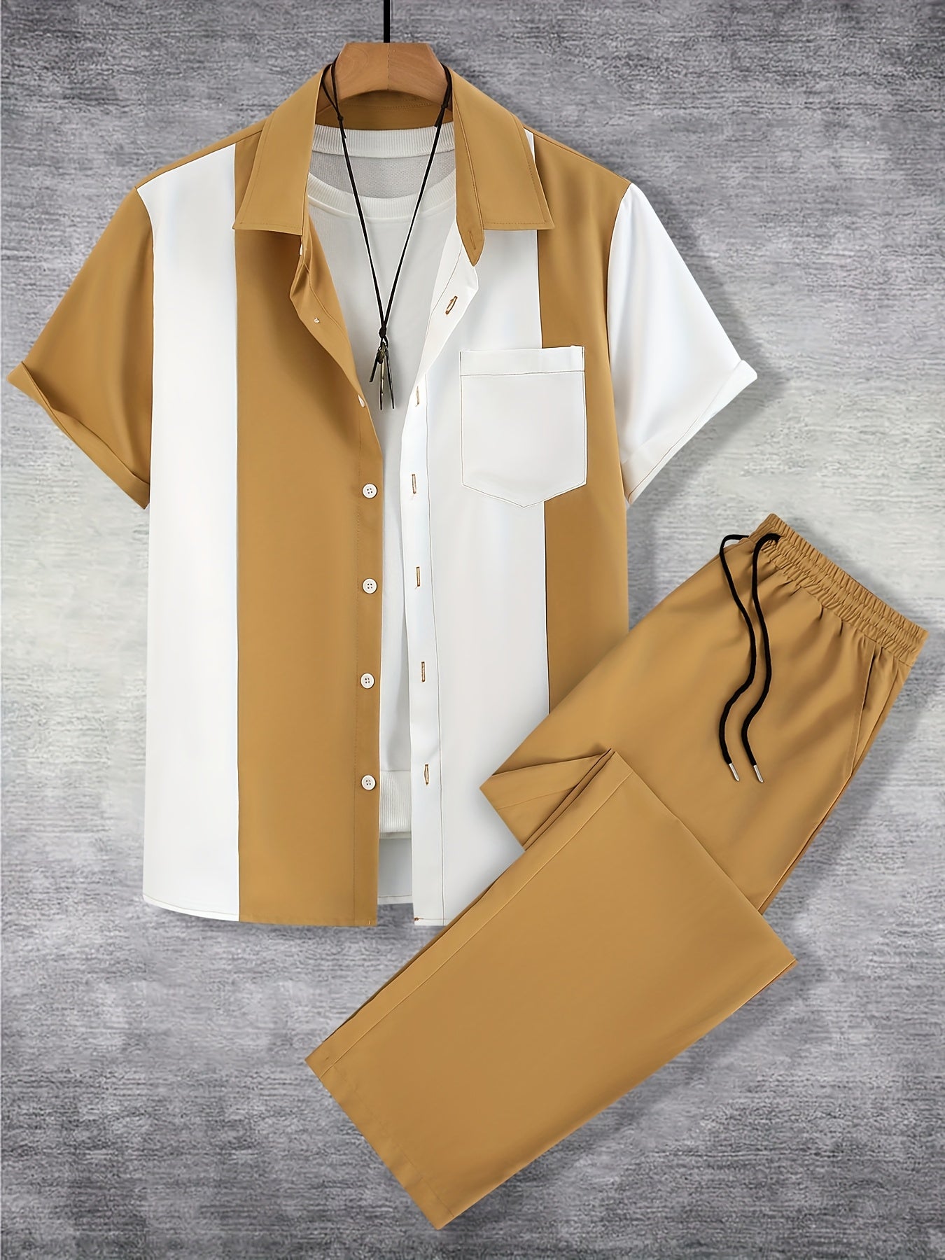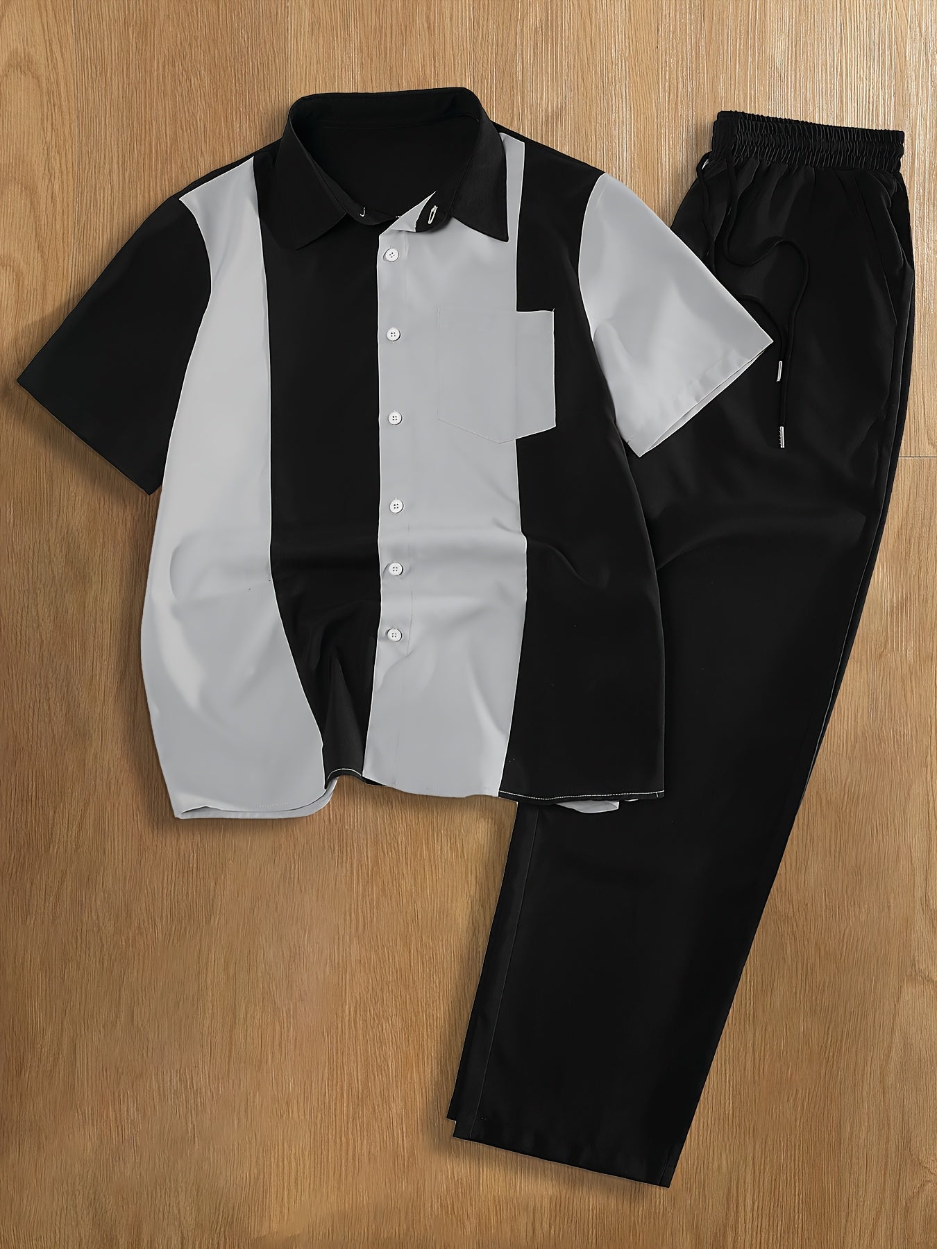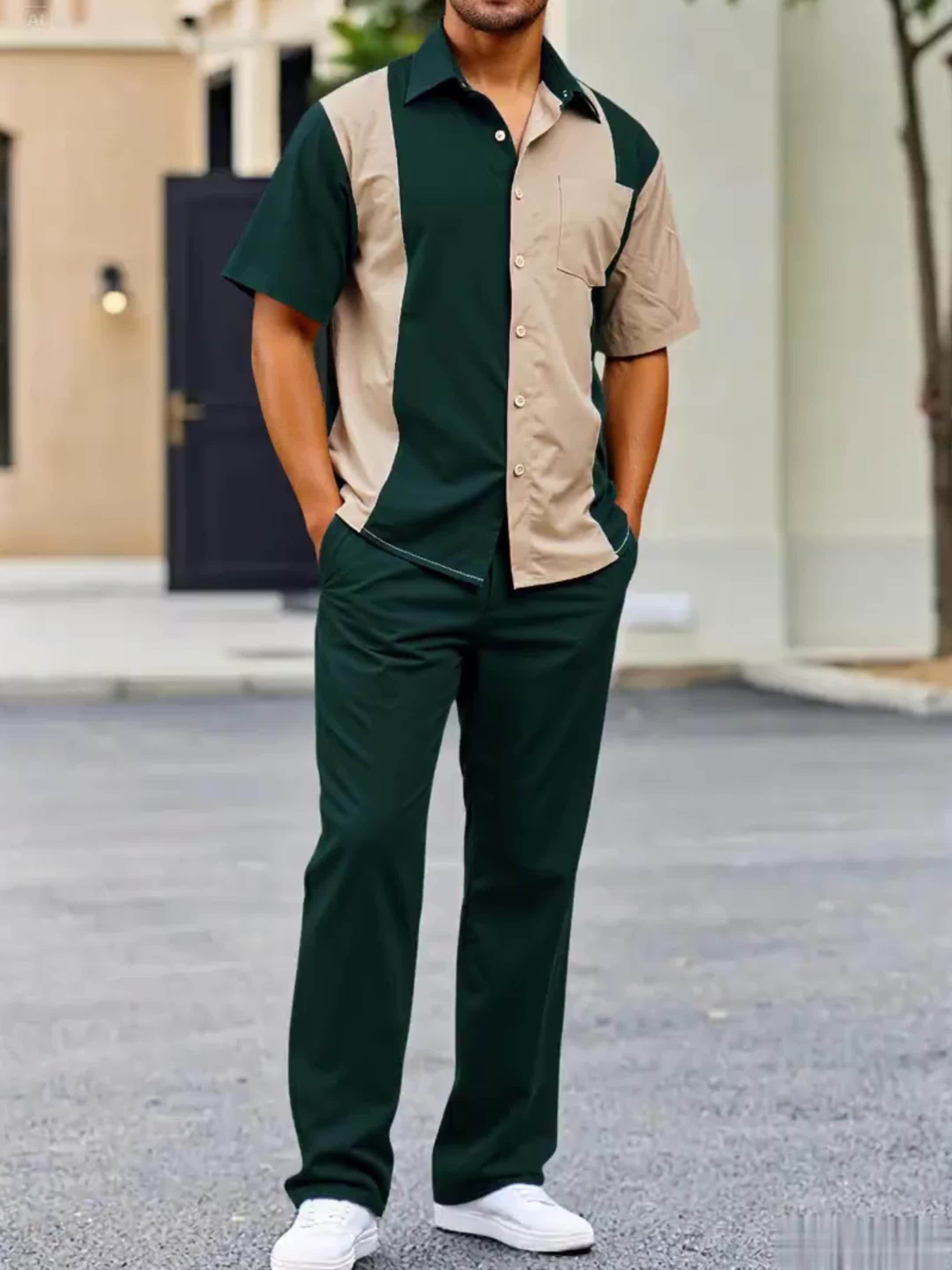 Men'S Casual Two-Piece Spring/Summer Color Block Short Sleeve Shirt and Pants Set - Polyester, Regular Fit, Button-Up with Pocket, No Belt, All-Season Wear, Casual Attire|Casual Style|Polyester Fabric