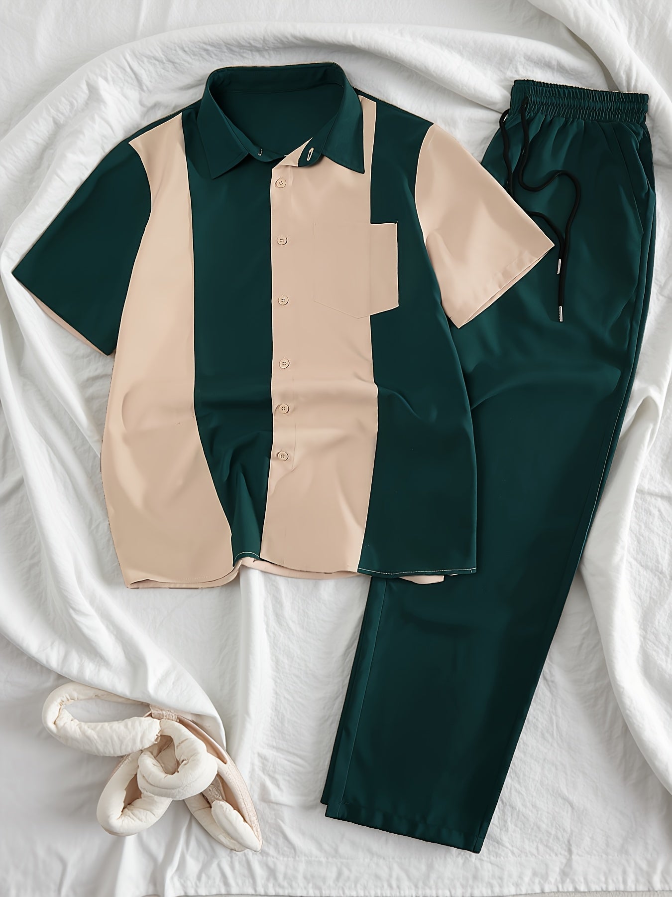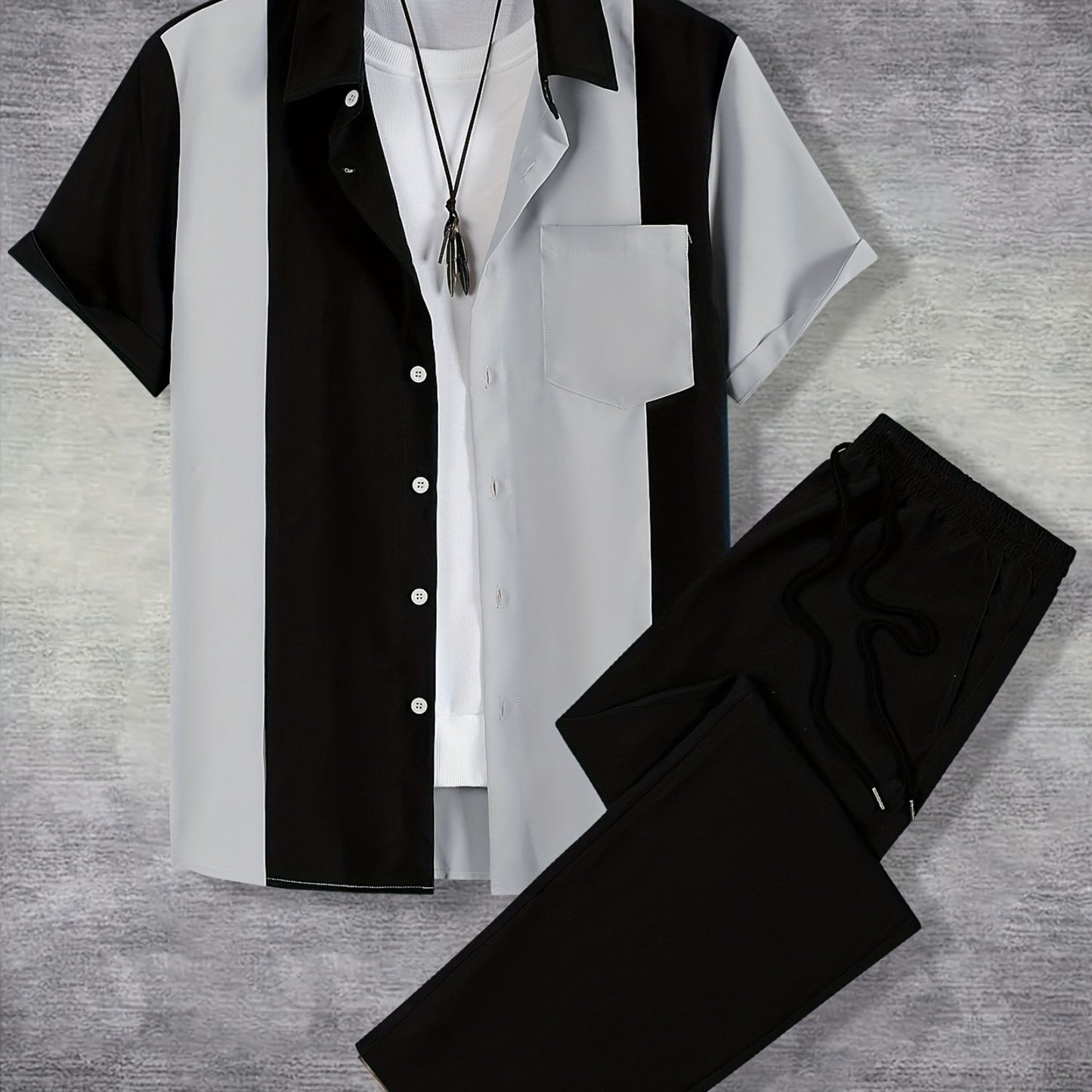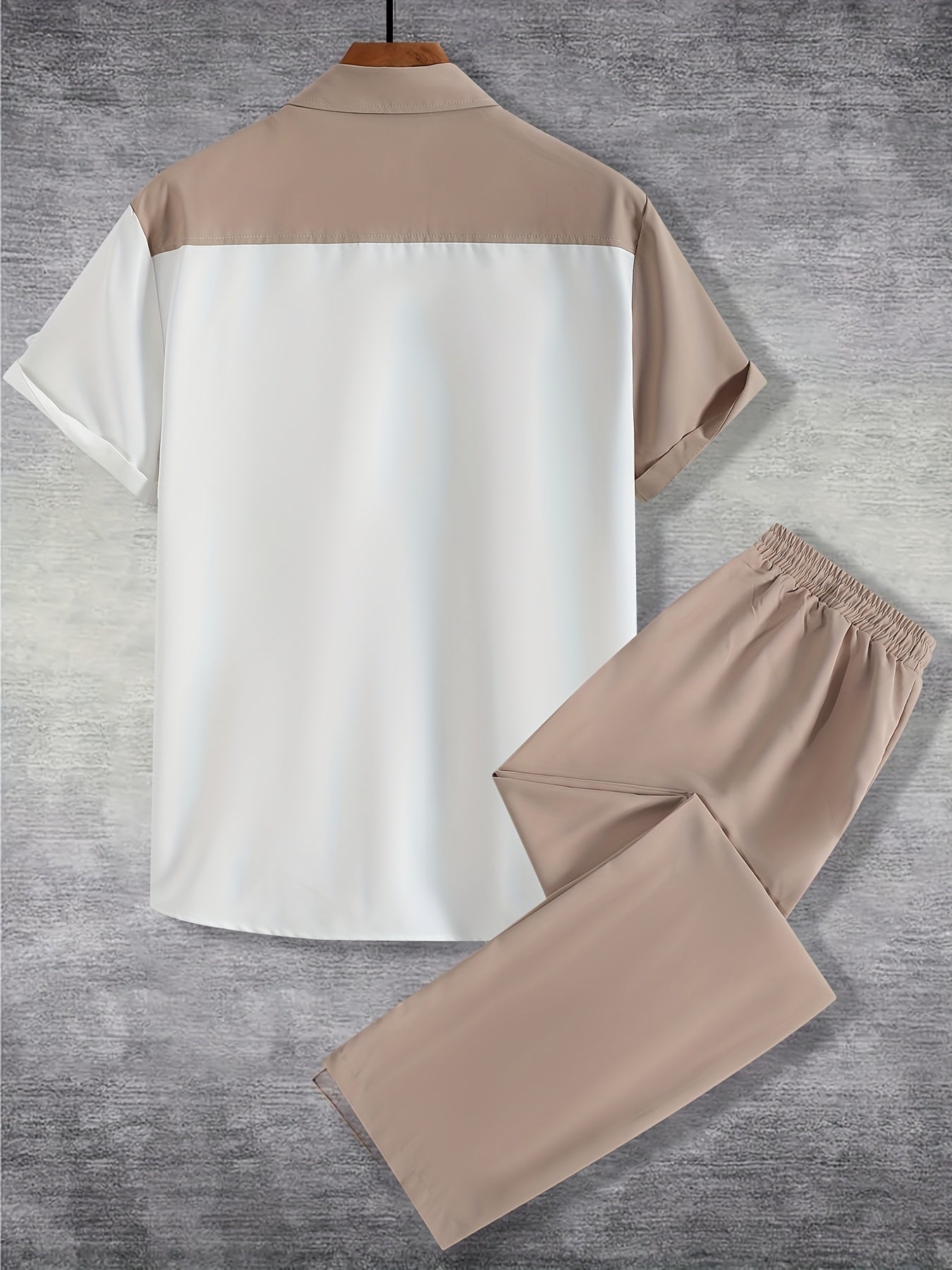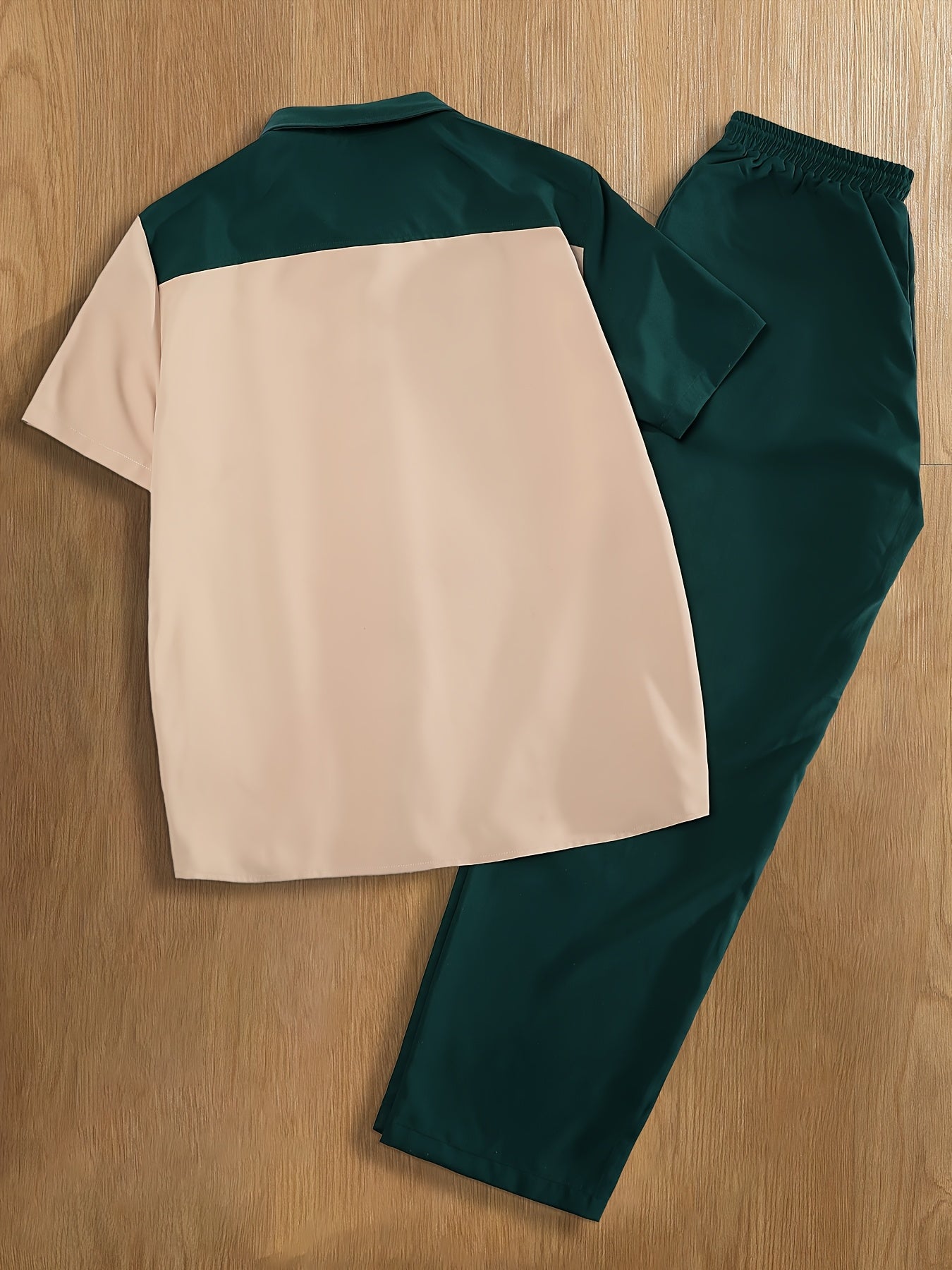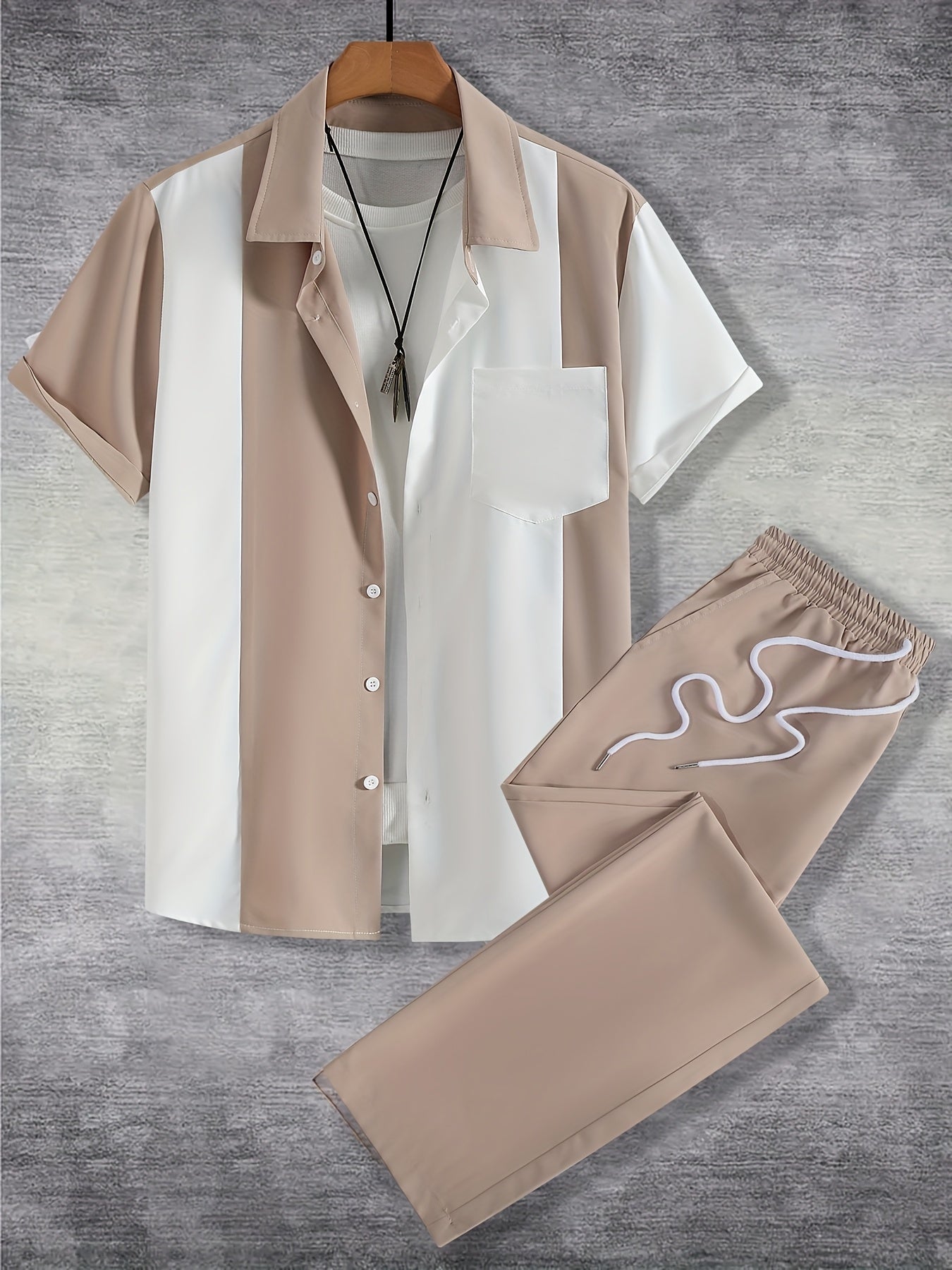 Men'S Casual Two-Piece Spring/Summer Color Block Short Sleeve Shirt and Pants Set - Polyester, Regular Fit, Button-Up with Pocket, No Belt, All-Season Wear, Casual Attire|Casual Style|Polyester Fabric