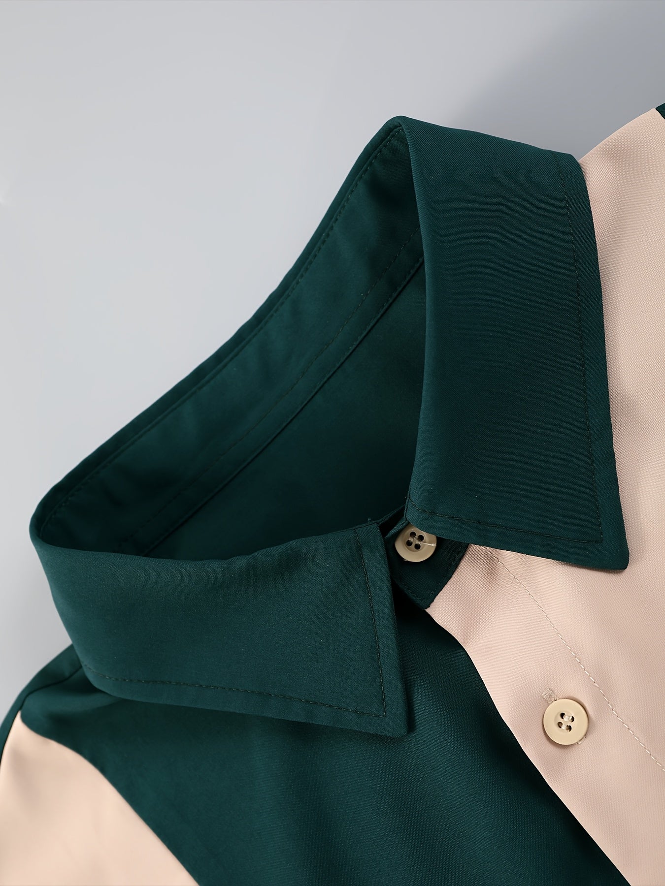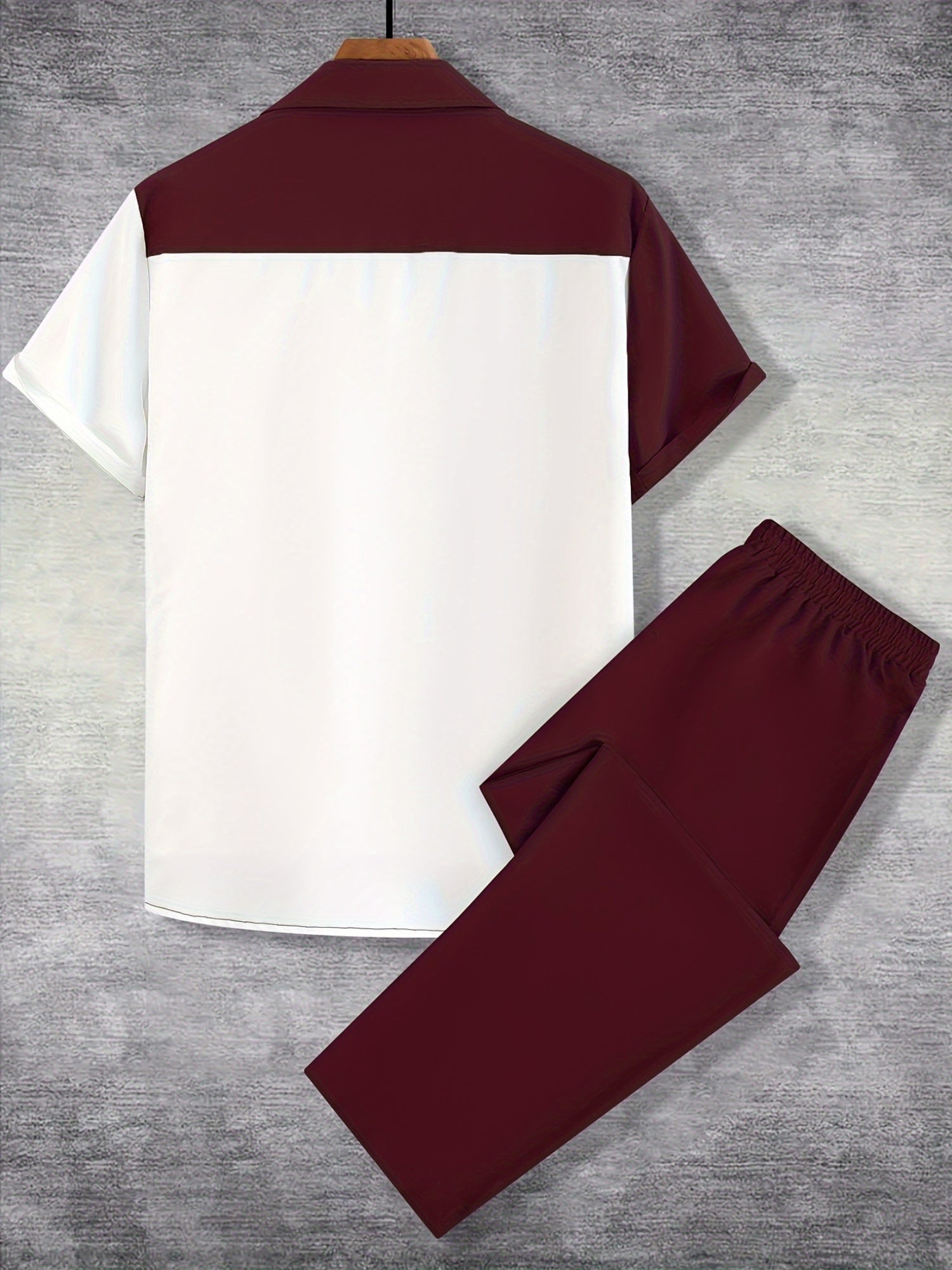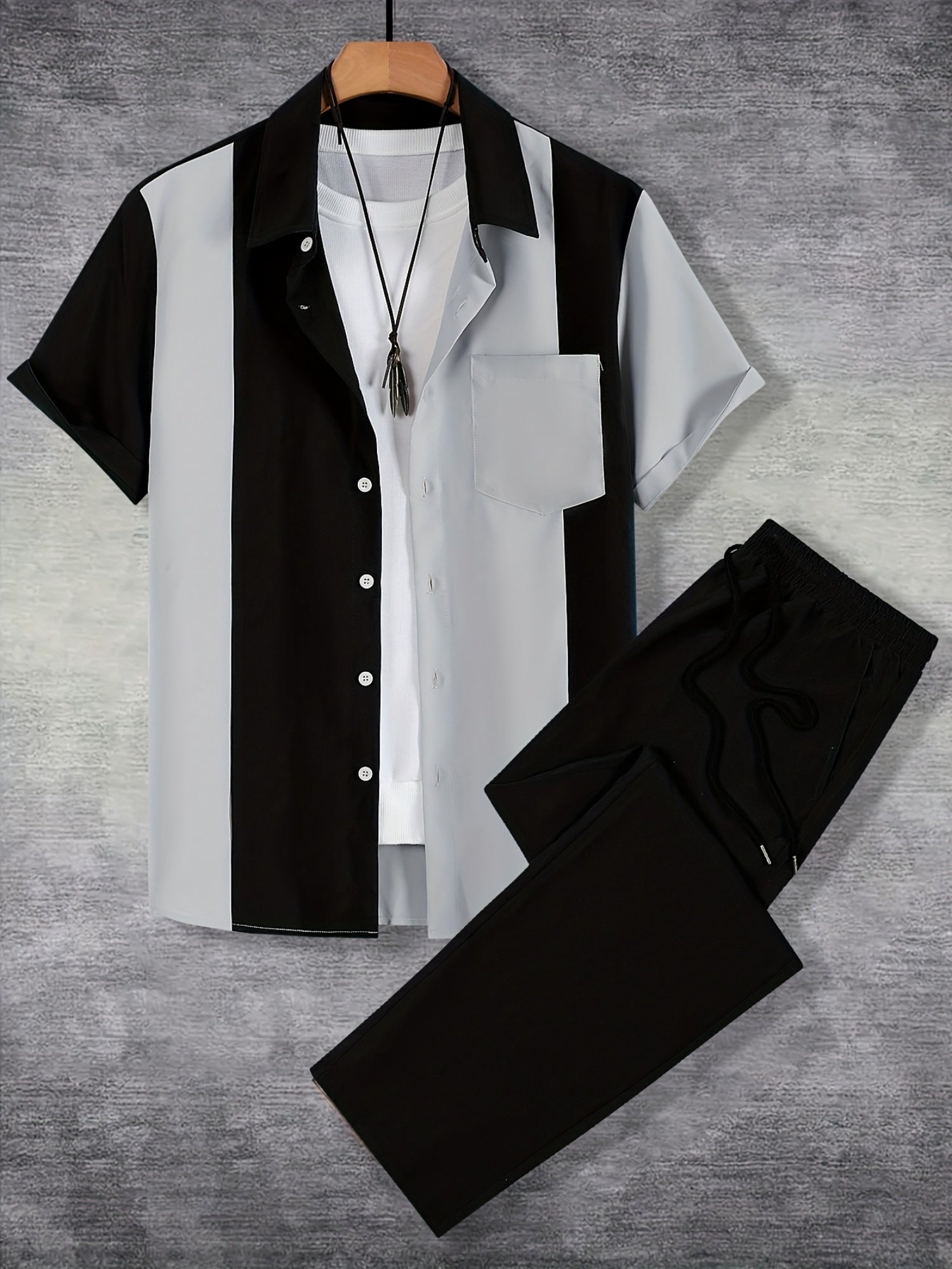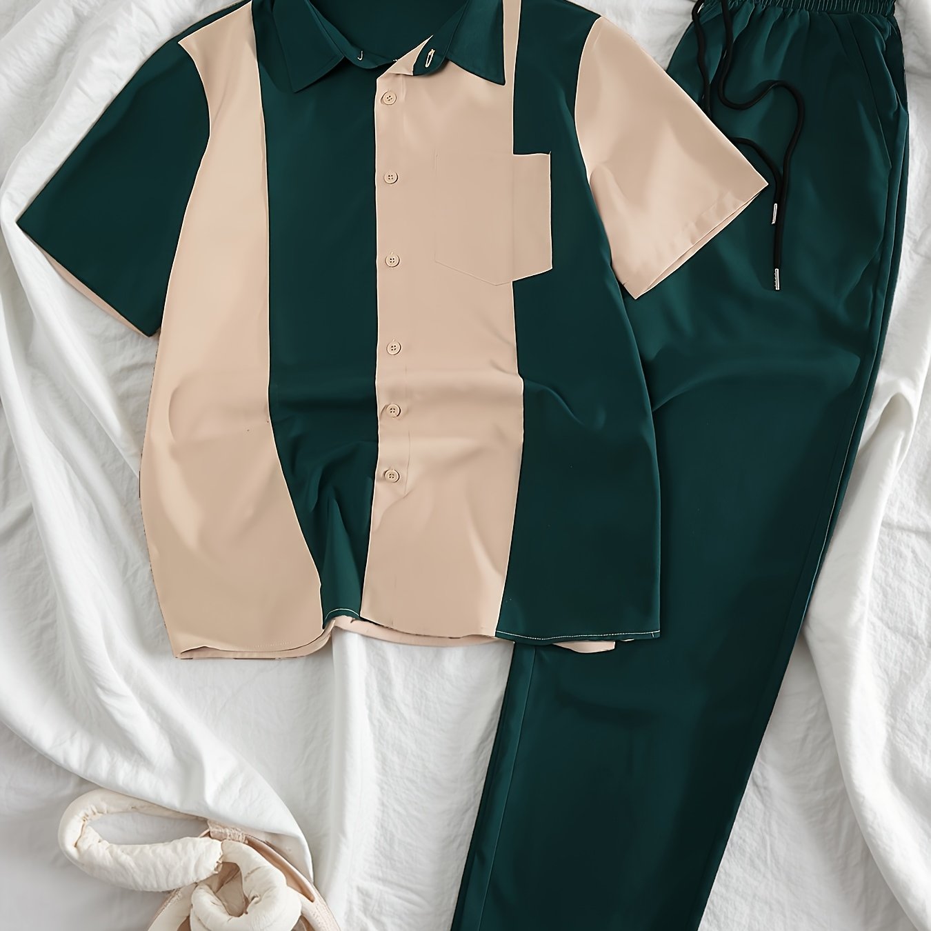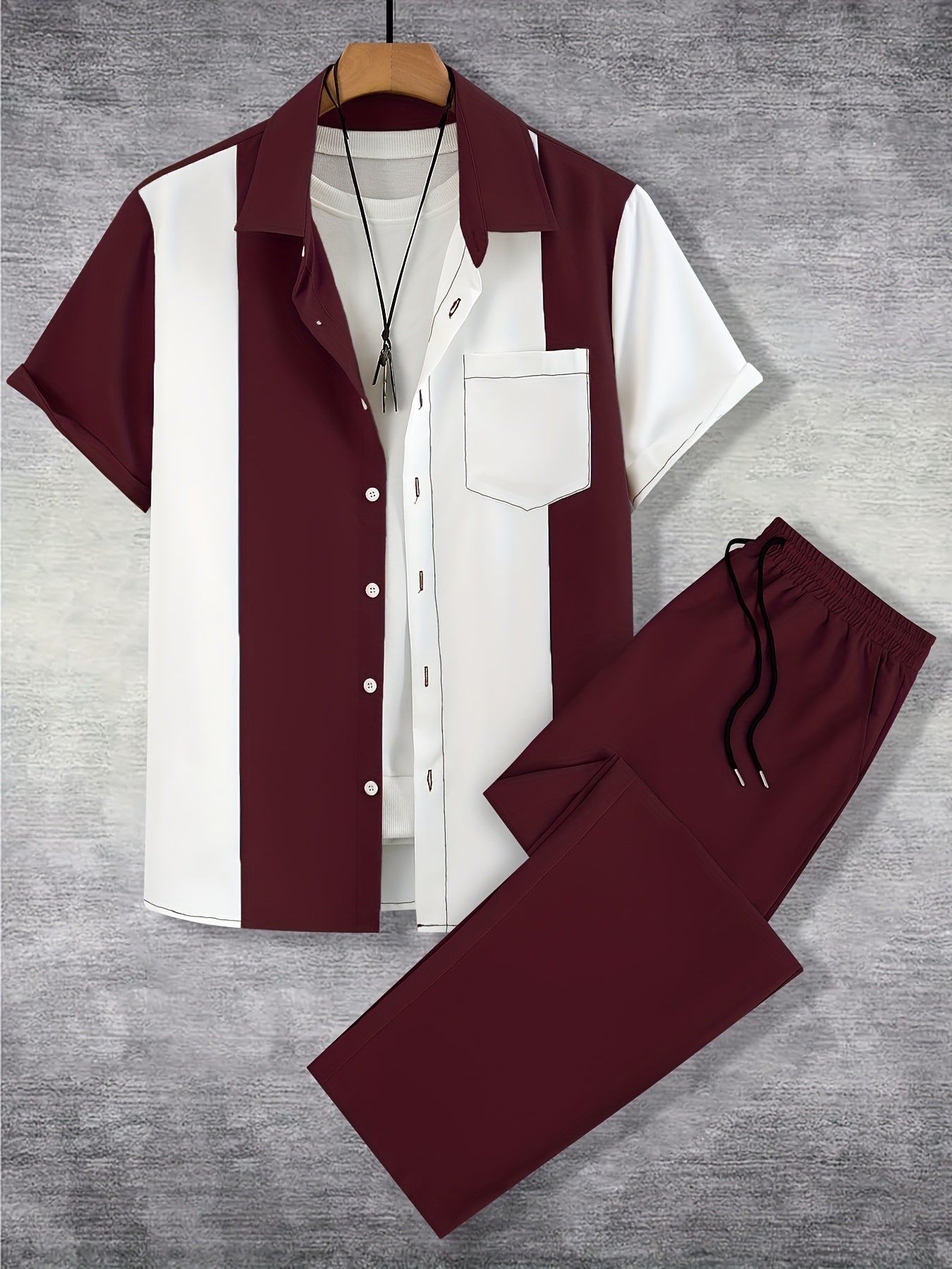 Men'S Casual Two-Piece Spring/Summer Color Block Short Sleeve Shirt and Pants Set - Polyester, Regular Fit, Button-Up with Pocket, No Belt, All-Season Wear, Casual Attire|Casual Style|Polyester Fabric