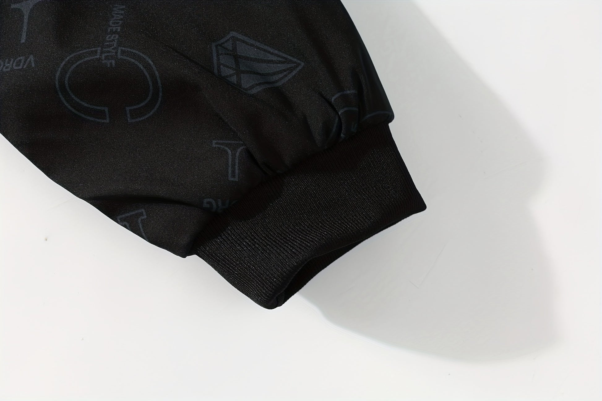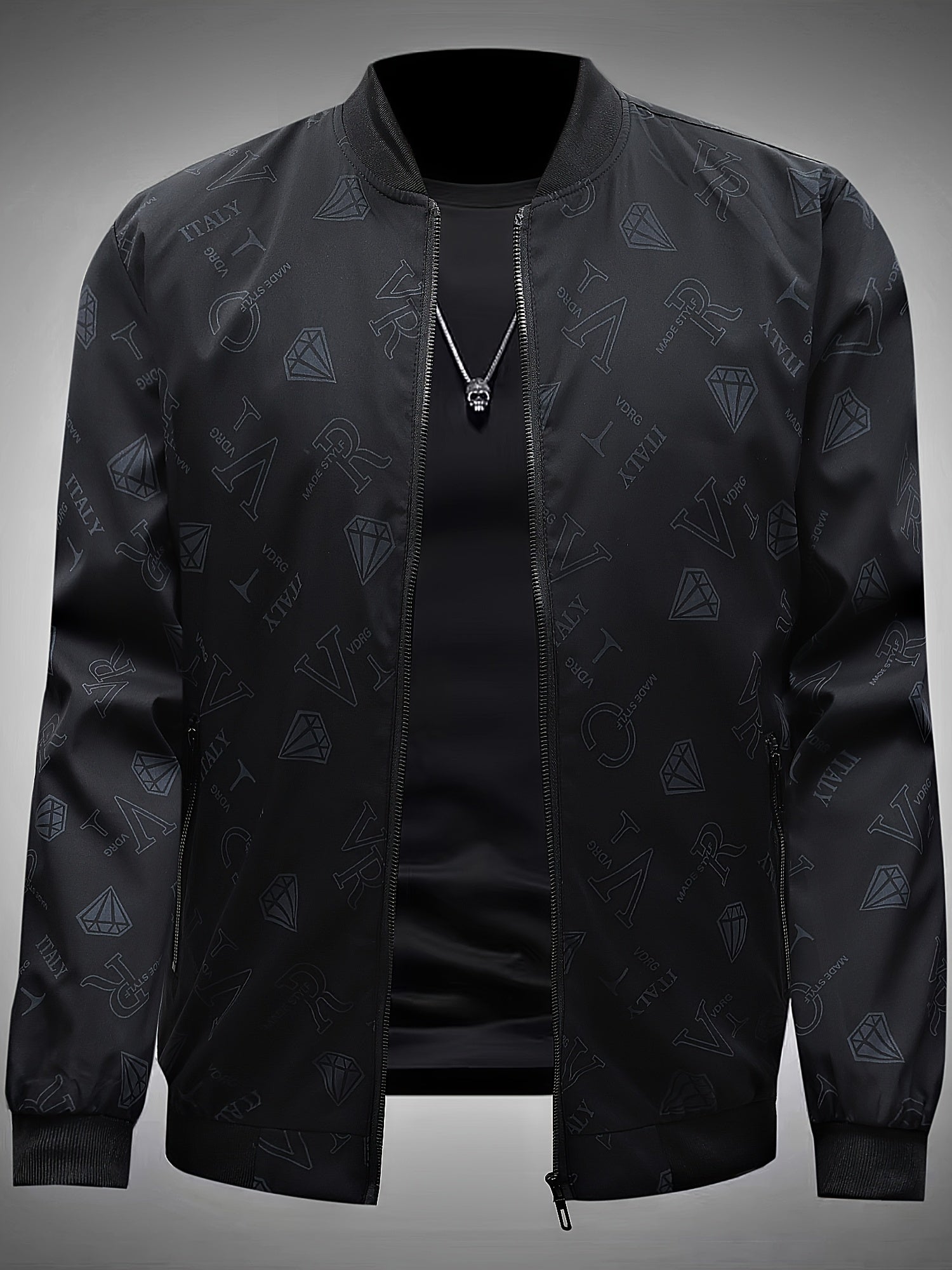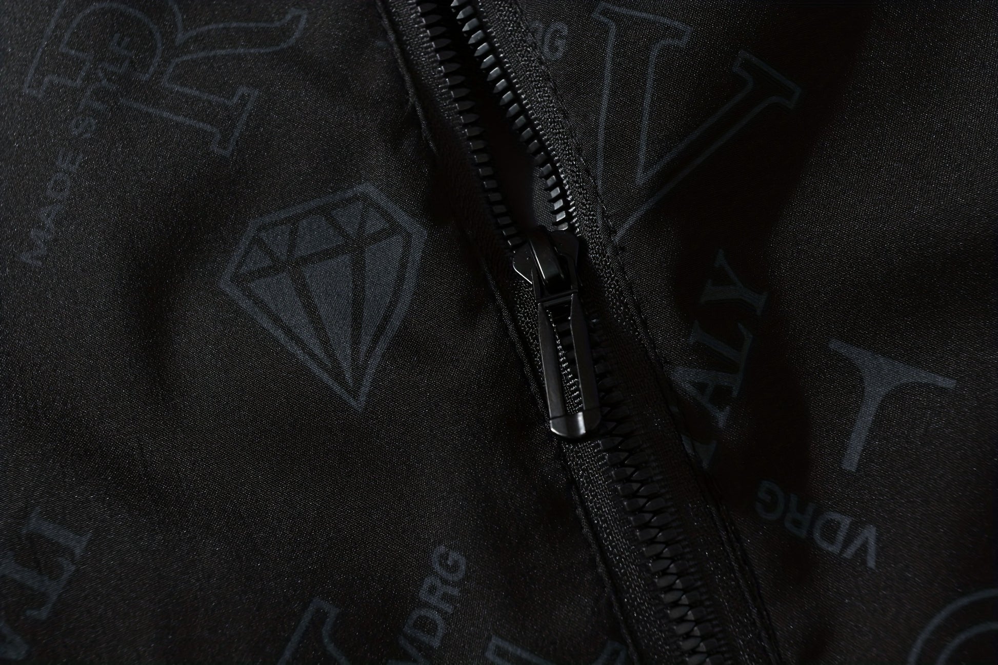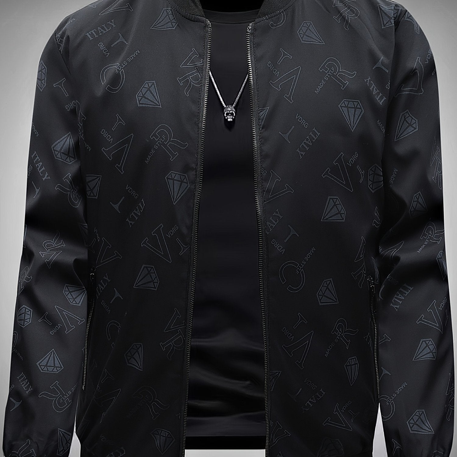 Men's Fashion Bomber Jacket Spring/Fall Collection, Casual Alphabet Print Polyester Jacket with Zipper, Baseball Collar, Long Sleeve, Regular Fit, Non-Stretch Woven Fabric, Casual Outfit with Pocket