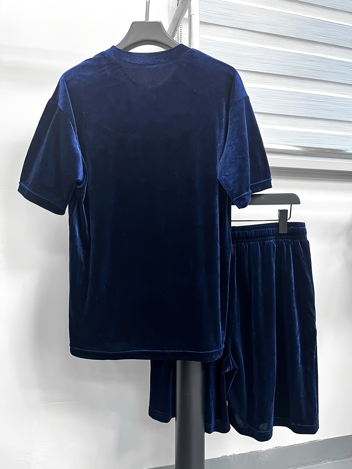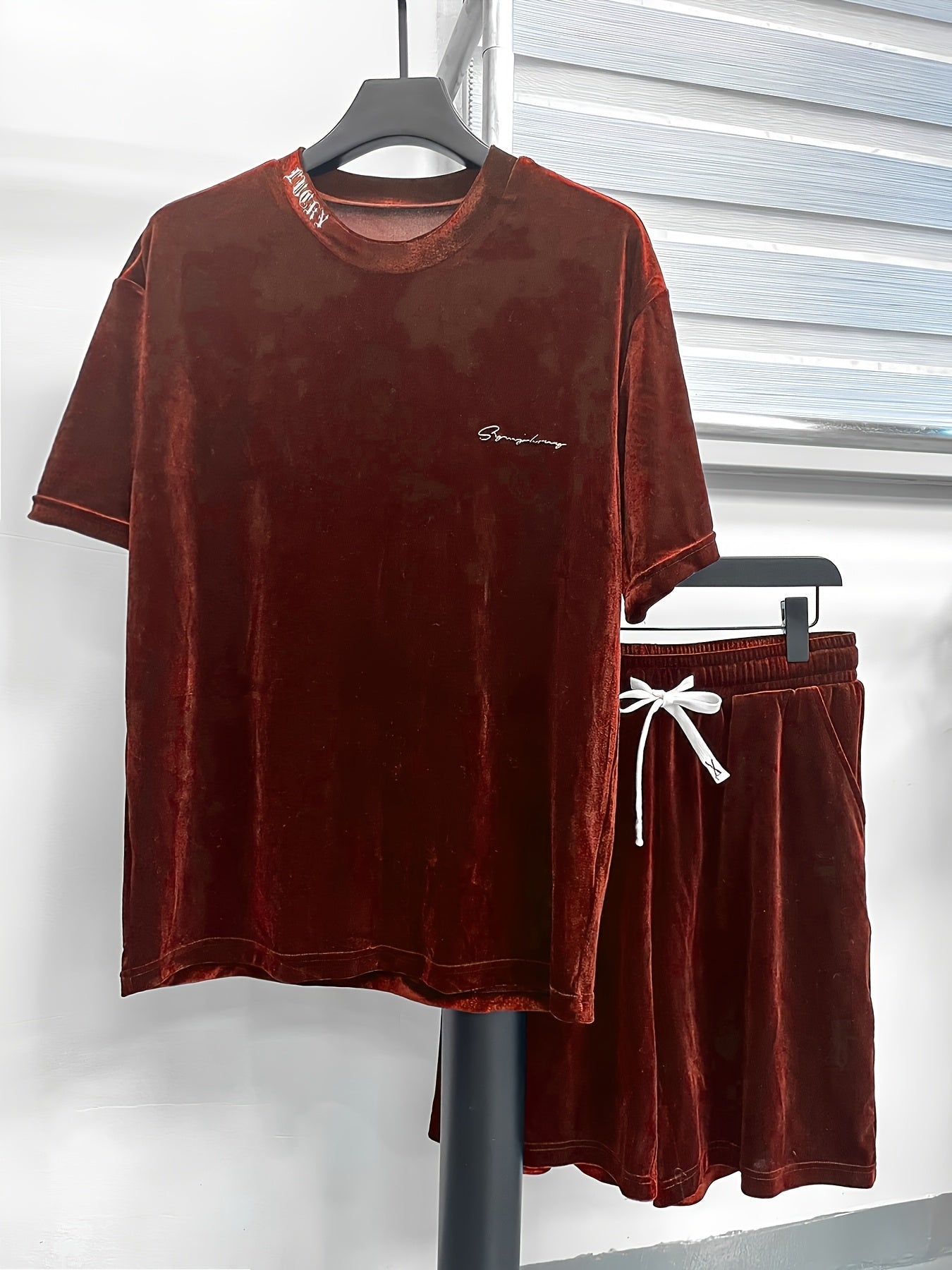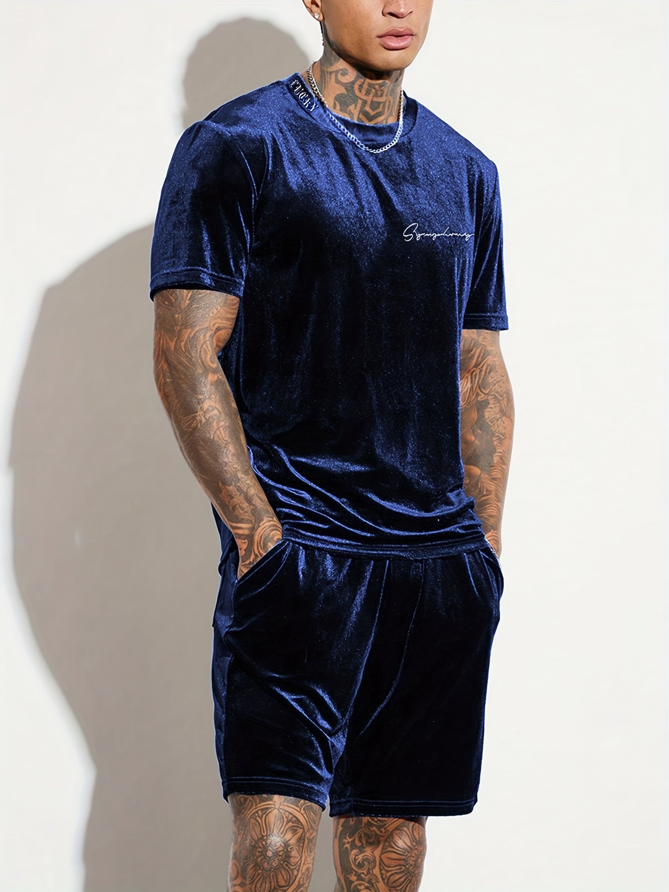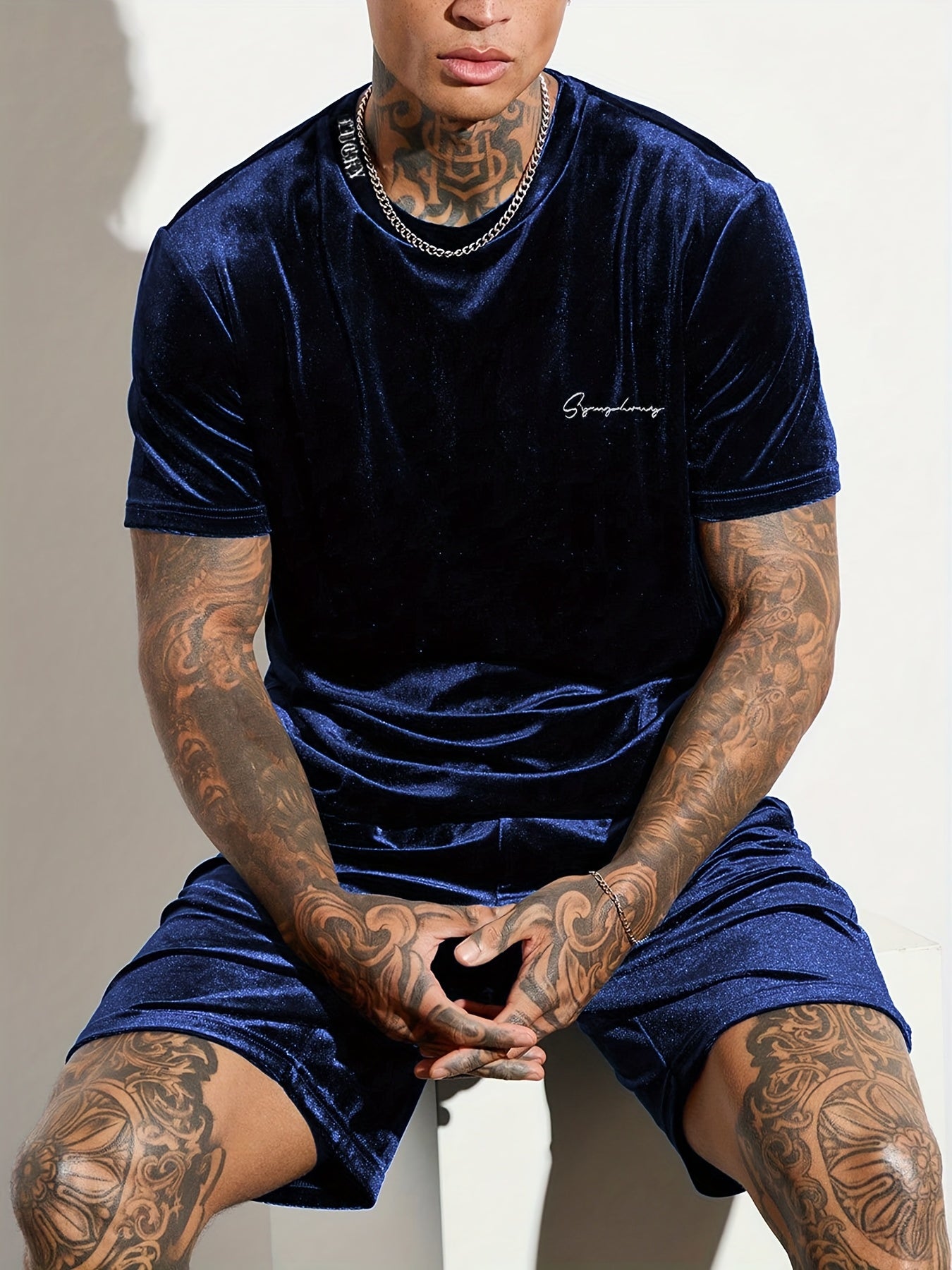 Men'S Fashion Velvet Knit Pullover Set, Contrast Letter Embroidery Top and Solid Color Drawstring Shorts, Simple Casual Outing Commuting Vacation Light Luxury Set, Regular Fit Elastic Knit Two-Piece Set, High-end Sheen Light