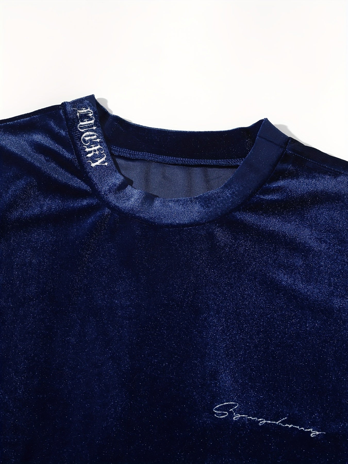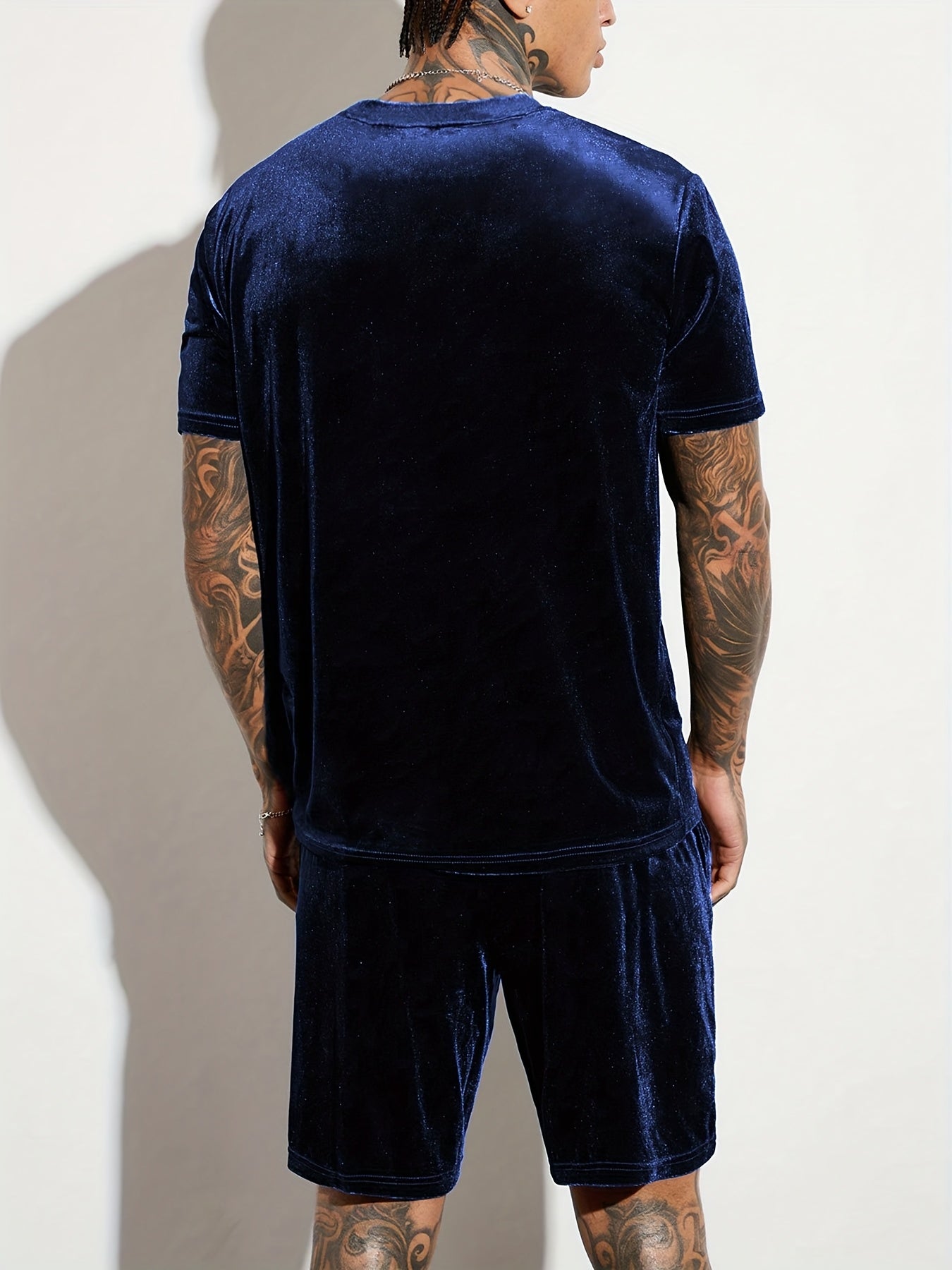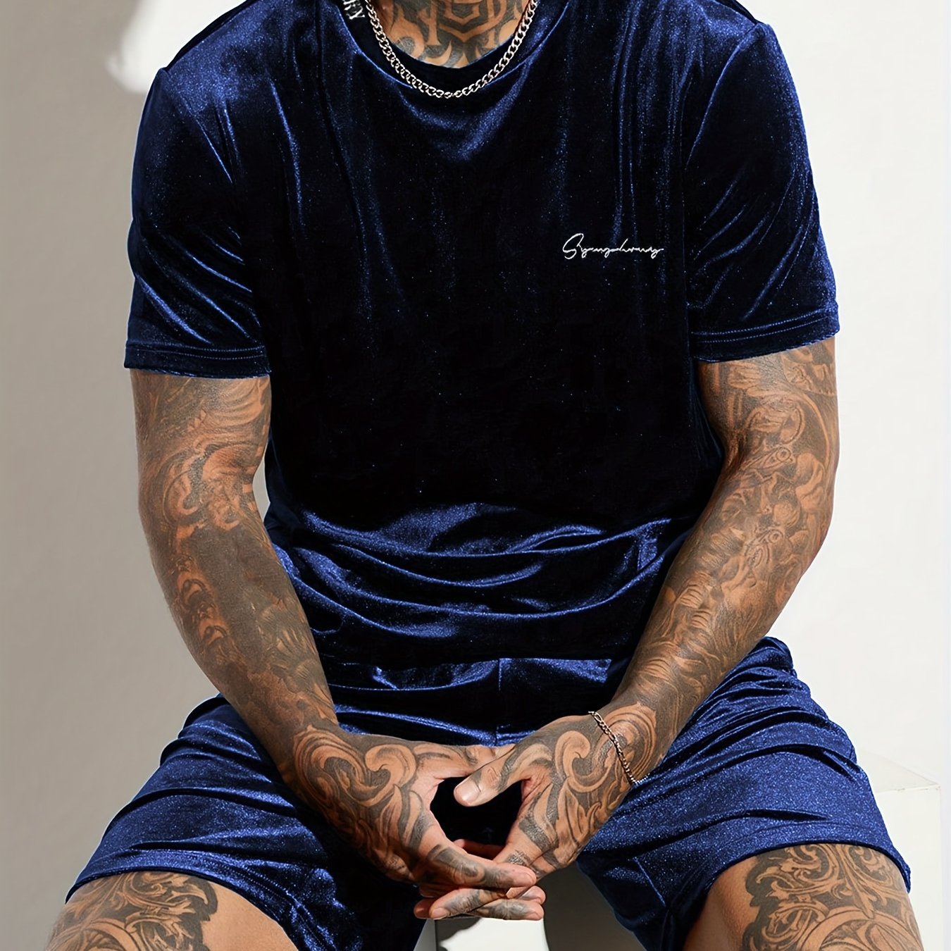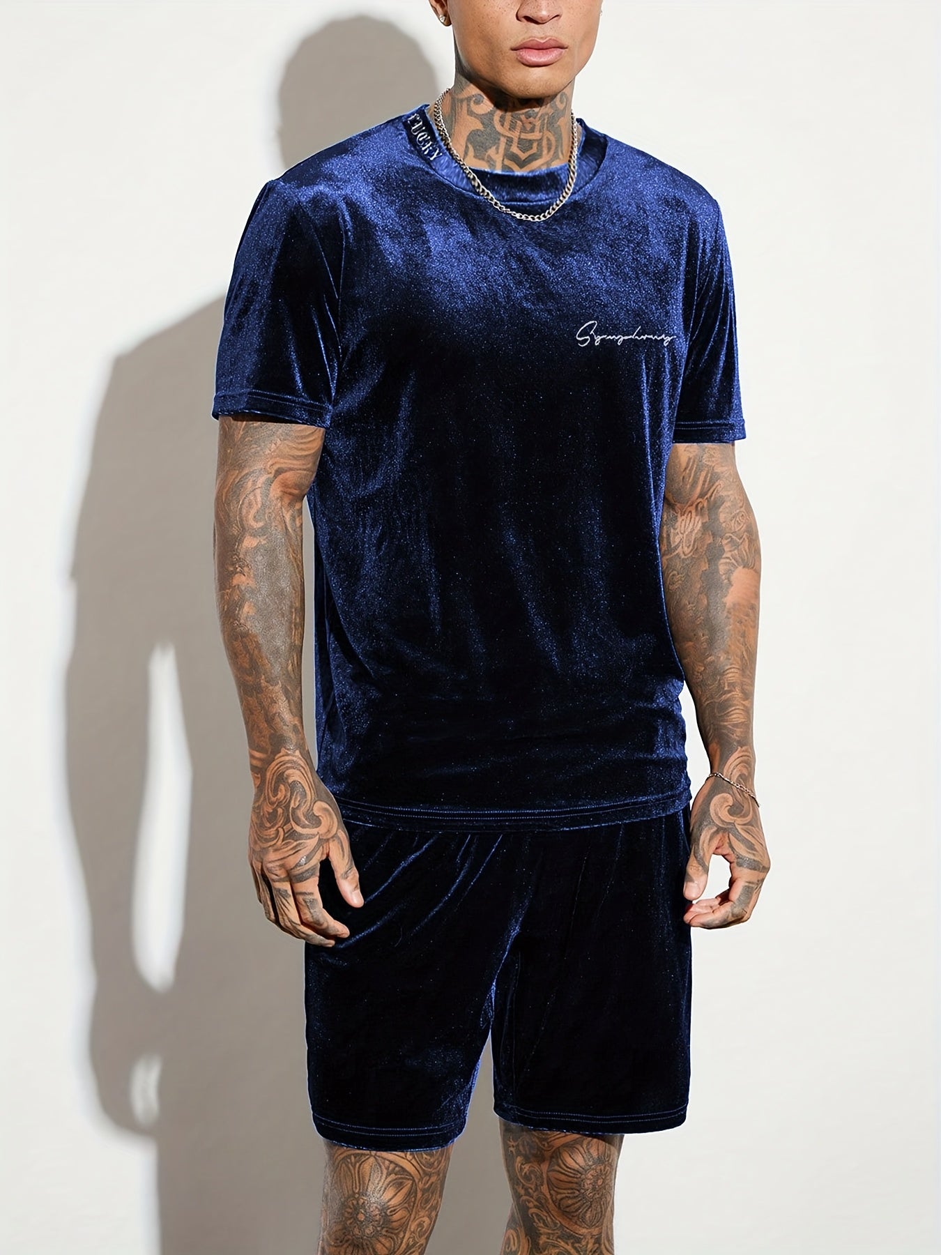 Men'S Fashion Velvet Knit Pullover Set, Contrast Letter Embroidery Top and Solid Color Drawstring Shorts, Simple Casual Outing Commuting Vacation Light Luxury Set, Regular Fit Elastic Knit Two-Piece Set, High-end Sheen Light