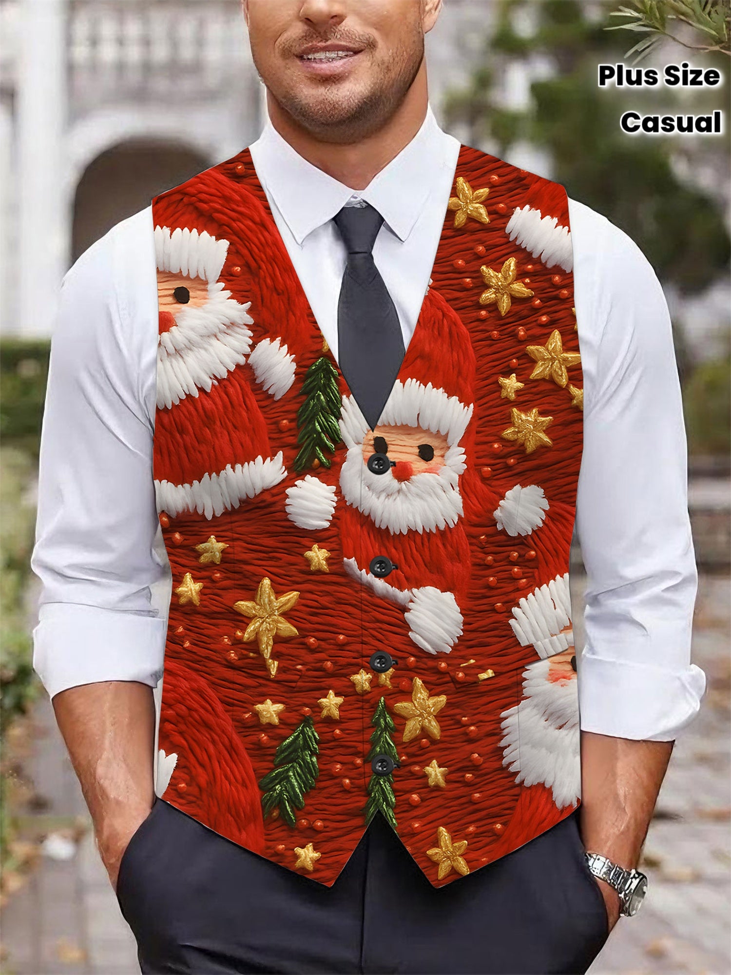 Men's Full-Body Print Santa Claus Vest with Collar & - Red/Green/White/Golden Christmas Jacket, Golden Star Buttons, All-Season Party & Casual Coat for Holiday Events, Costumes, and Casual Attire, PLUS SIZE
