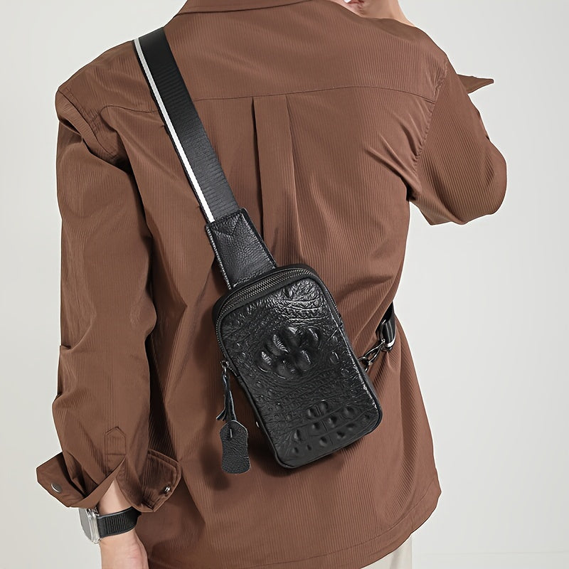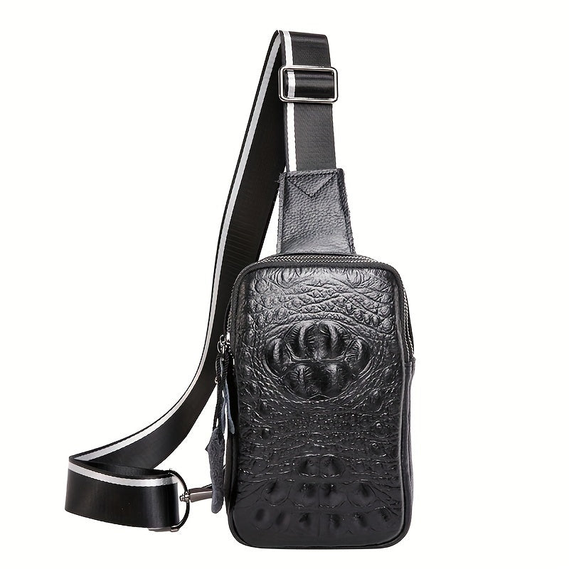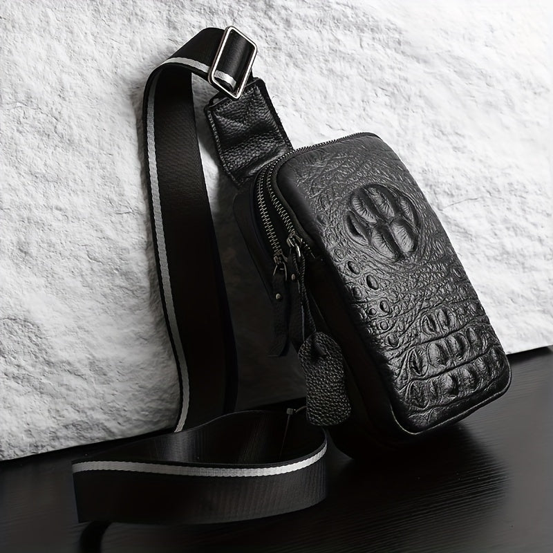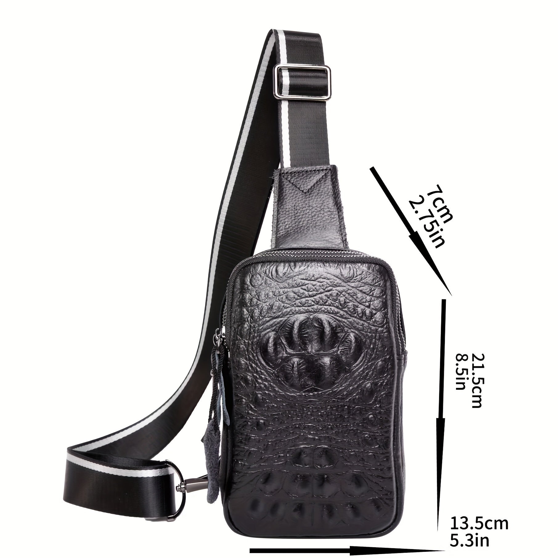 Men's Genuine Leather Crossbody Bag with Crocodile Pattern - Stylish Black Chest Bag for Casual Outings, Paw Print Design, Adjustable Strap, Perfect for Commuting or Travel, Small Crossbody Bag