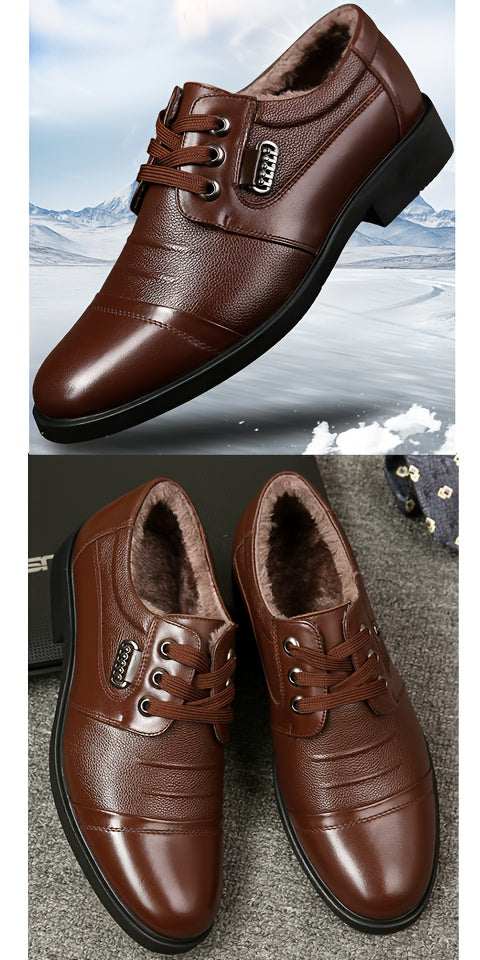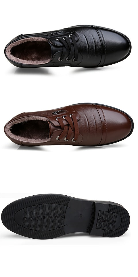 Men'S Genuine Leather Winter Warm Business Casual Shoes - Rubber Sole, Lace-Up Low-Top Design with Fabric Lining for All-Day Comfort, Black Solid Color for Office & Daily Wear