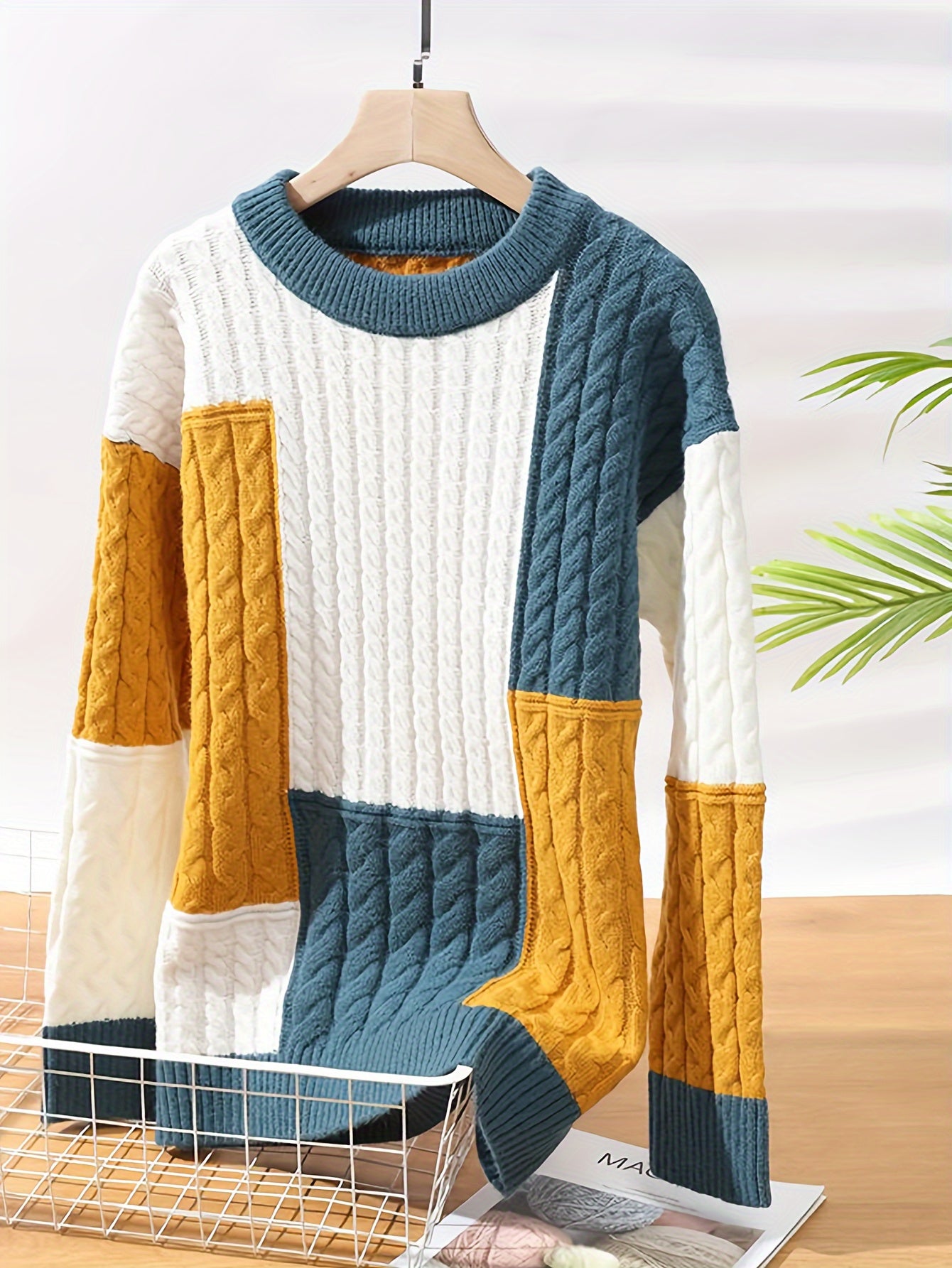 Men's Geometric Color Block Knit Sweater - Relaxed Fit Drop Shoulder Long Sleeve Pullover with Ribbed Detailing, Warm Winter Casual Top for Fall & Winter, Knitted Sweater, Autumn Wardrobe, Comfortable Clothing