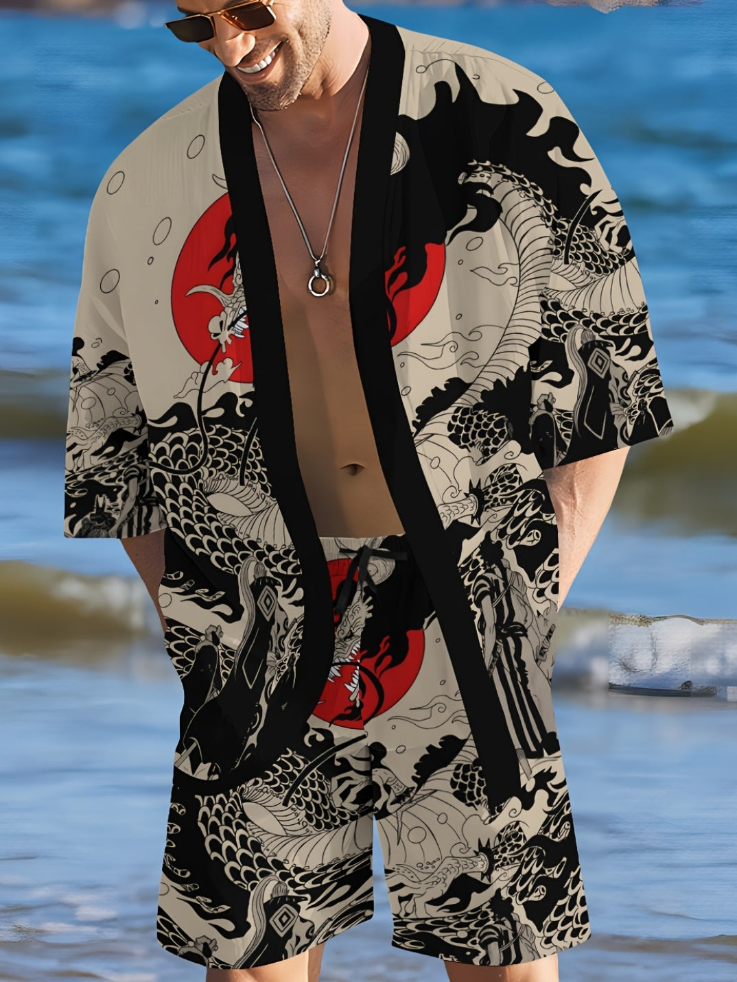 Men's Japanese Style Print Kimono Shorts Home Wear Casual Vacation Set