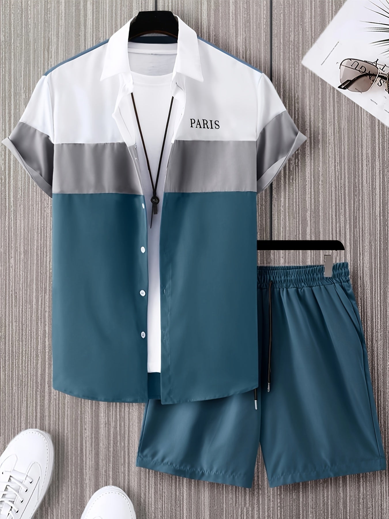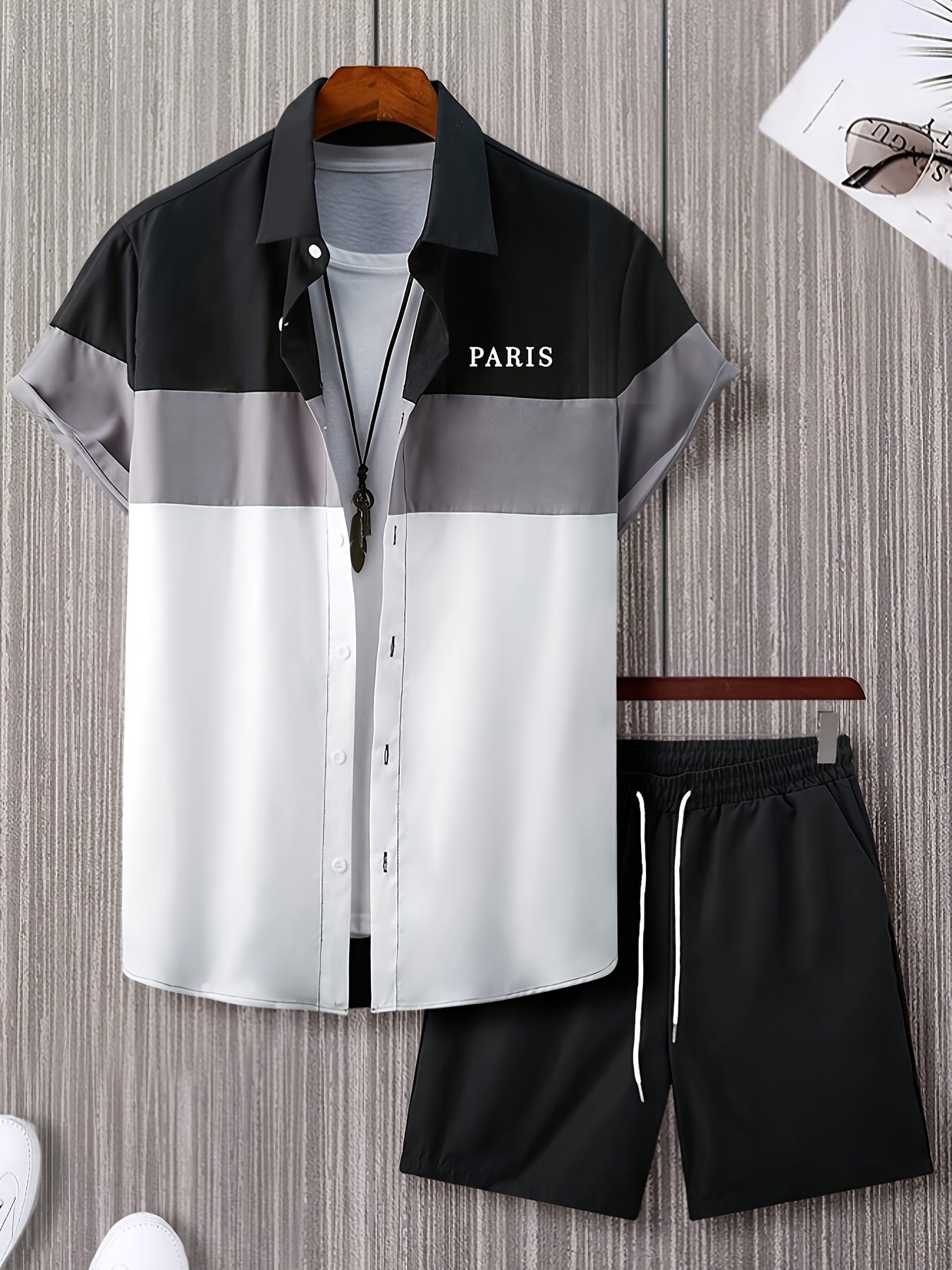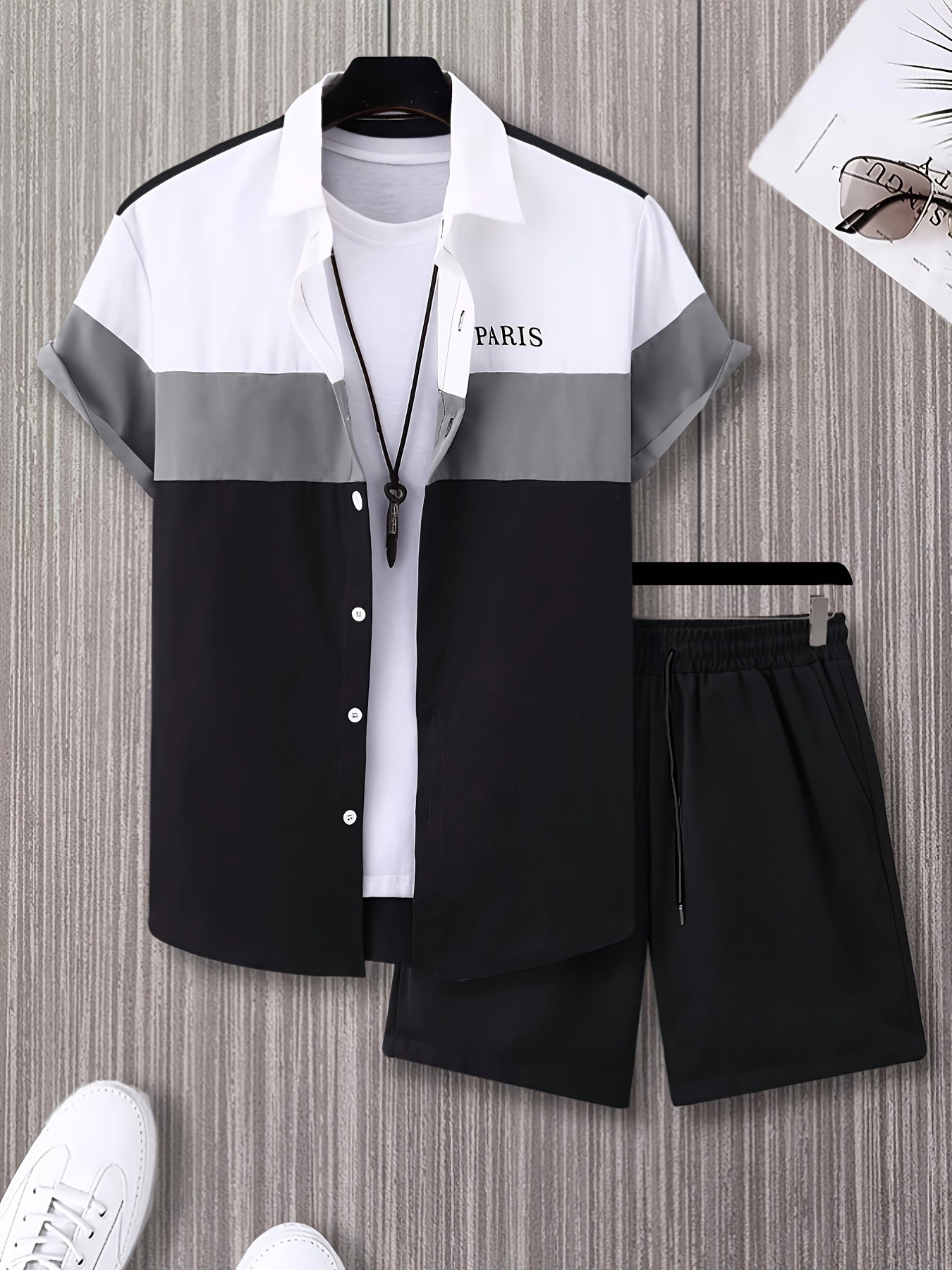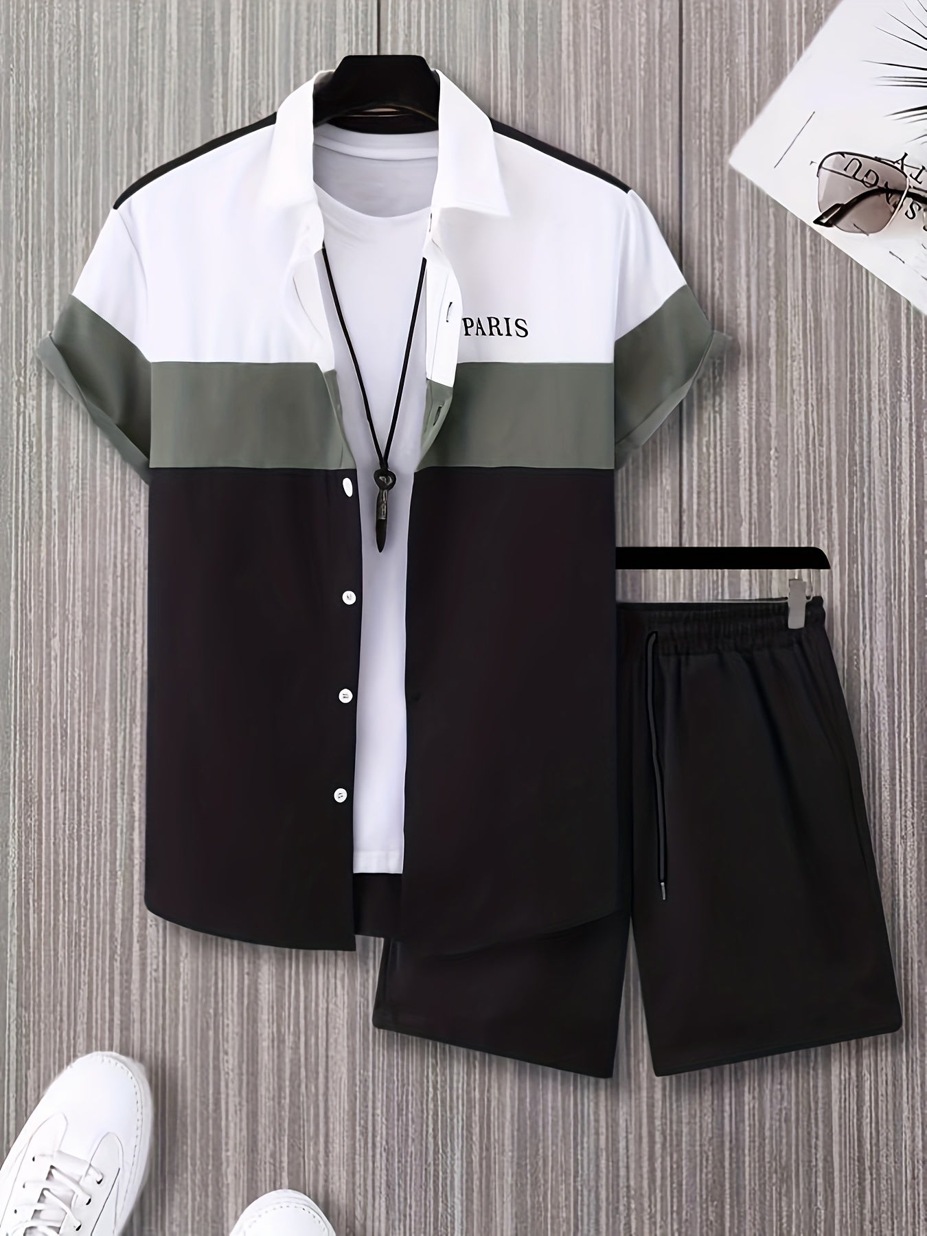 Men'S Letter Color Block Short Sleeve Shirt Shorts Casual Suit 2pcs Set