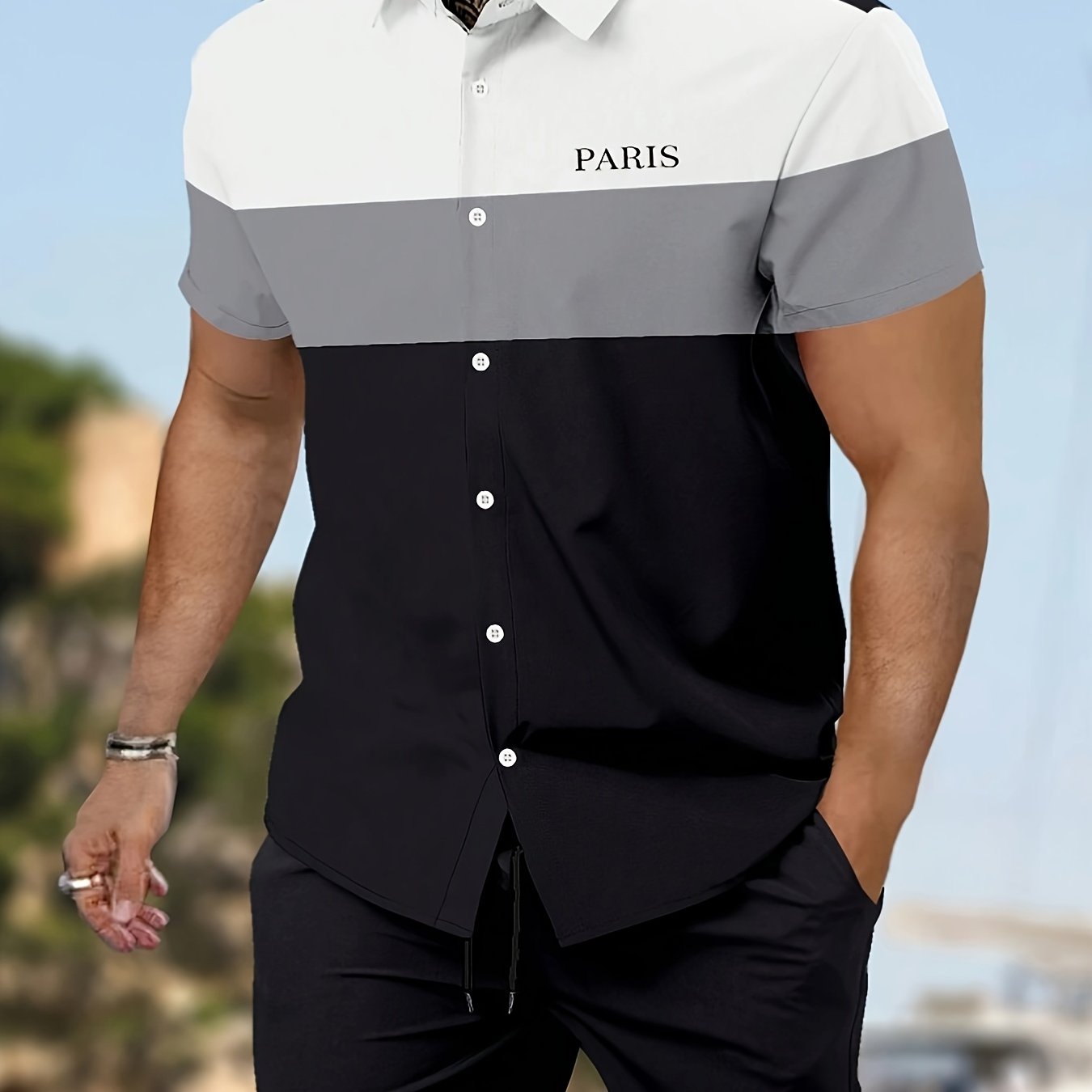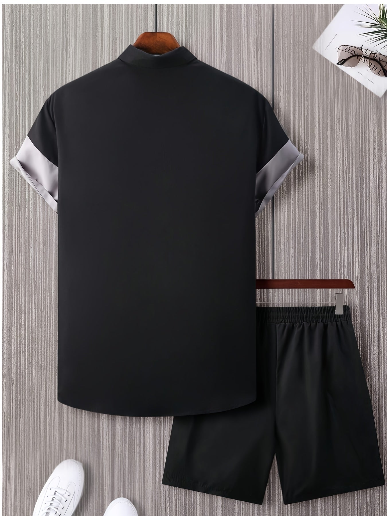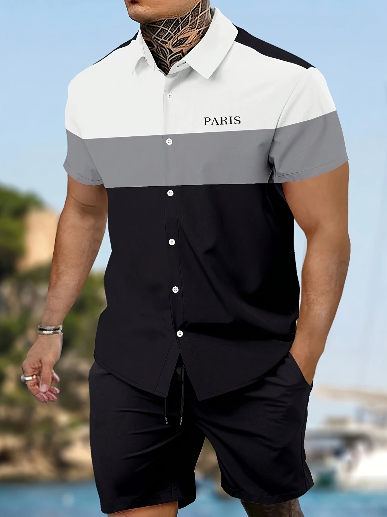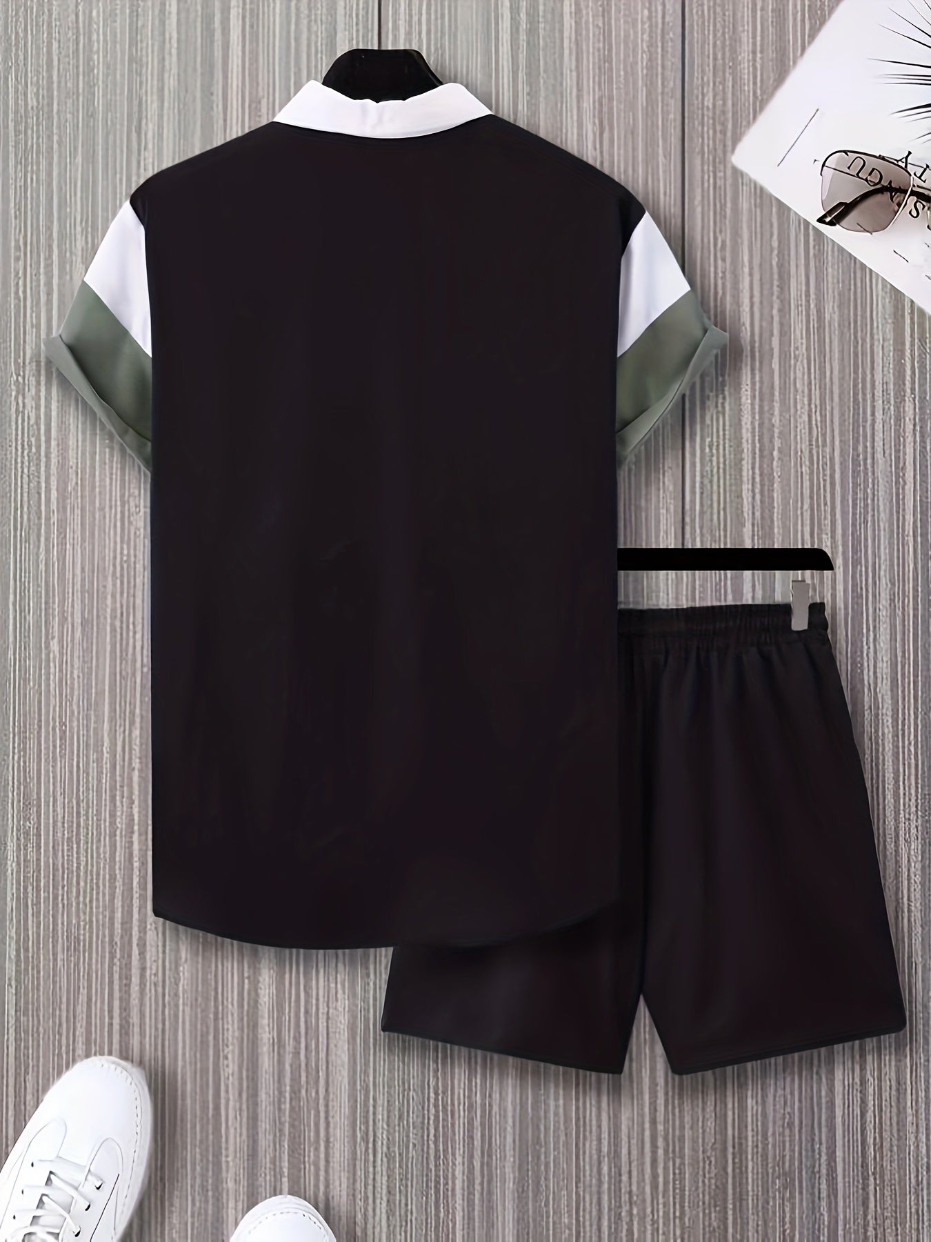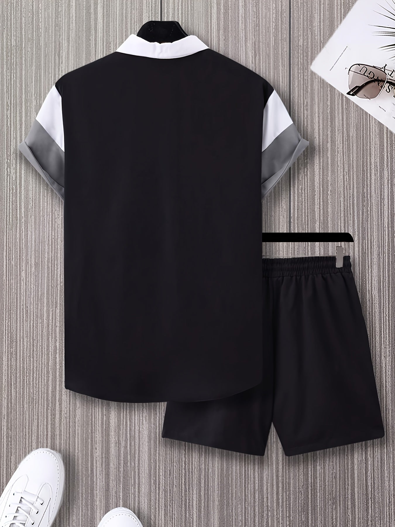 Men'S Letter Color Block Short Sleeve Shirt Shorts Casual Suit 2pcs Set