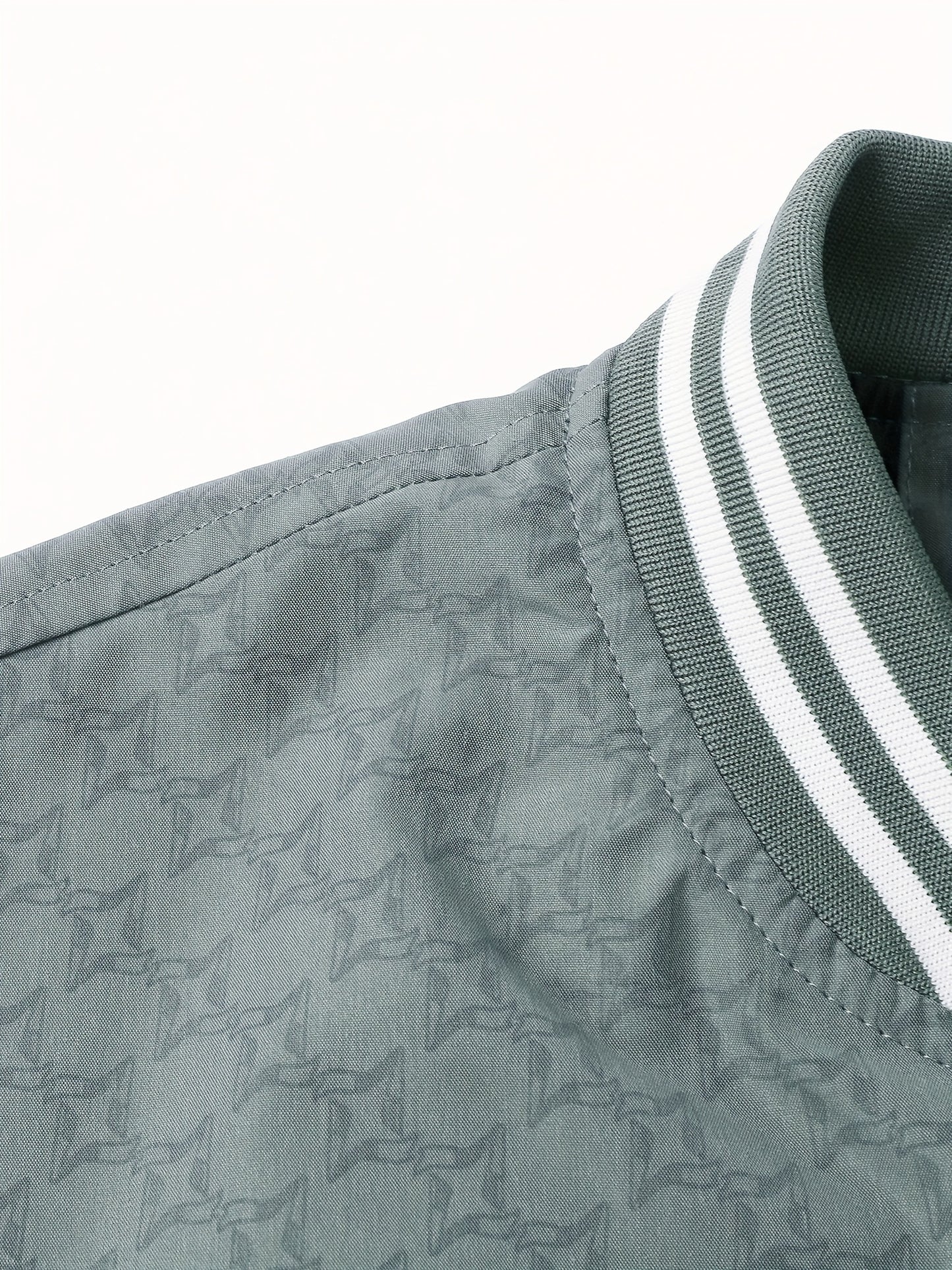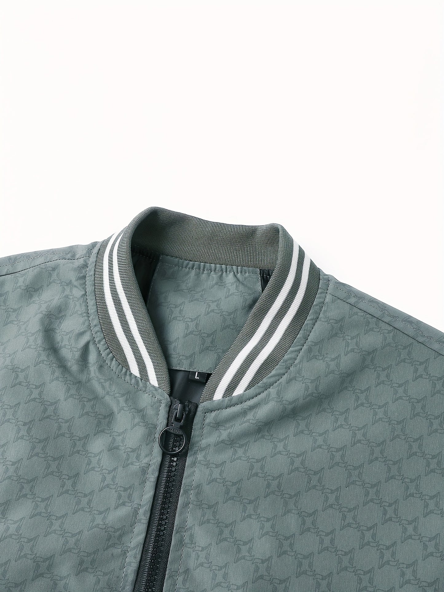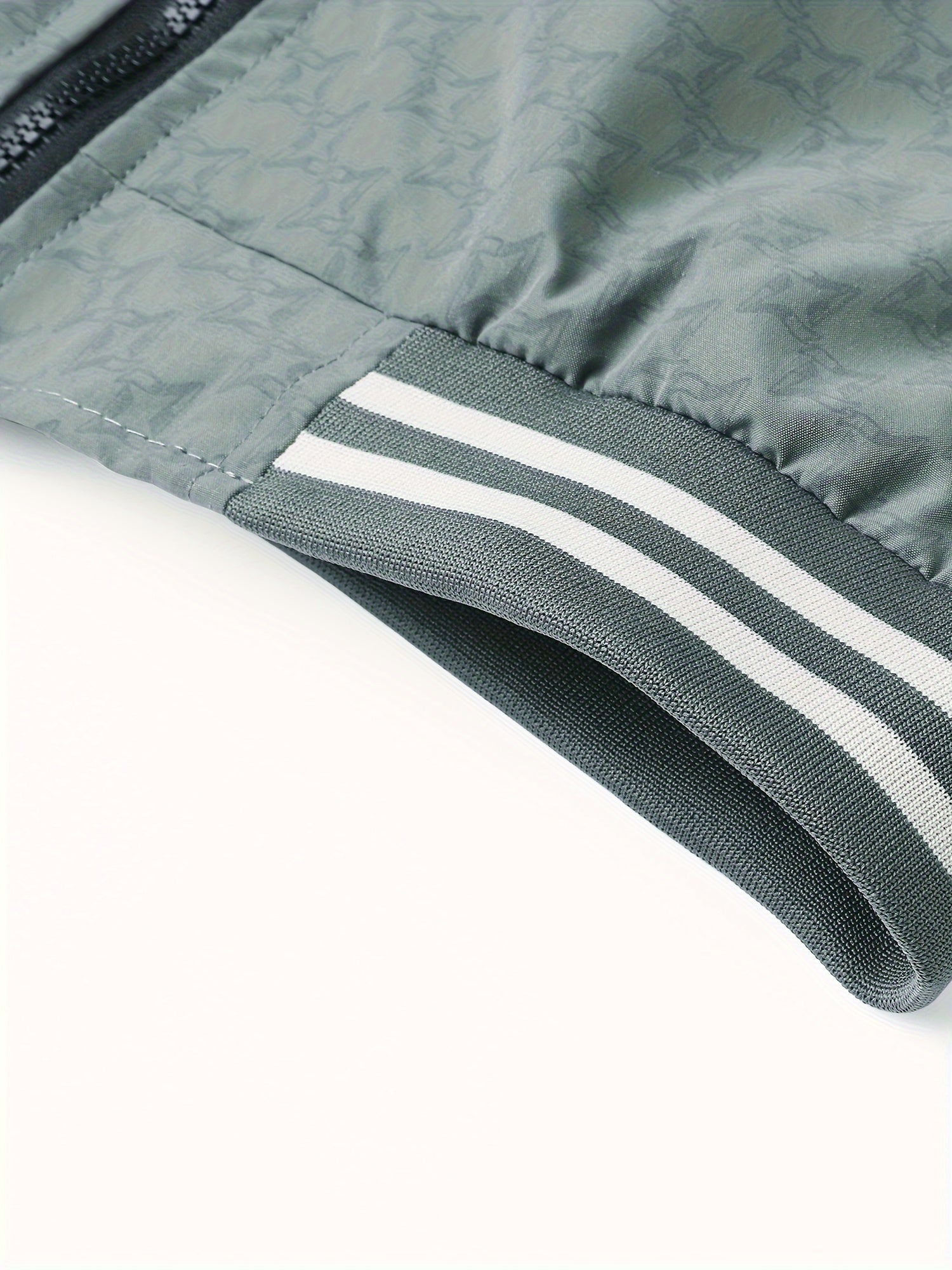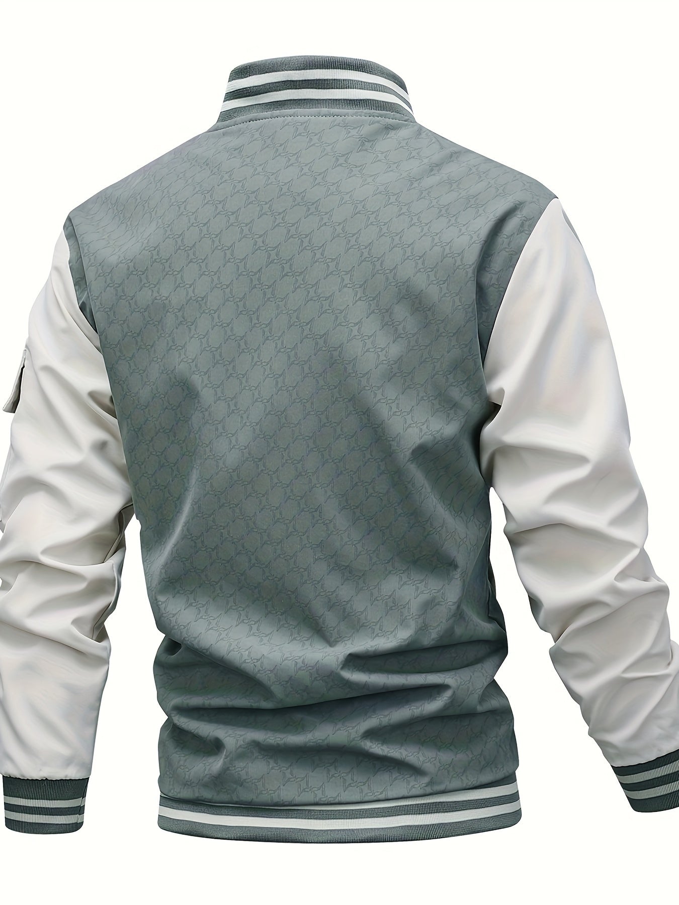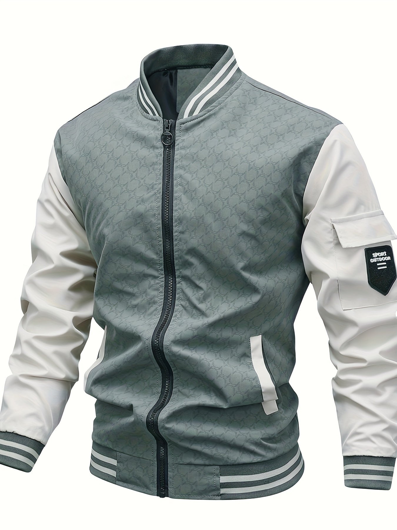 Men'S Lightweight Geometric Pattern Bomber Jacket - Casual Long Sleeve Zip-Up with Pockets, White & Gray, Polyester Lining, Perfect for Fall, Autumn Jacket
