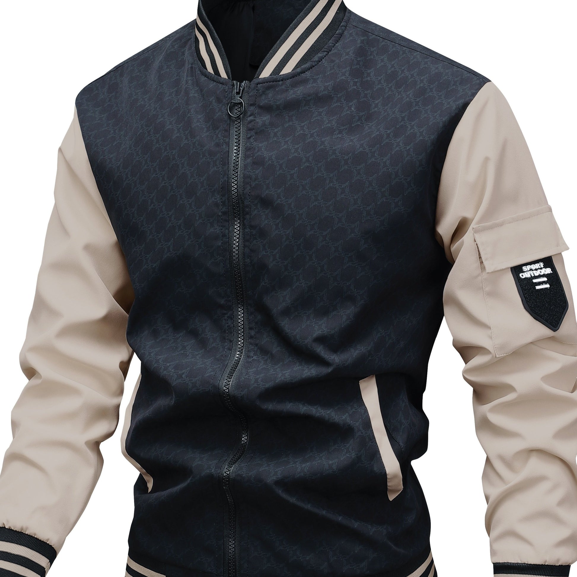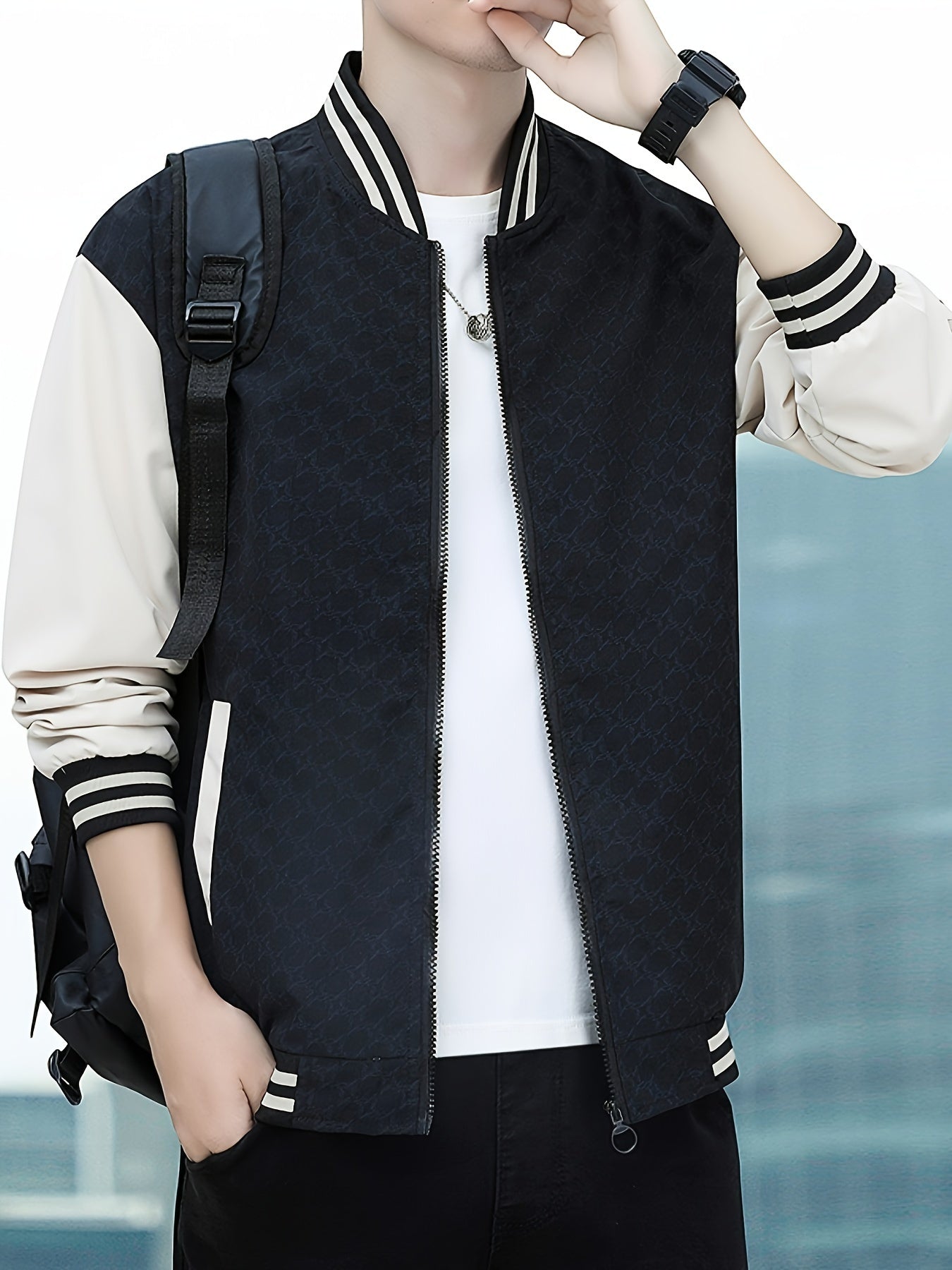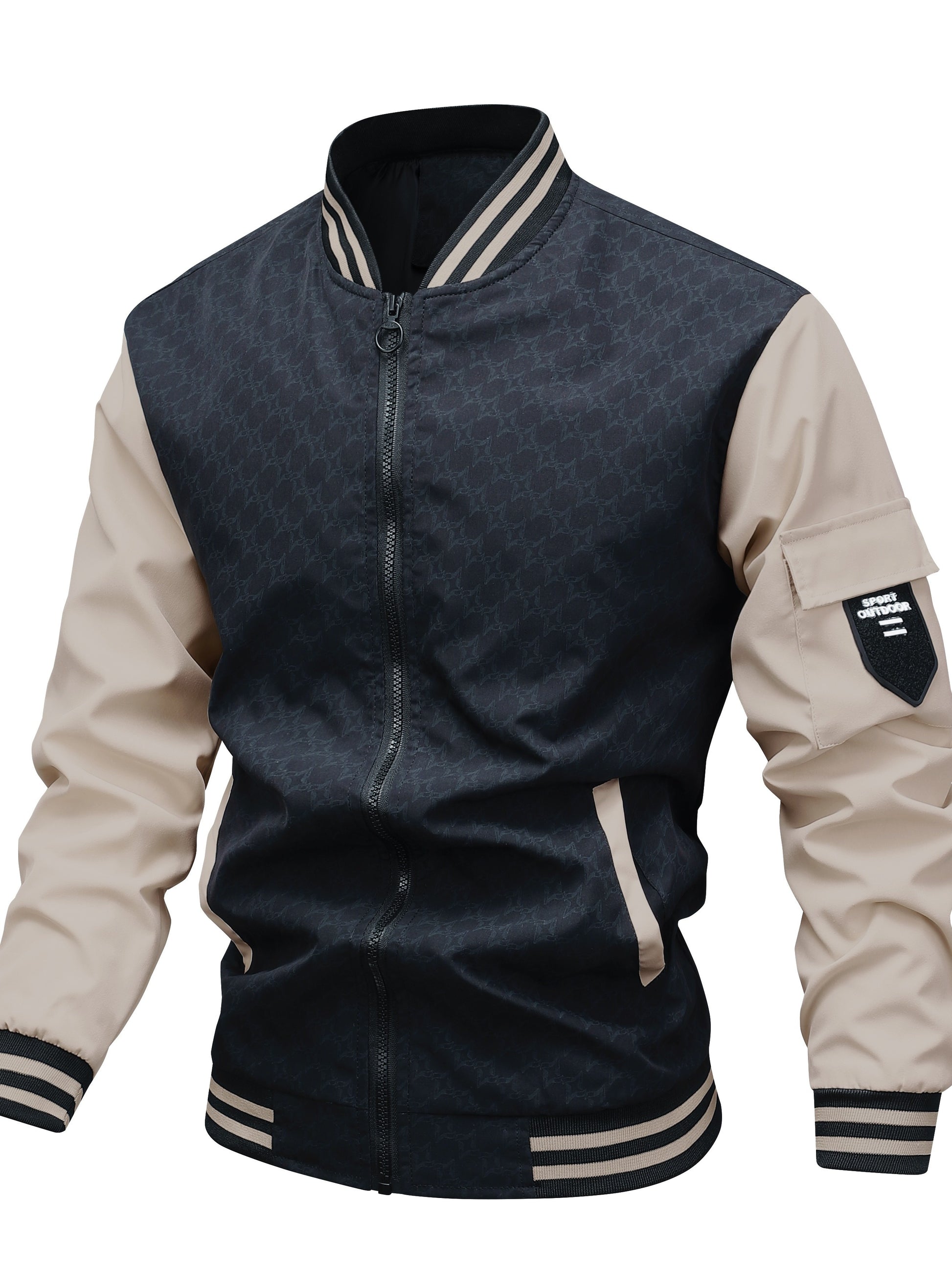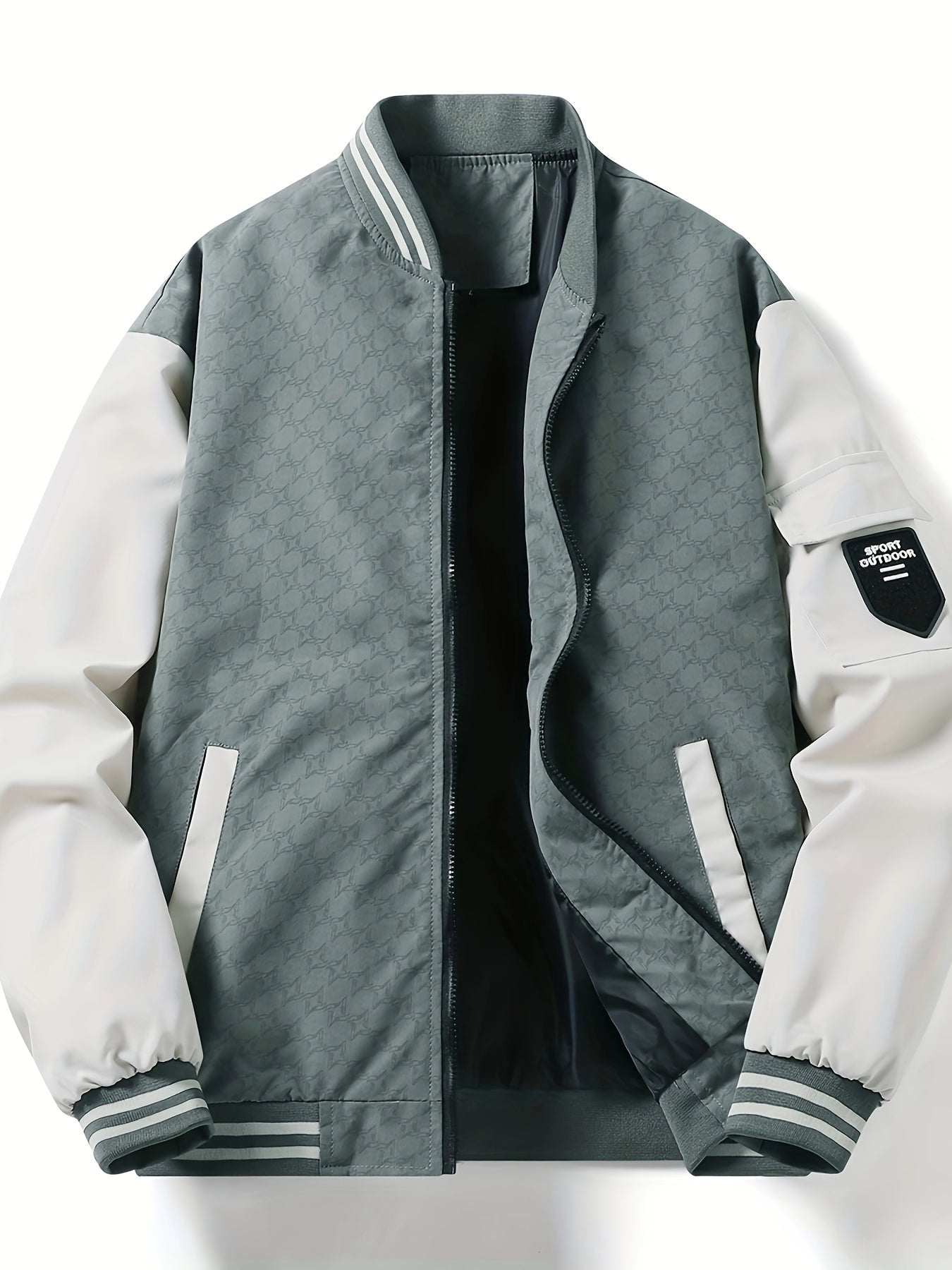 Men'S Lightweight Geometric Pattern Bomber Jacket - Casual Long Sleeve Zip-Up with Pockets, White & Gray, Polyester Lining, Perfect for Fall, Autumn Jacket