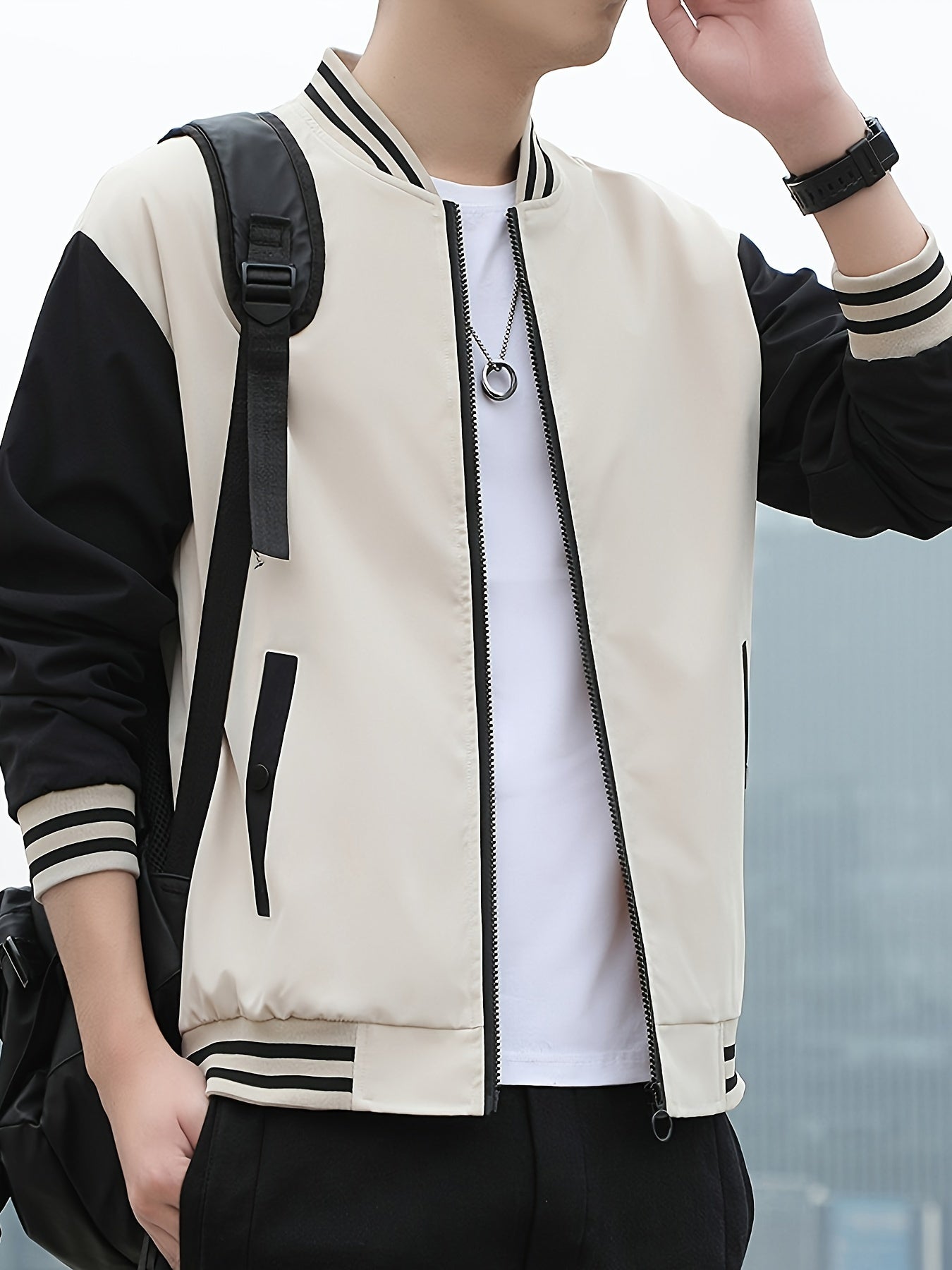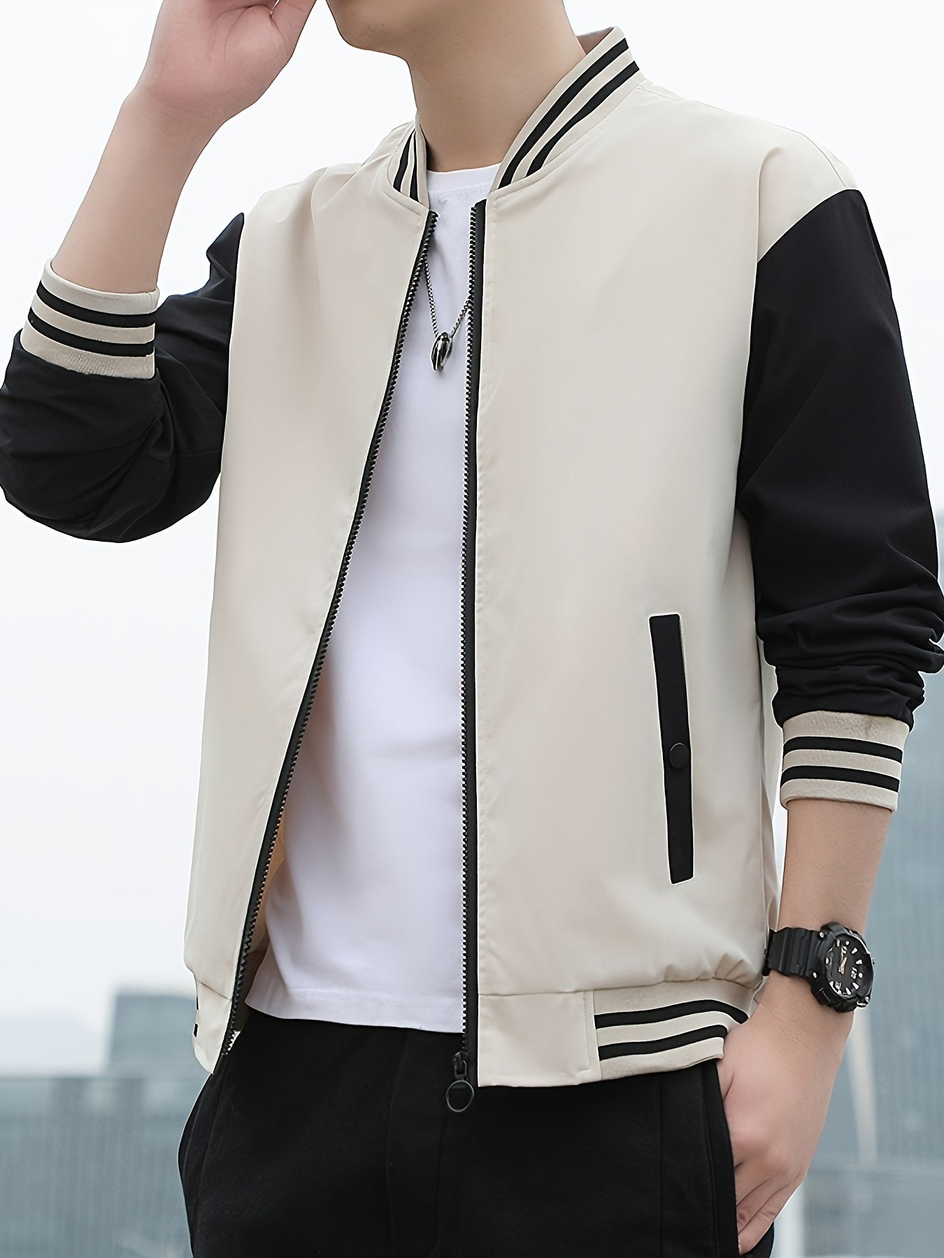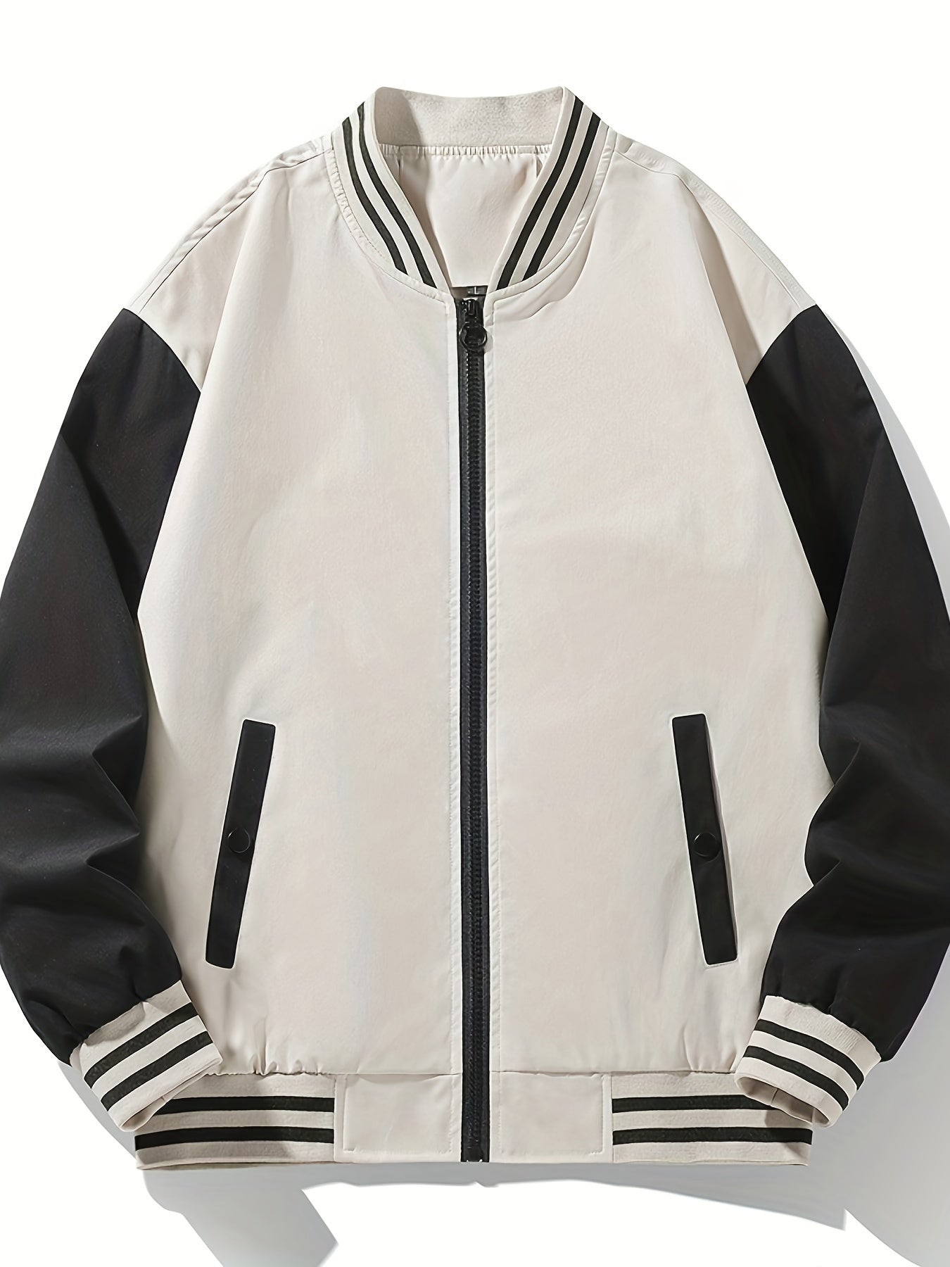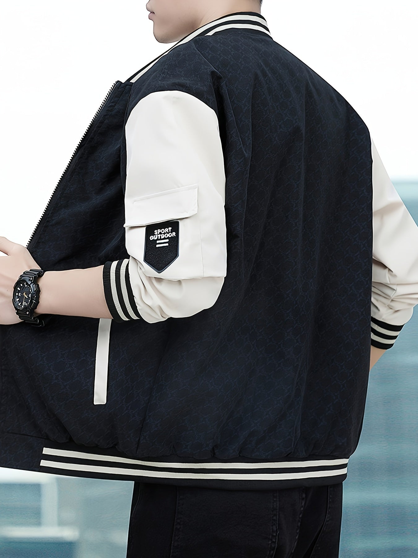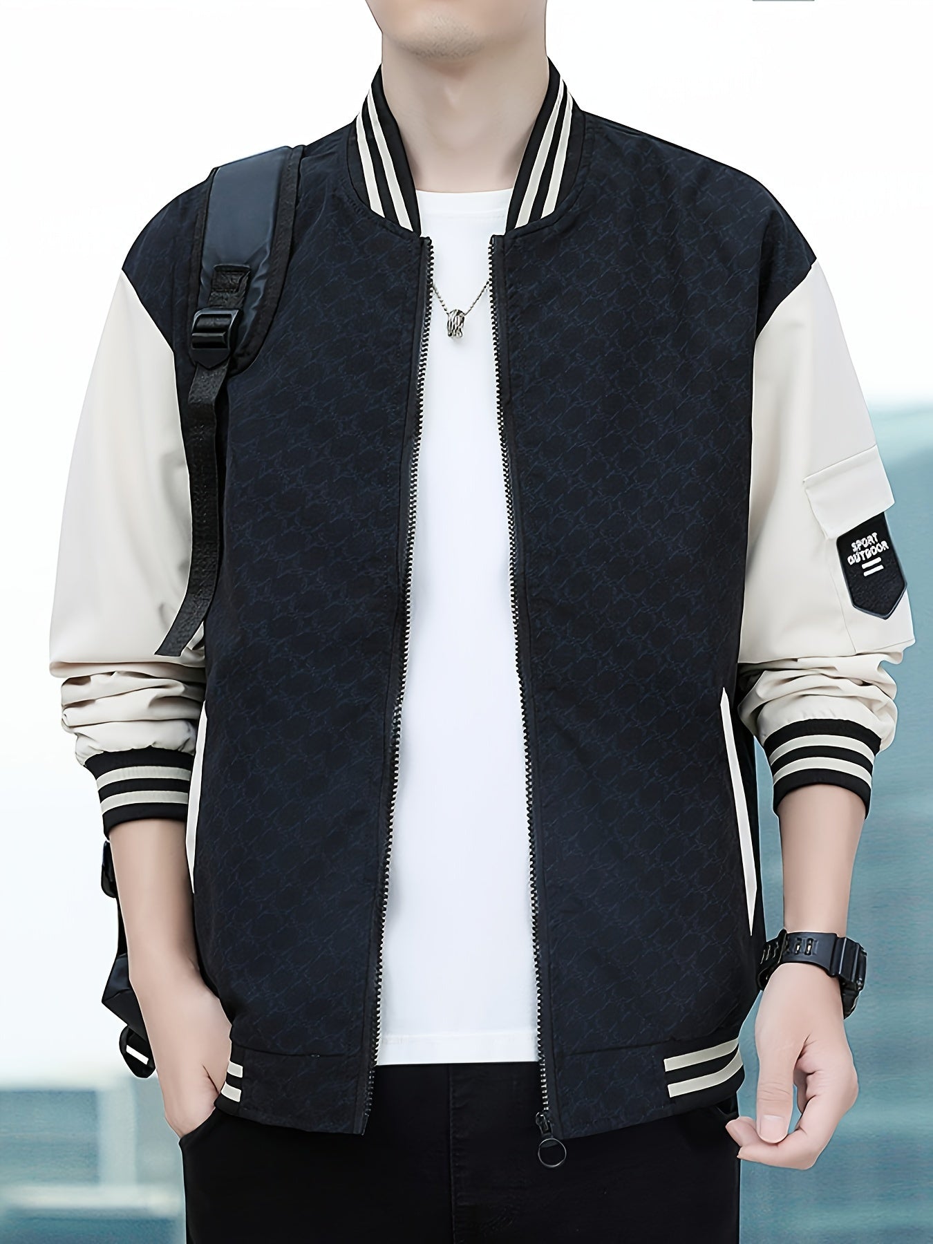 Men'S Lightweight Geometric Pattern Bomber Jacket - Casual Long Sleeve Zip-Up with Pockets, White & Gray, Polyester Lining, Perfect for Fall, Autumn Jacket
